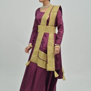 Immerse yourself in elegance and grace with the Anarkali Style Plum Flared Anarkali with Golden Belt. Crafted to perfection, this enchanting attire is designed to strike a perfect balance between tradition and modernity. The rich plum shade of the Anarkali stands out beautifully, making it a perfect choice for festive occasions, weddings, or any special celebration where you want to turn heads.