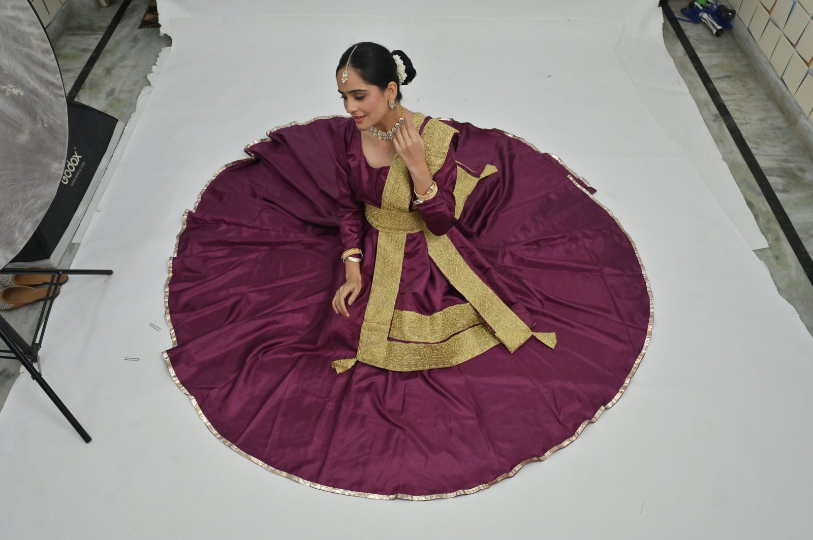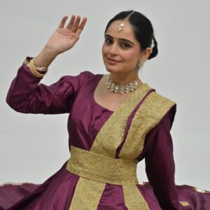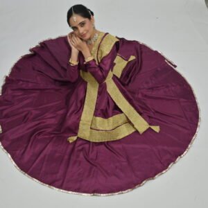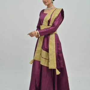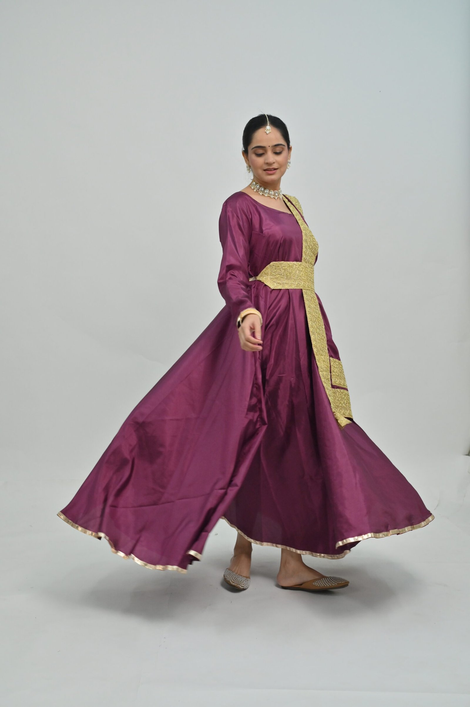 Plum Flared Anarkali with Golden Belt & Dupatta – Perfect for Classical Dance