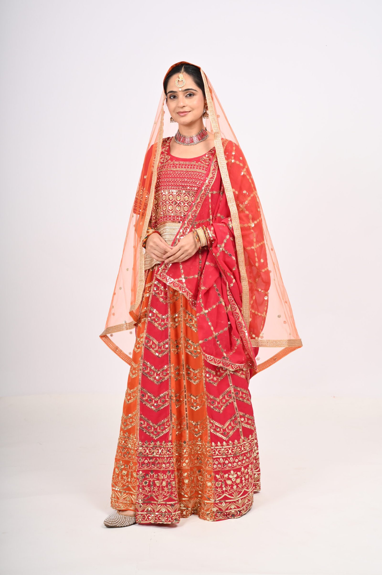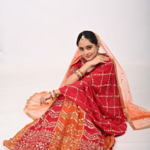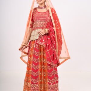 Dual-tone lehenga in deep red & orange with intricate zari & sequin embroidery