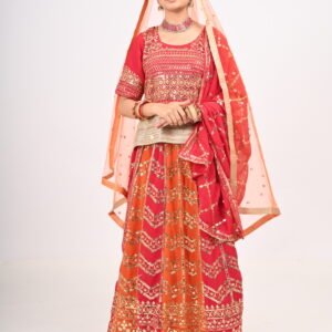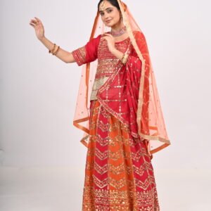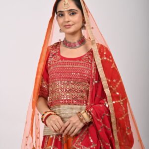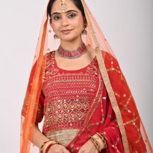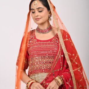Red-Orange Embroidered Bridal Lehenga with Heavy Zari Work, Blouse & Net Dupatta