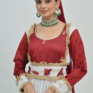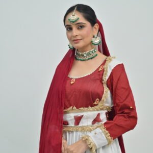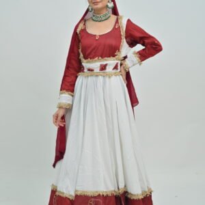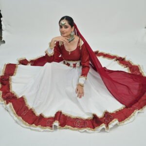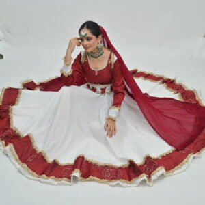 Beyond its aesthetic charm, the Anarkali Style White Flared Lehenga with Maroon Border offers versatility that complements a range of settings and styling preferences. Pair it with traditional jewelry for a classic look or mix modern accessories to infuse contemporary flair. Whether it’s a family function, festive celebration, or a glamorous wedding, this lehenga ensures you radiate confidence and poise.