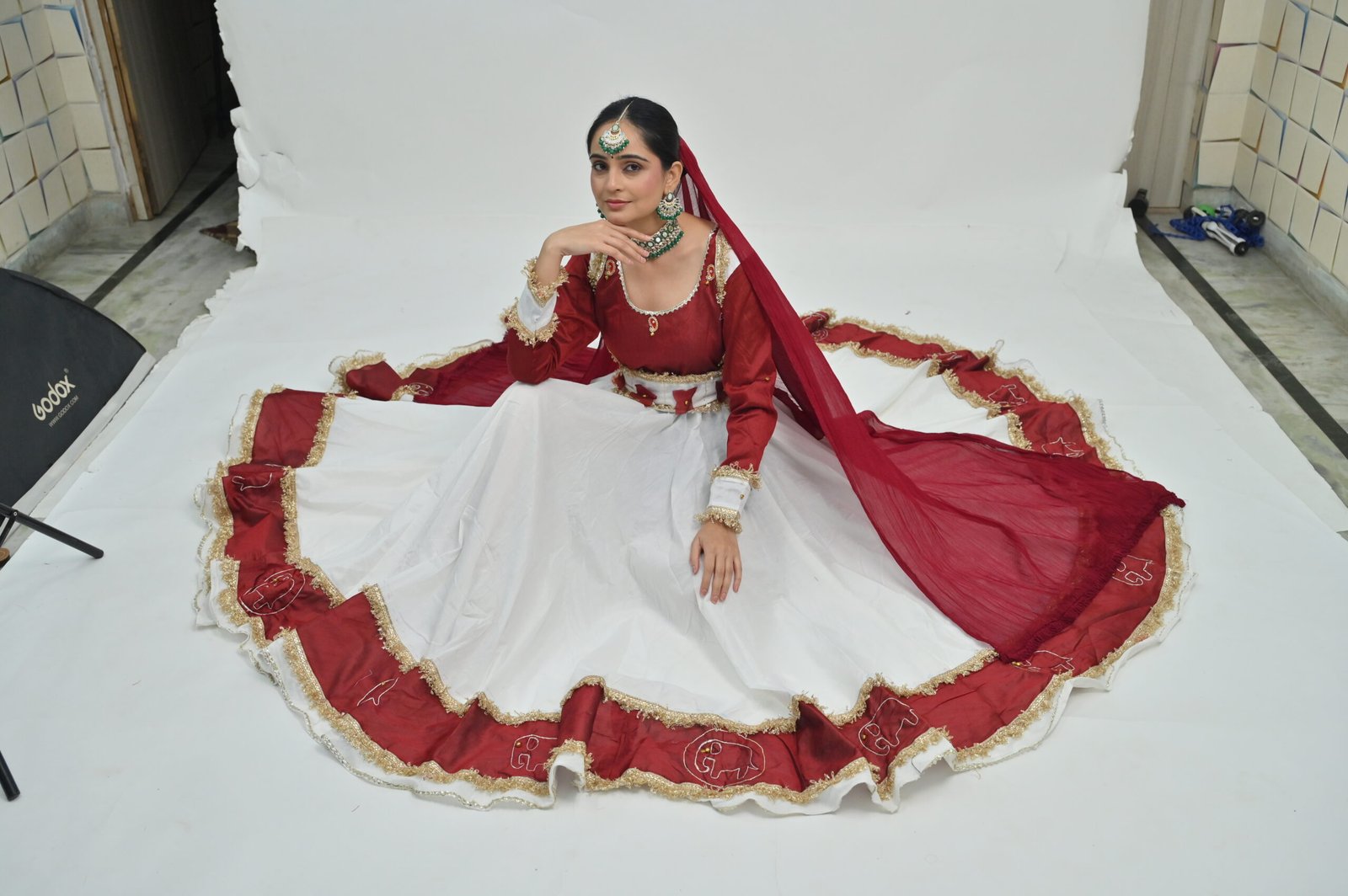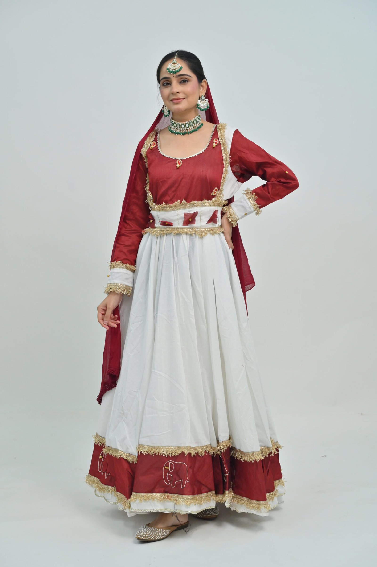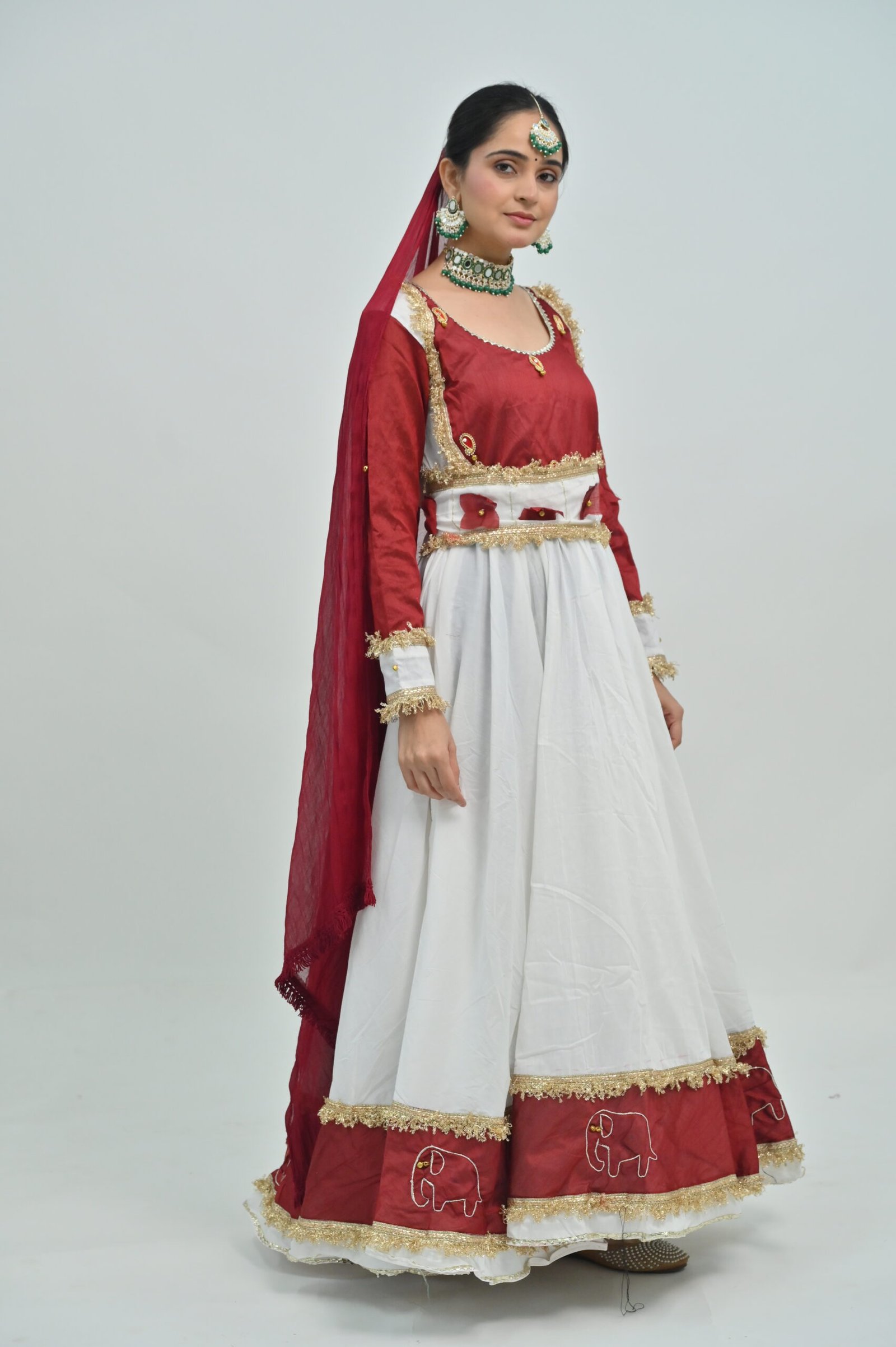 White Flared Lehenga with Maroon Border & Dupatta – Embellished Classical Dance Costume