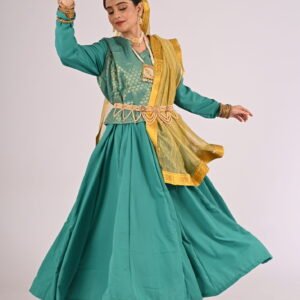 The Green Kathak Anarkali is designed to offer a flattering silhouette while ensuring absolute comfort. The flowy, floor-length Anarkali features tasteful pleats and intricate detailing that celebrate the rich heritage of Indian wear. The accompanying brocade jacket adds a regal charm, with its ornate golden patterns offering a stunning contrast to the lush green fabric of the Anarkali. Paired with a golden dupatta that shimmers with understated elegance, this outfit is perfect for weddings, festive occasions, or cultural performances.