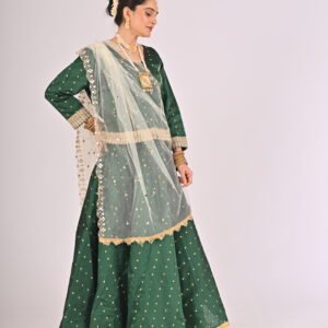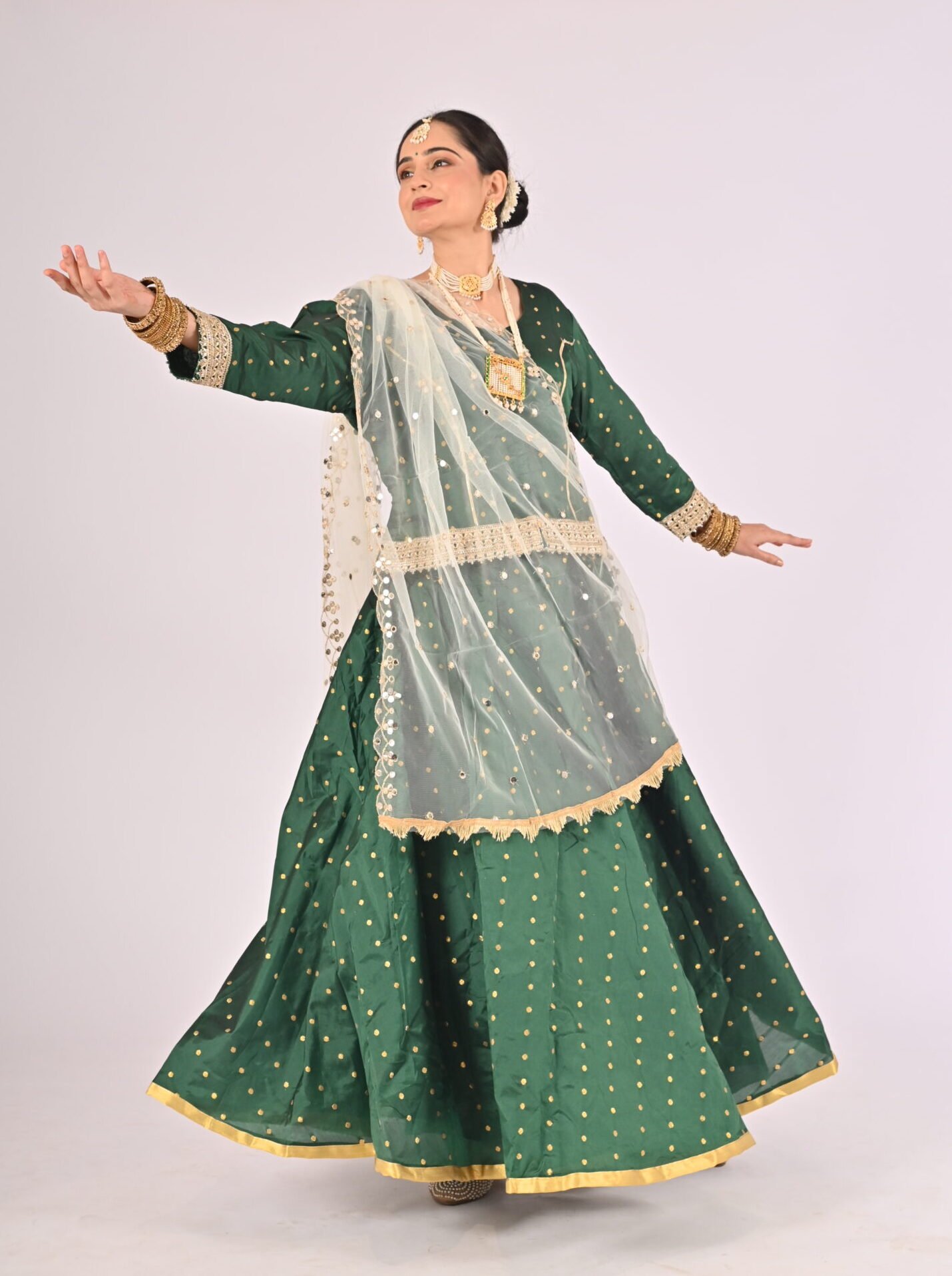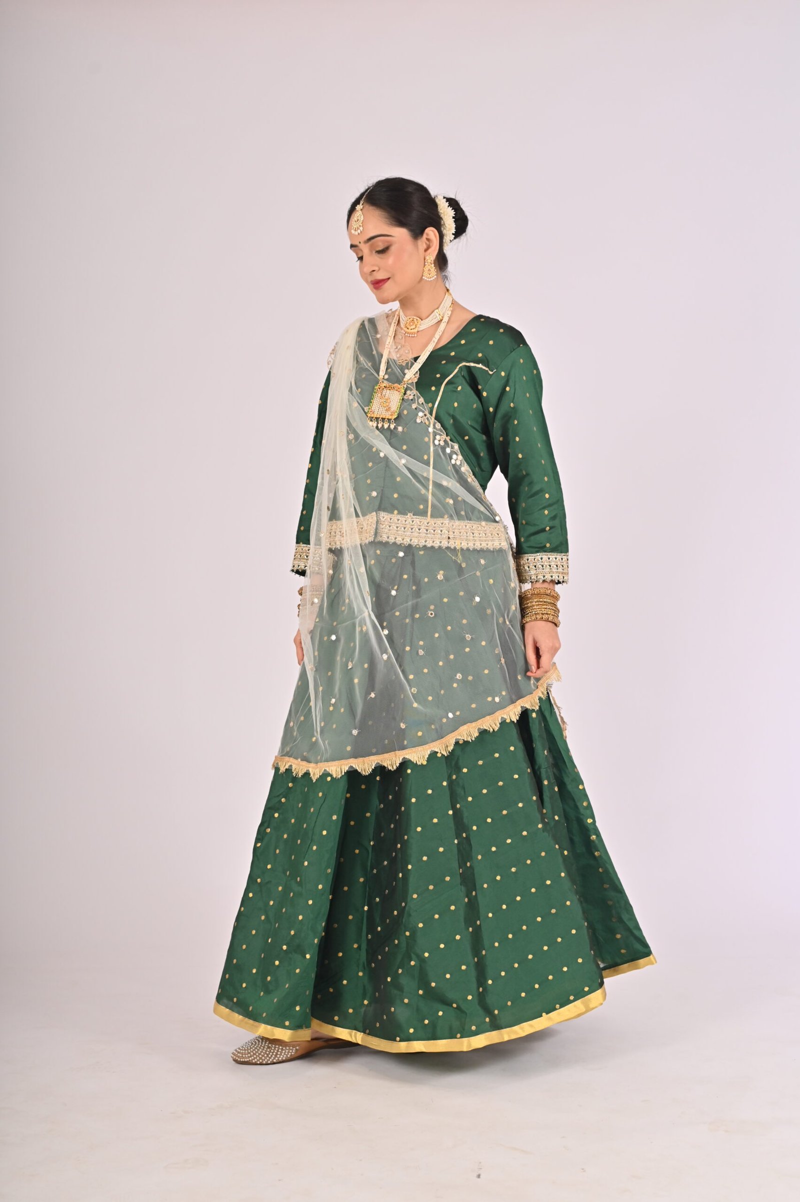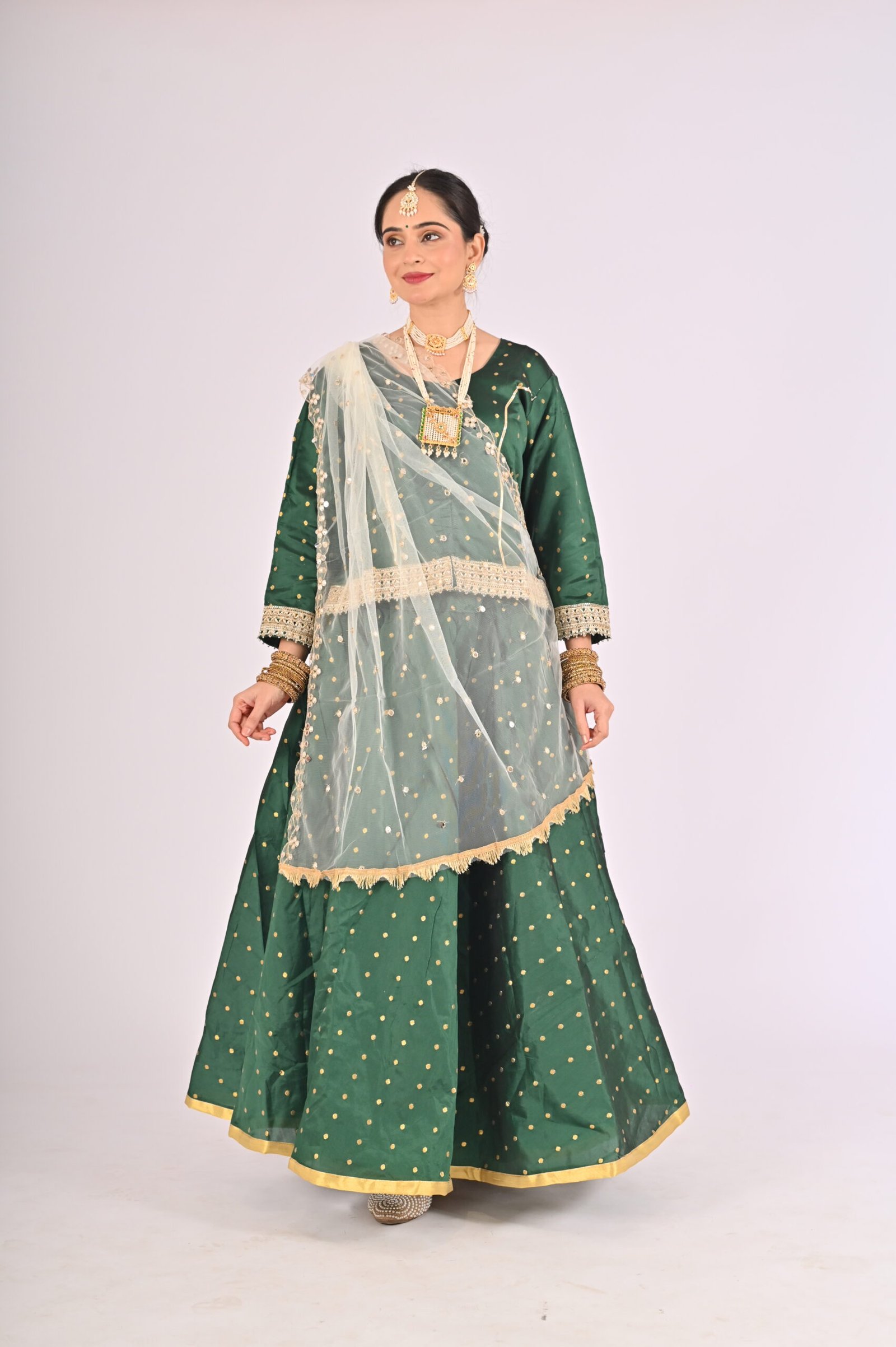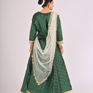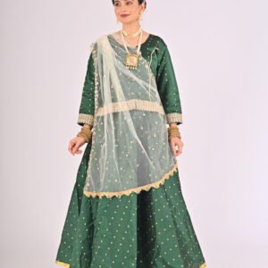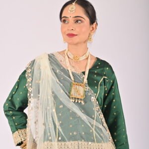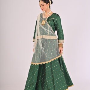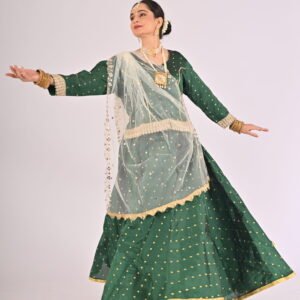 Built with premium quality materials, this Green Kathak Lehenga set ensures that you stay comfortable without compromising style. The breathable fabric allows easy movement, making it the perfect outfit for performances, weddings, or festivities requiring grace and elegance. The ensemble is versatile and carefully tailored to provide a flattering fit, enhancing your natural beauty while maintaining ease of wear.