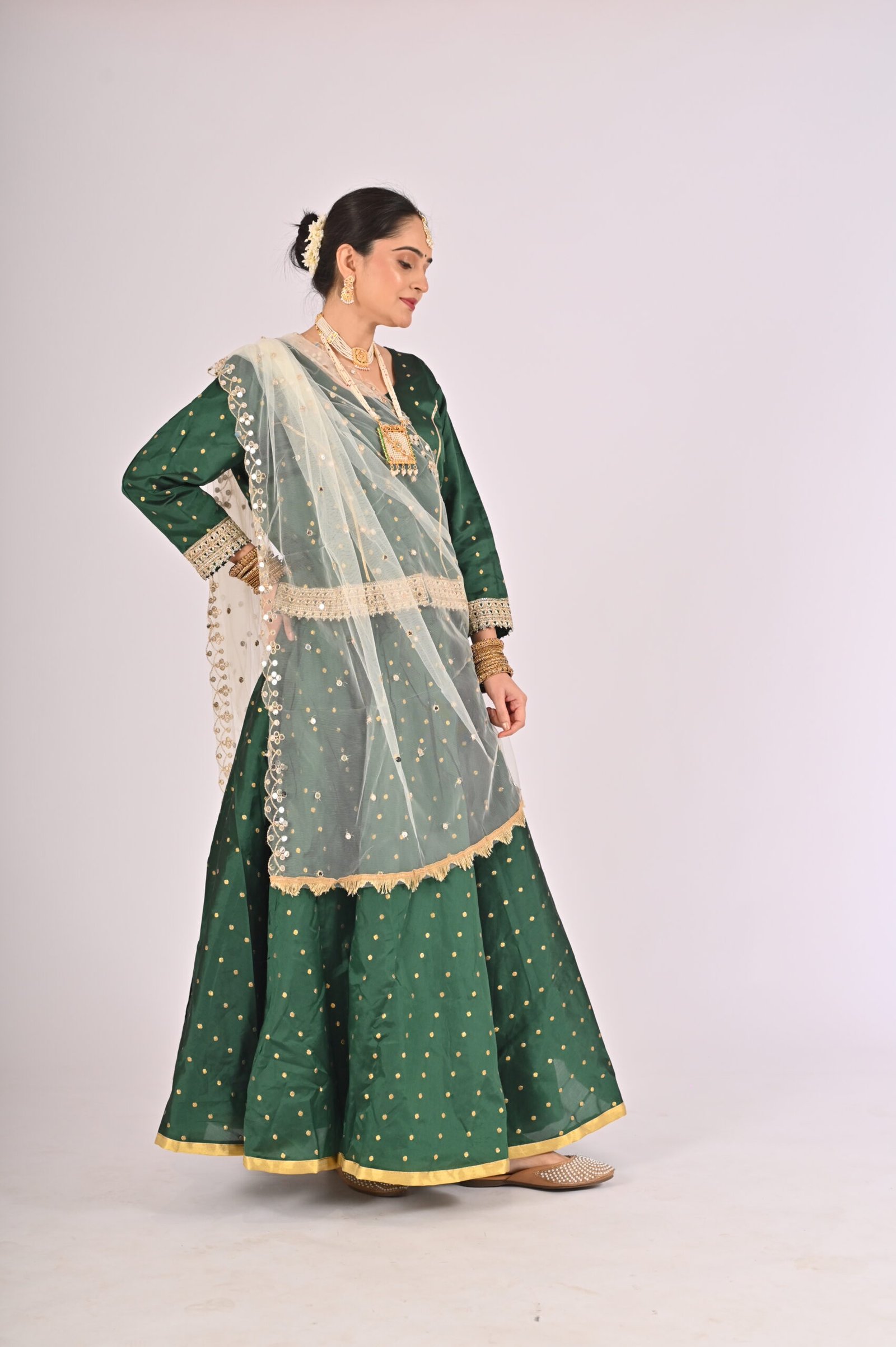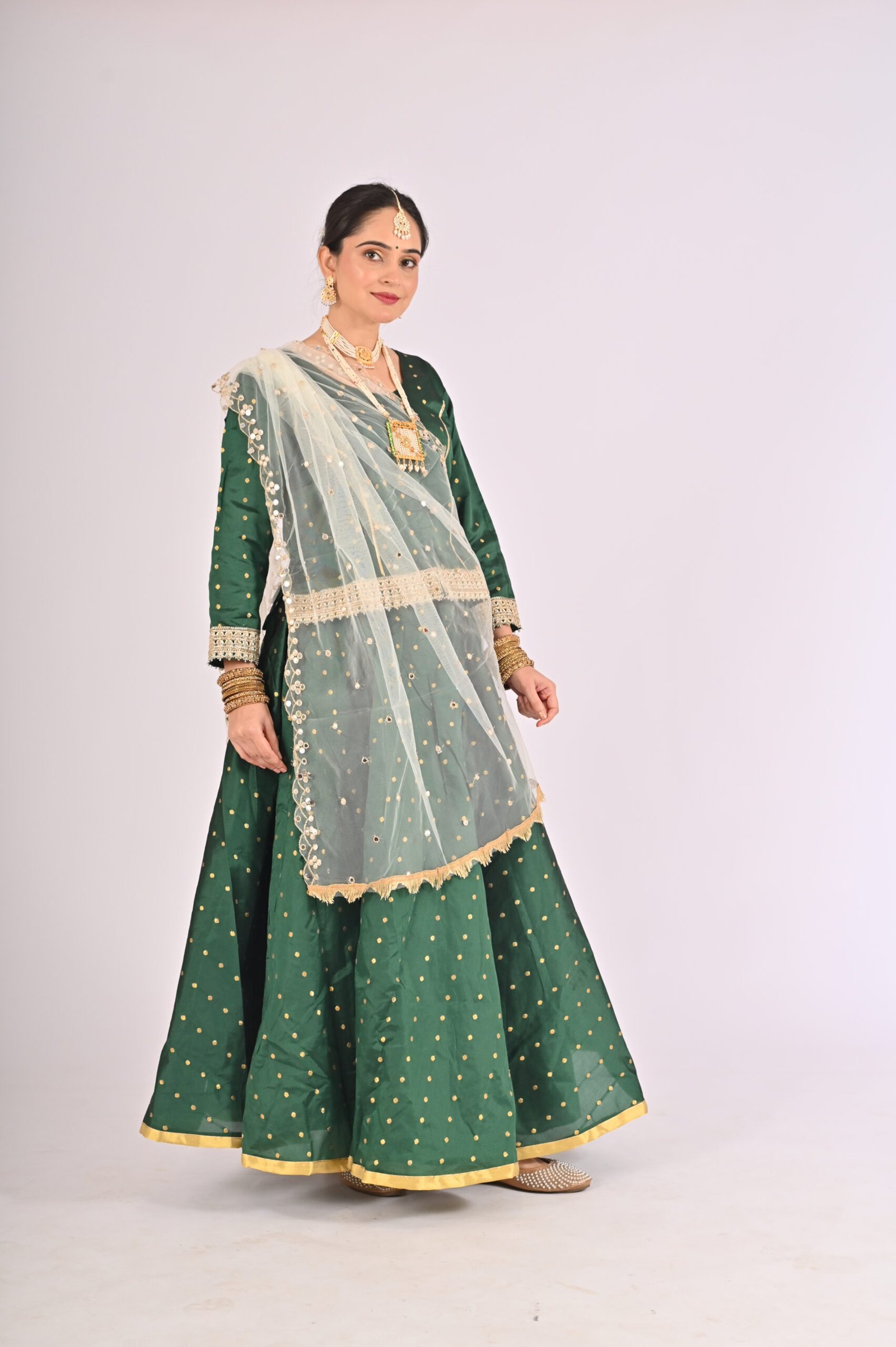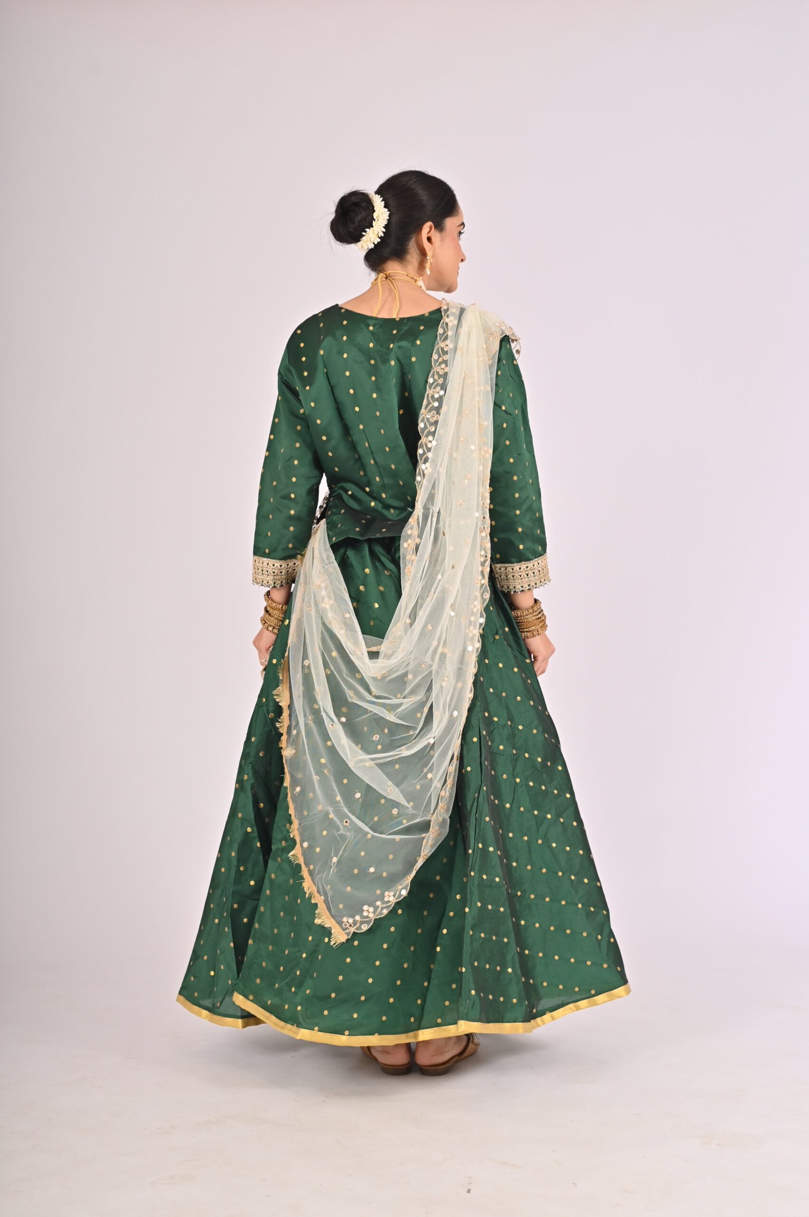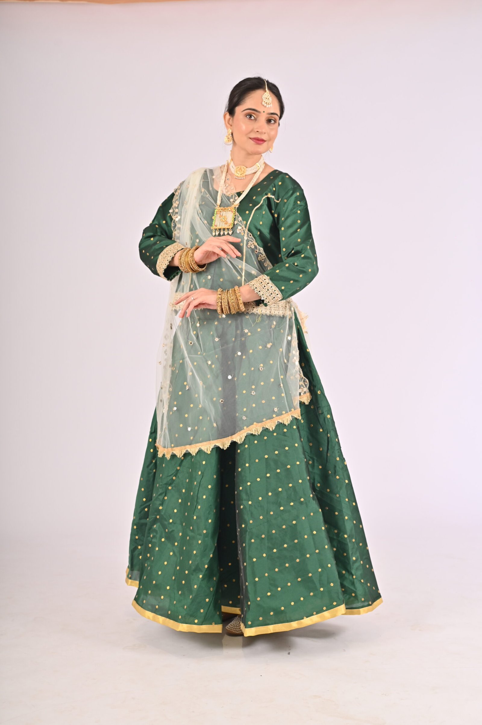 Built with premium quality materials, this Green Kathak Lehenga set ensures that you stay comfortable without compromising style. The breathable fabric allows easy movement, making it the perfect outfit for performances, weddings, or festivities requiring grace and elegance. The ensemble is versatile and carefully tailored to provide a flattering fit, enhancing your natural beauty while maintaining ease of wear.