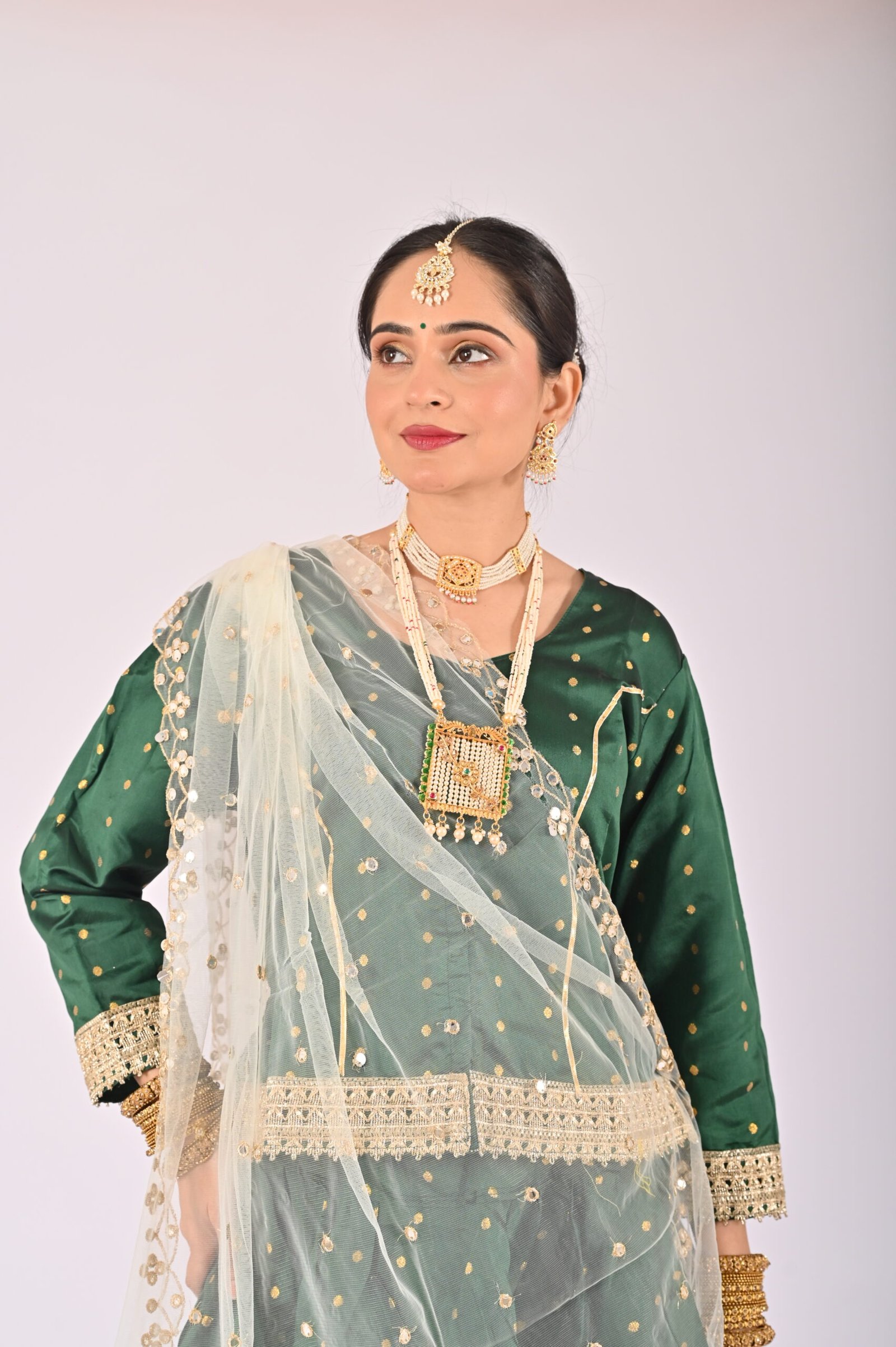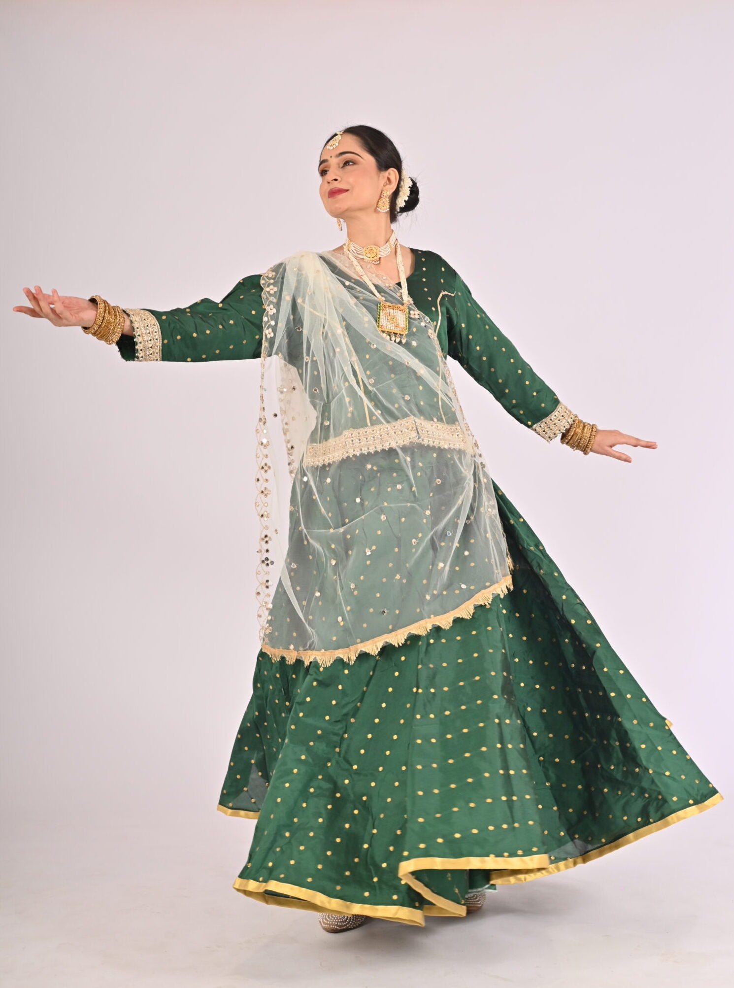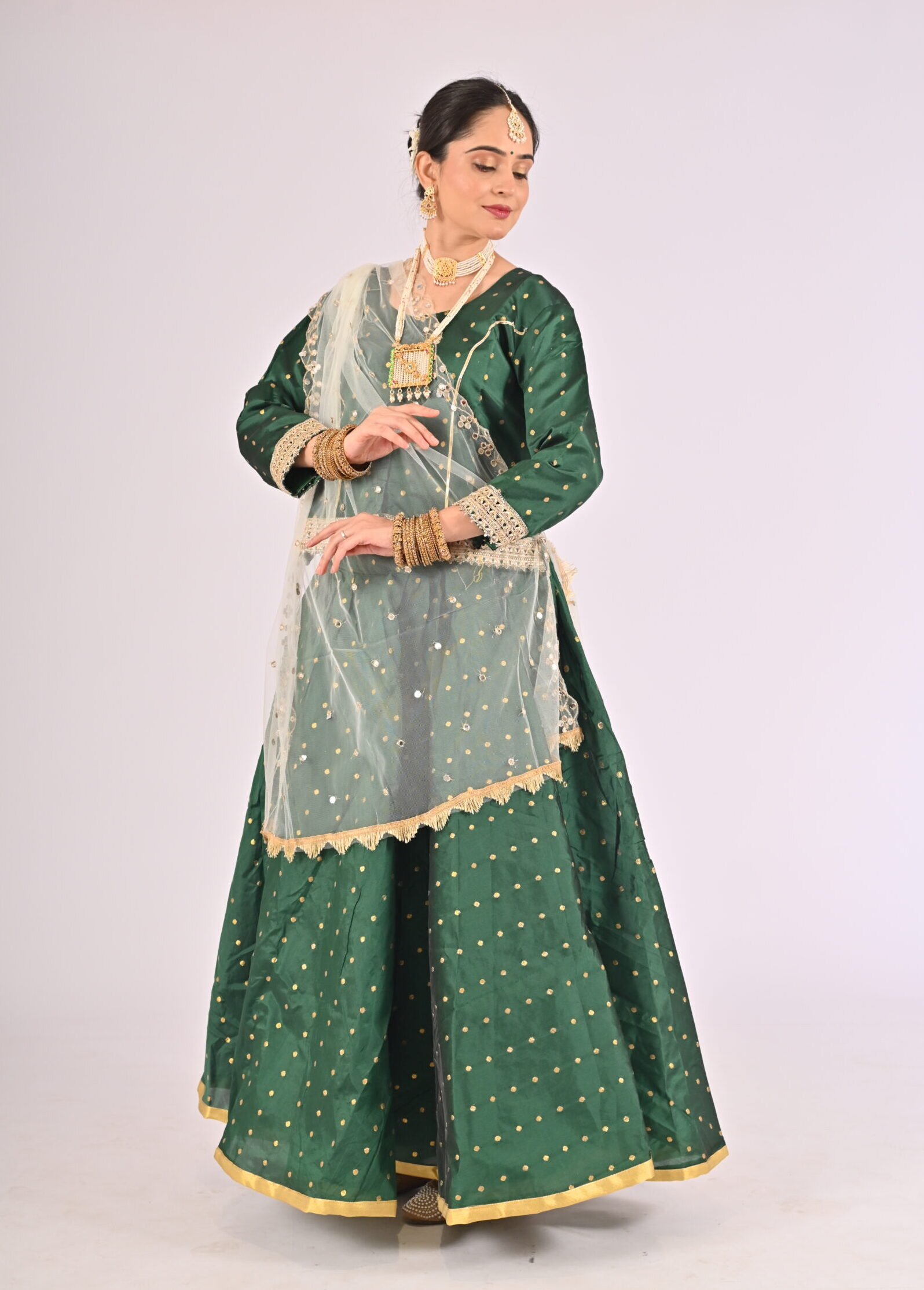 Built with premium quality materials, this Green Kathak Lehenga set ensures that you stay comfortable without compromising style. The breathable fabric allows easy movement, making it the perfect outfit for performances, weddings, or festivities requiring grace and elegance. The ensemble is versatile and carefully tailored to provide a flattering fit, enhancing your natural beauty while maintaining ease of wear.