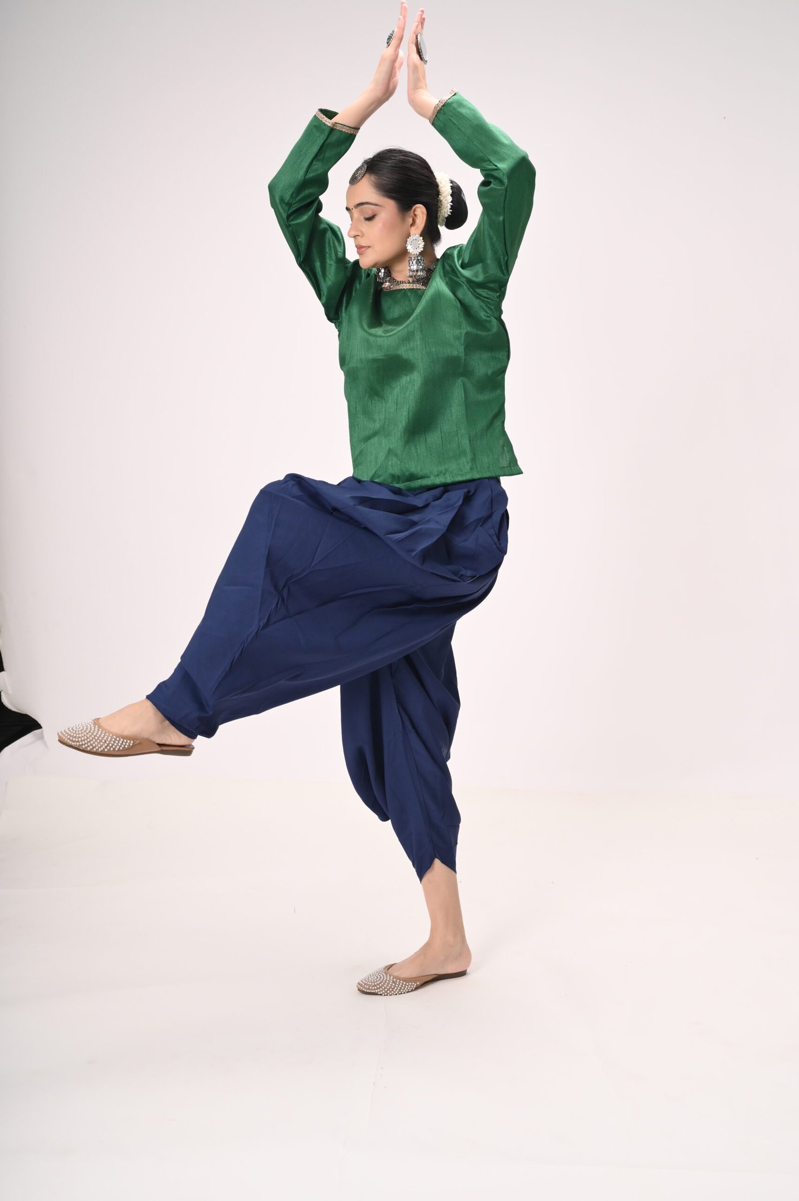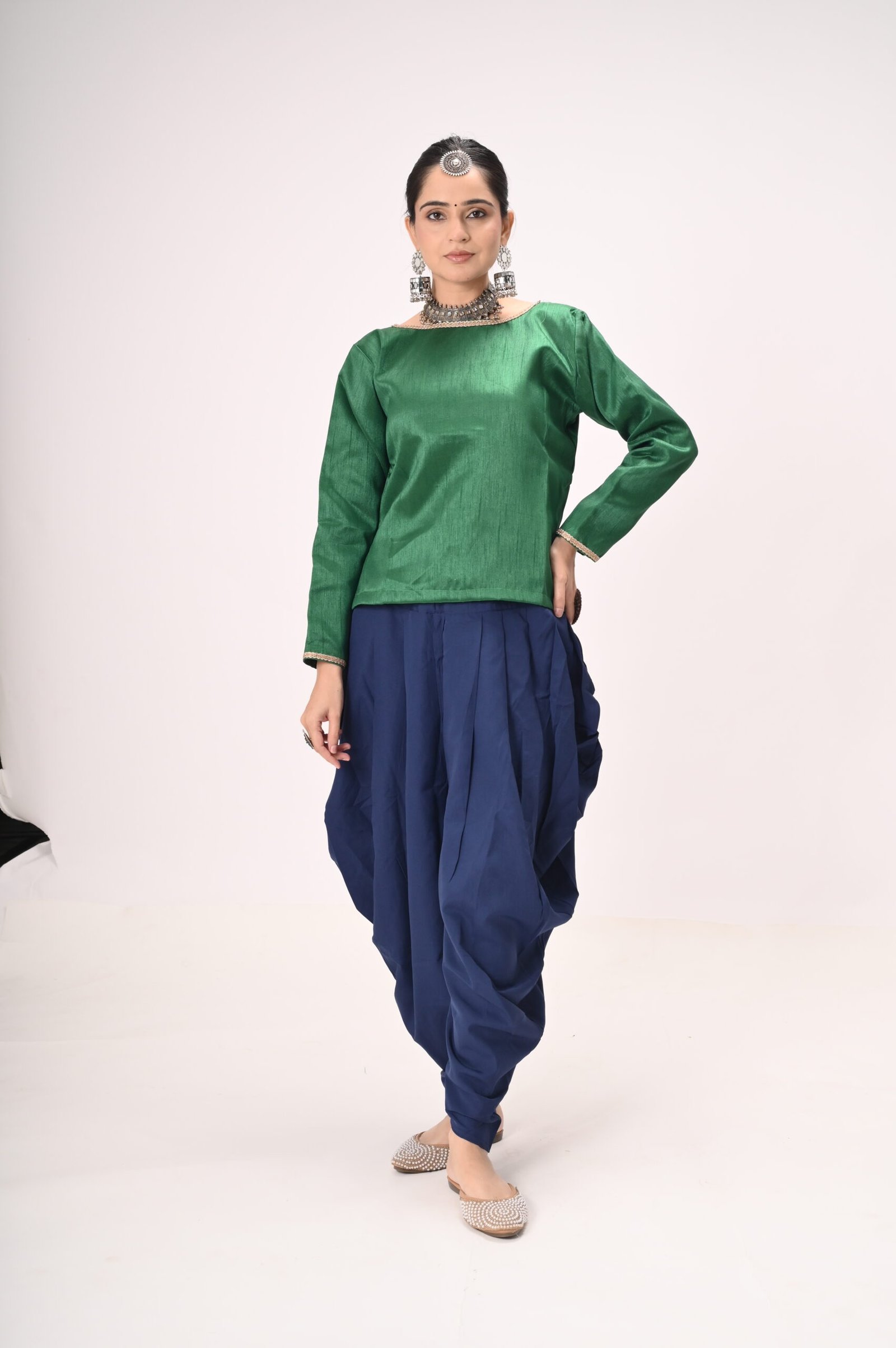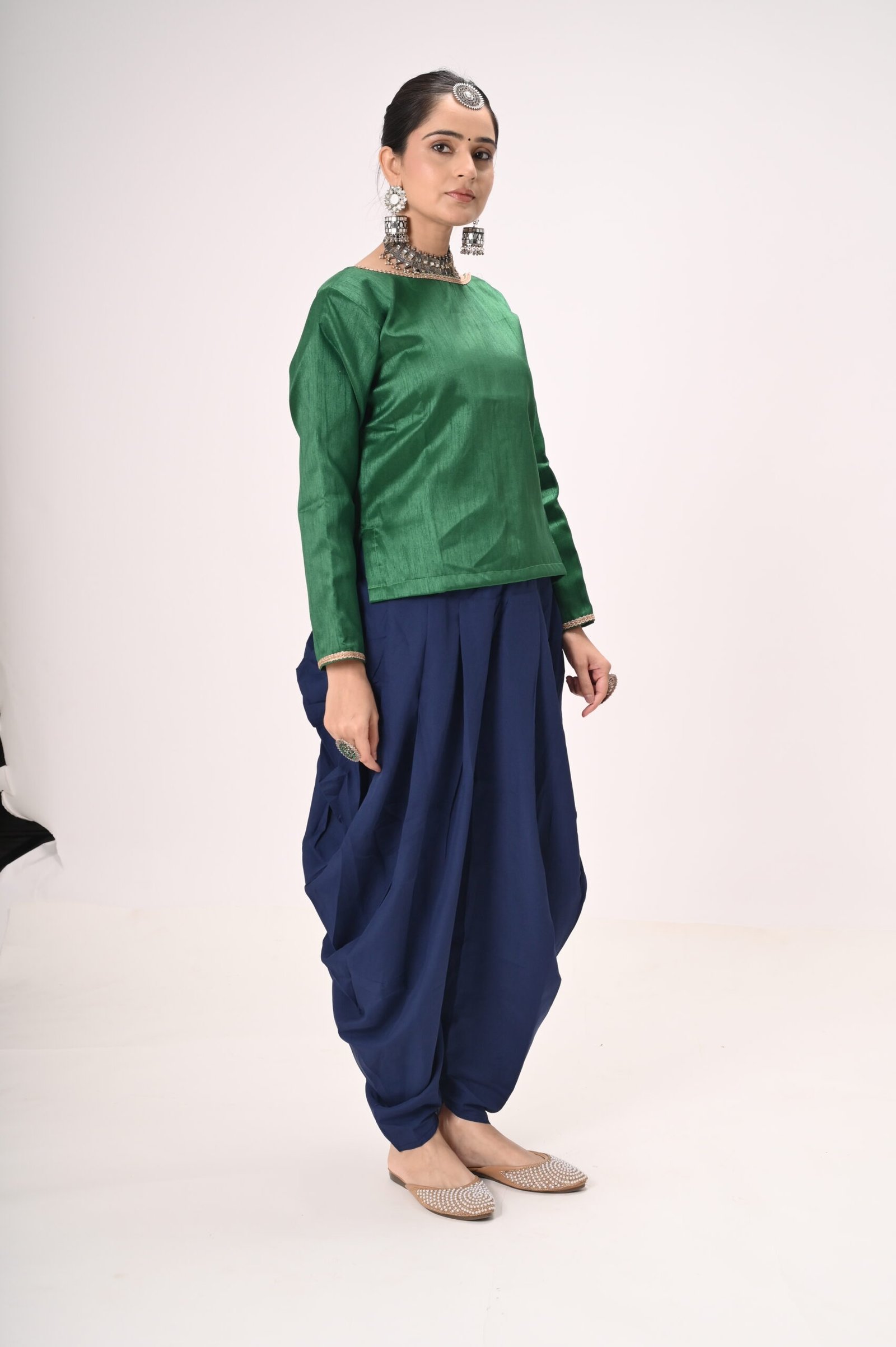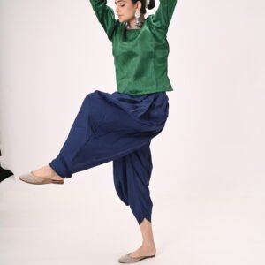 Green Silk Blouse with Navy Blue Dhoti Pants – Ideal for Kathak & Folk Performances