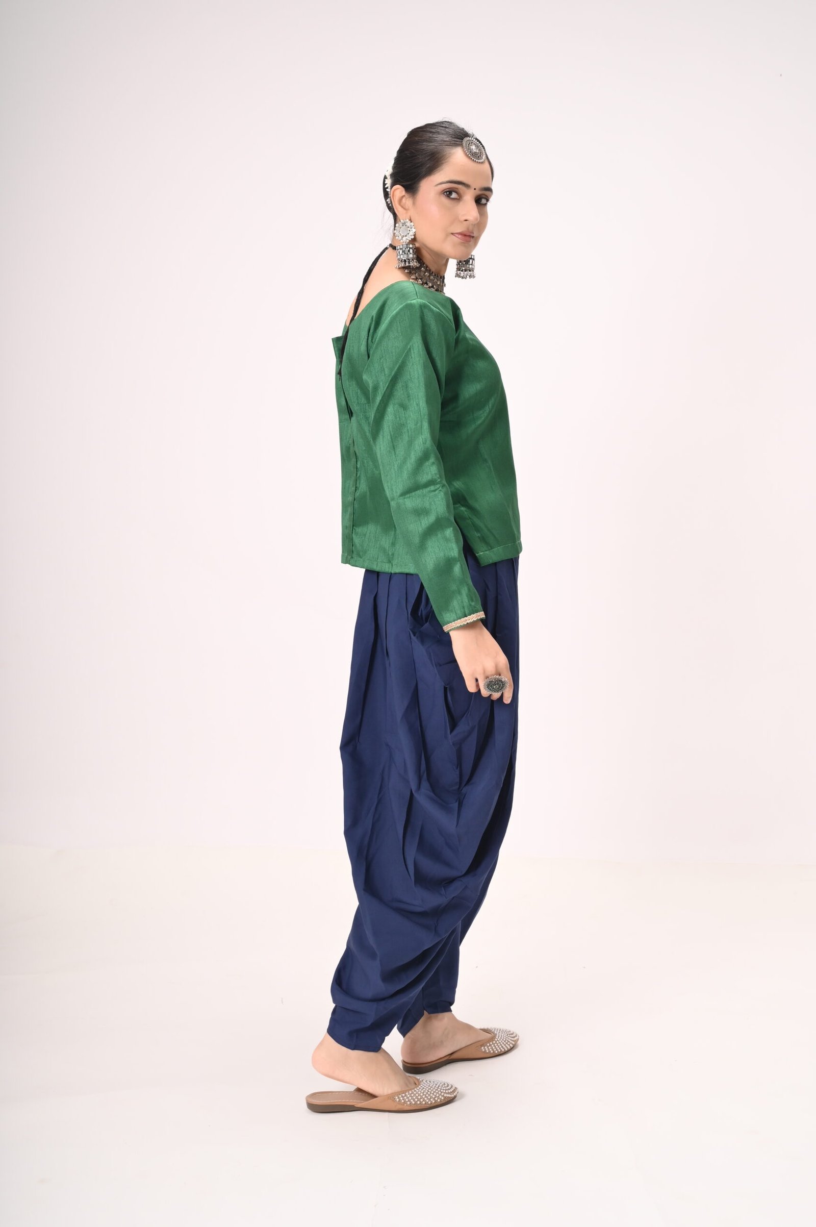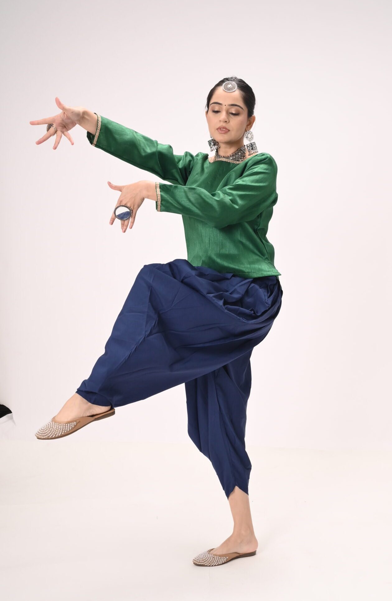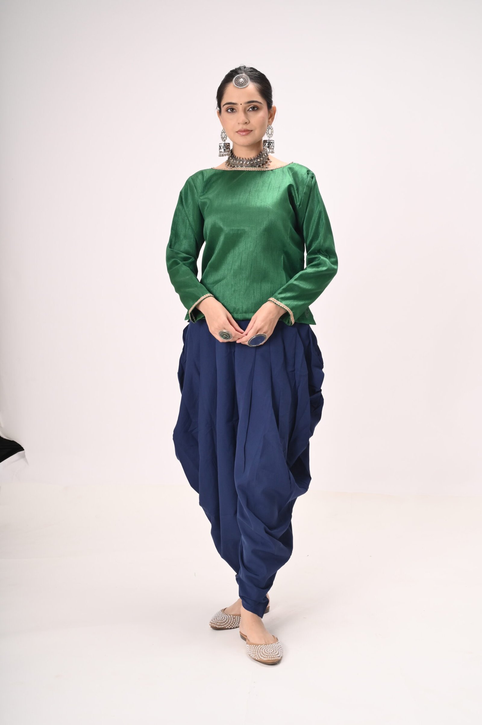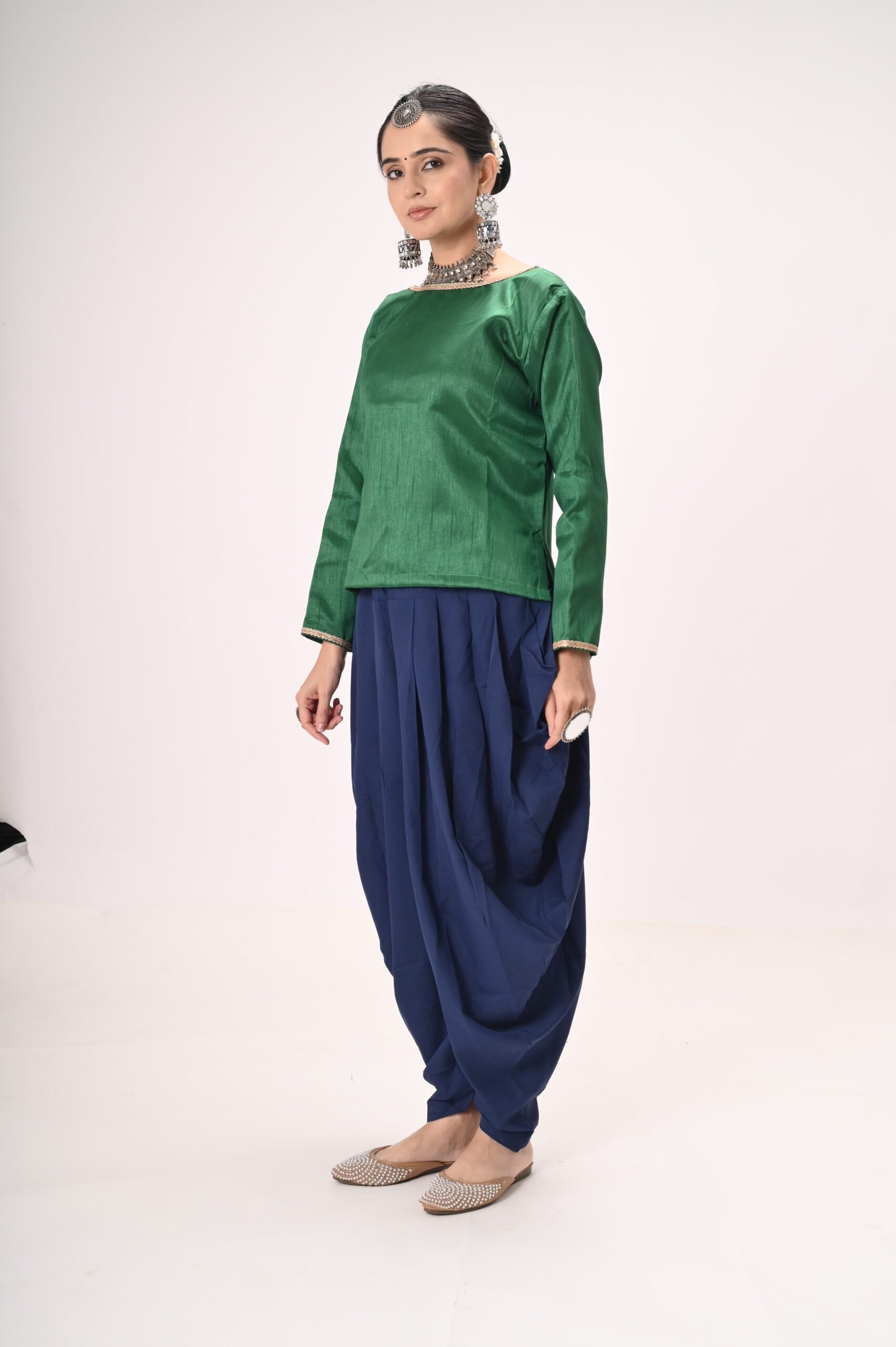 Green Silk Blouse with Navy Blue Dhoti Pants – Ideal for Kathak & Folk Performances