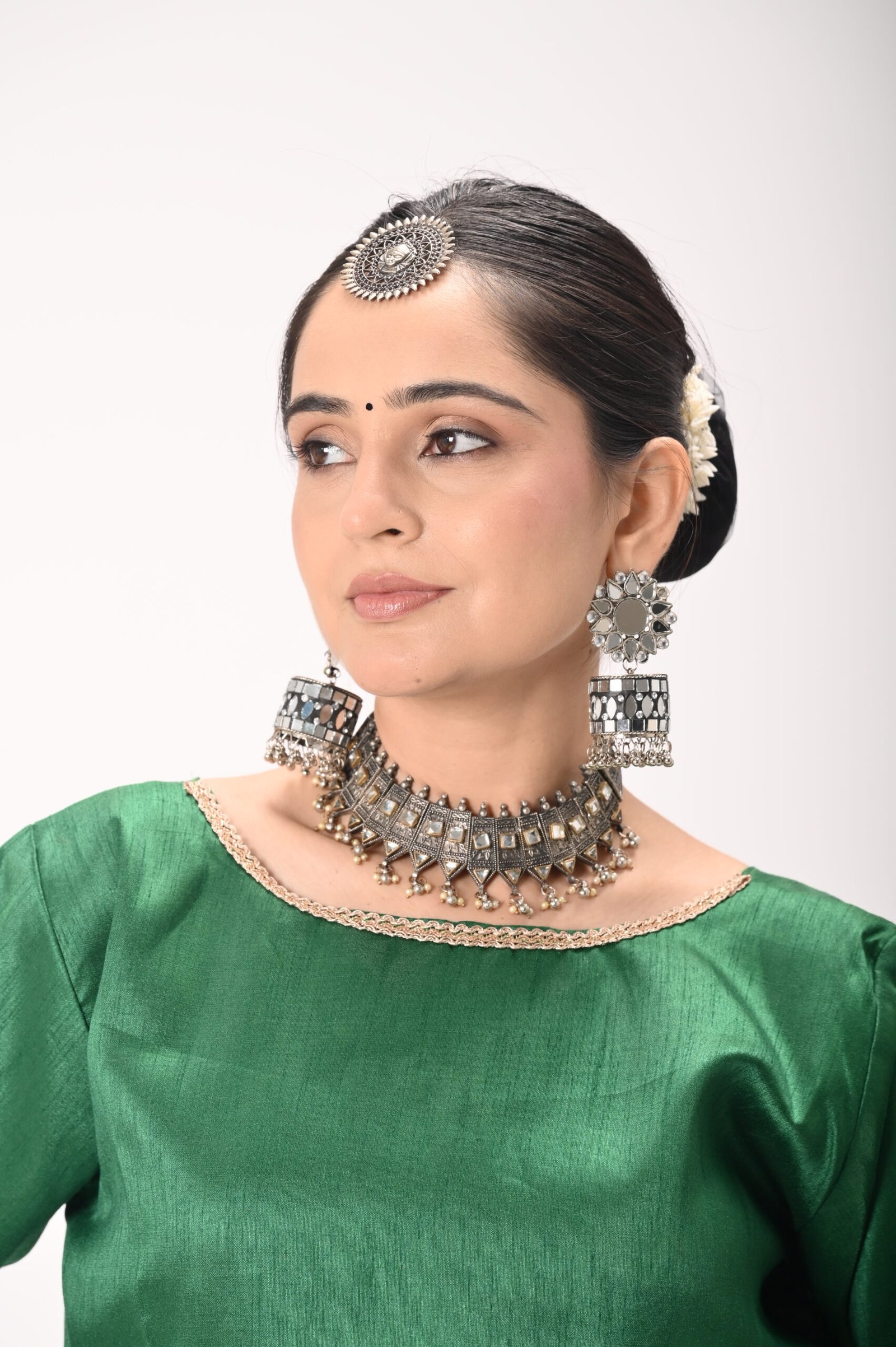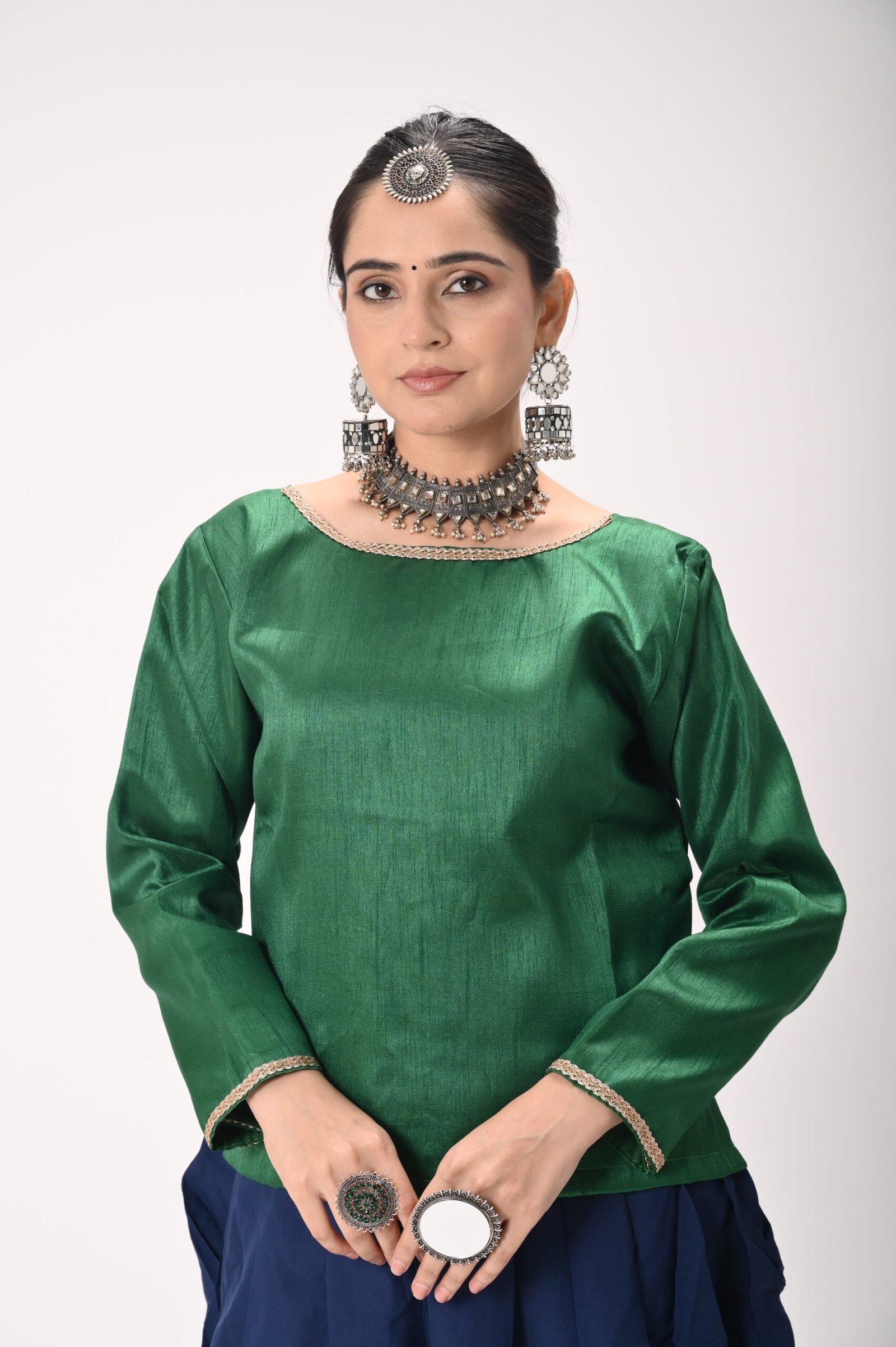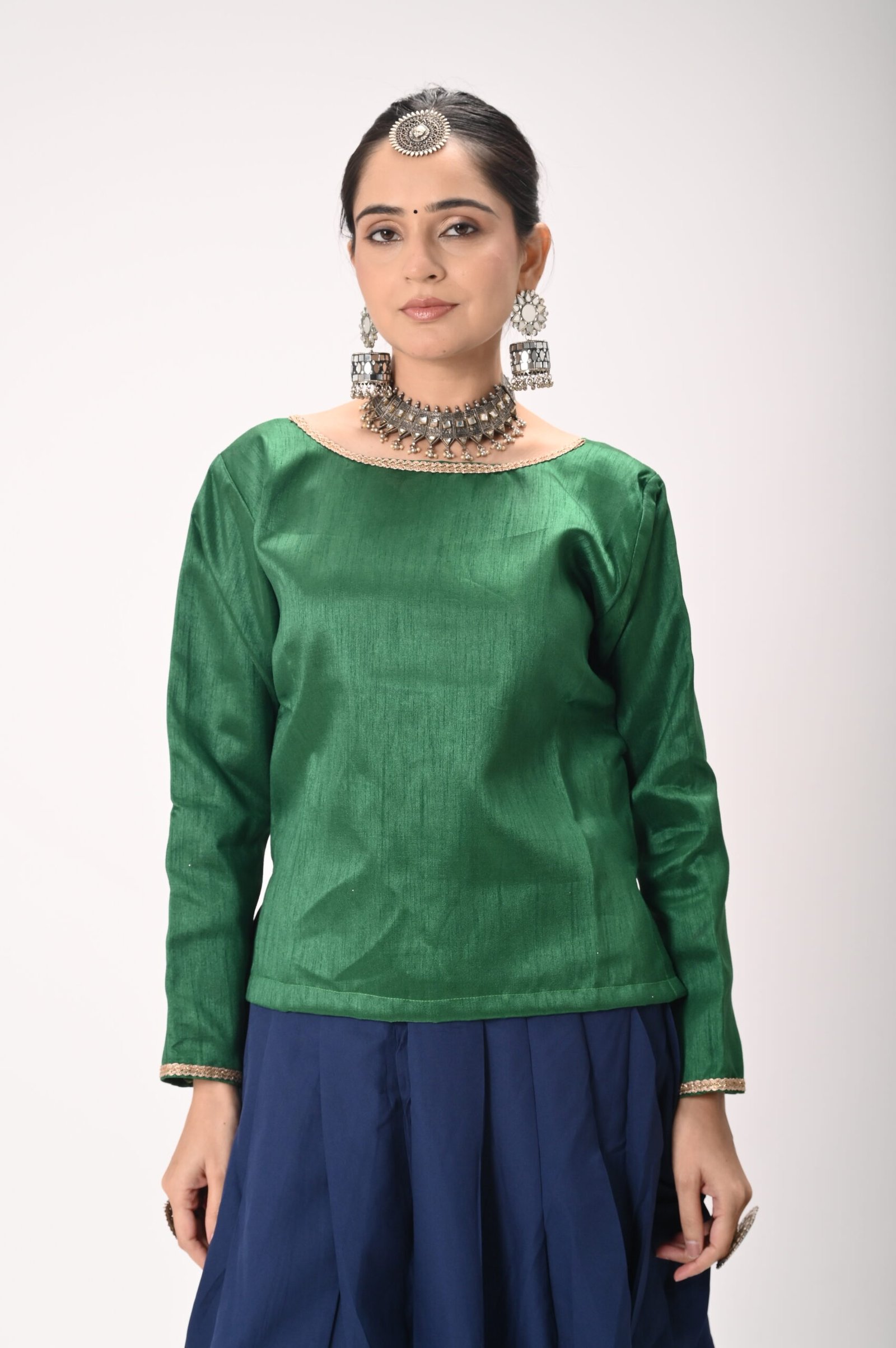 • Rich green silk blouse with full sleeves & minimal zari piping