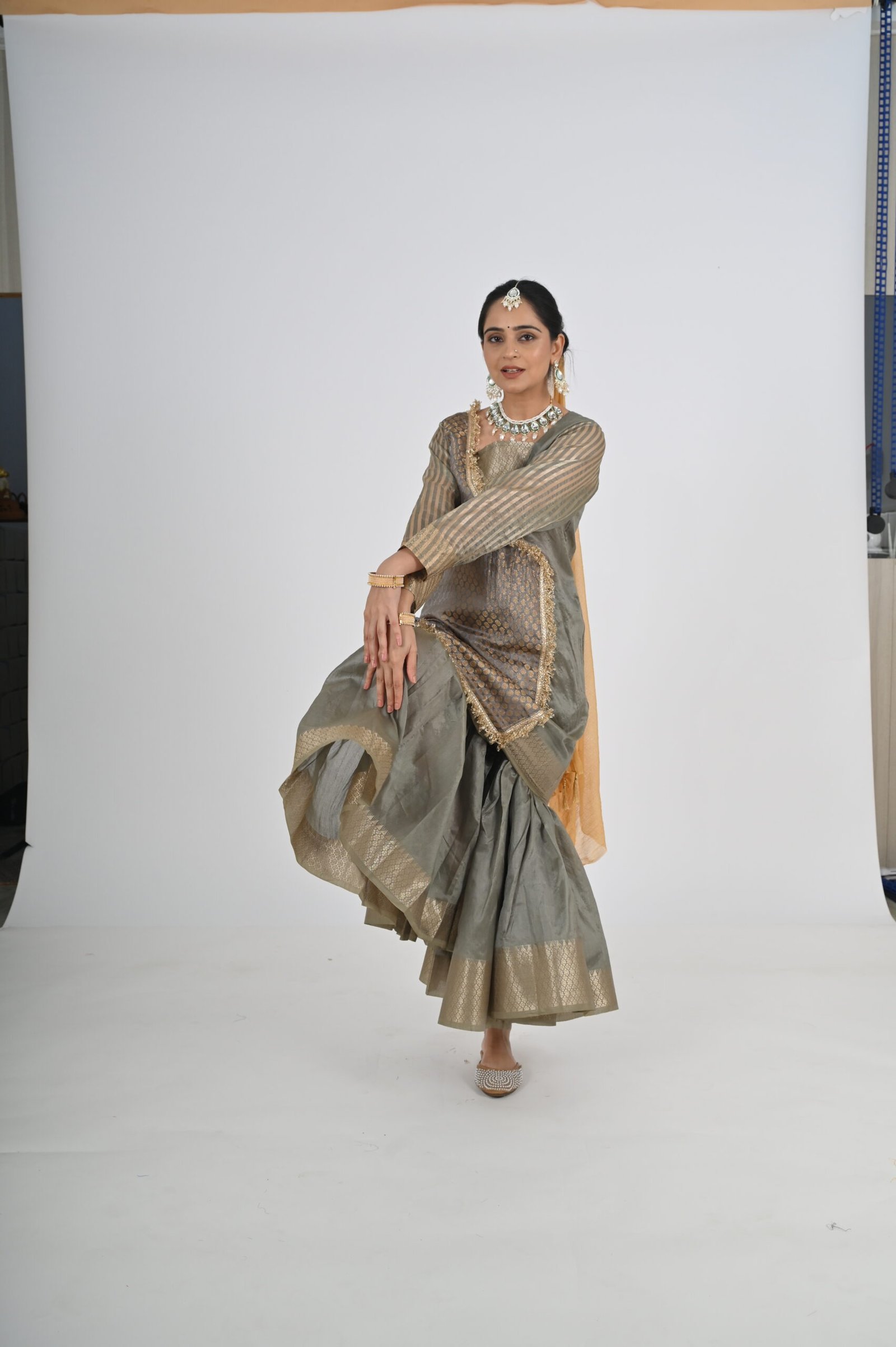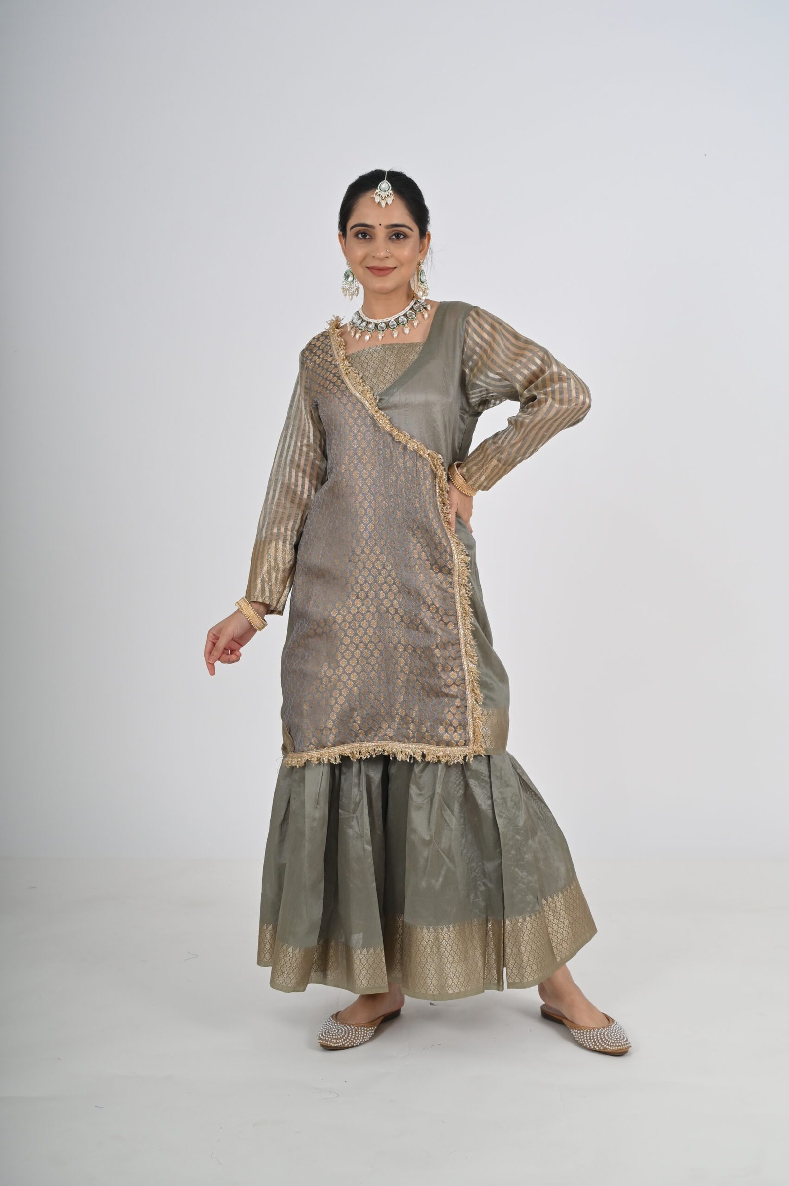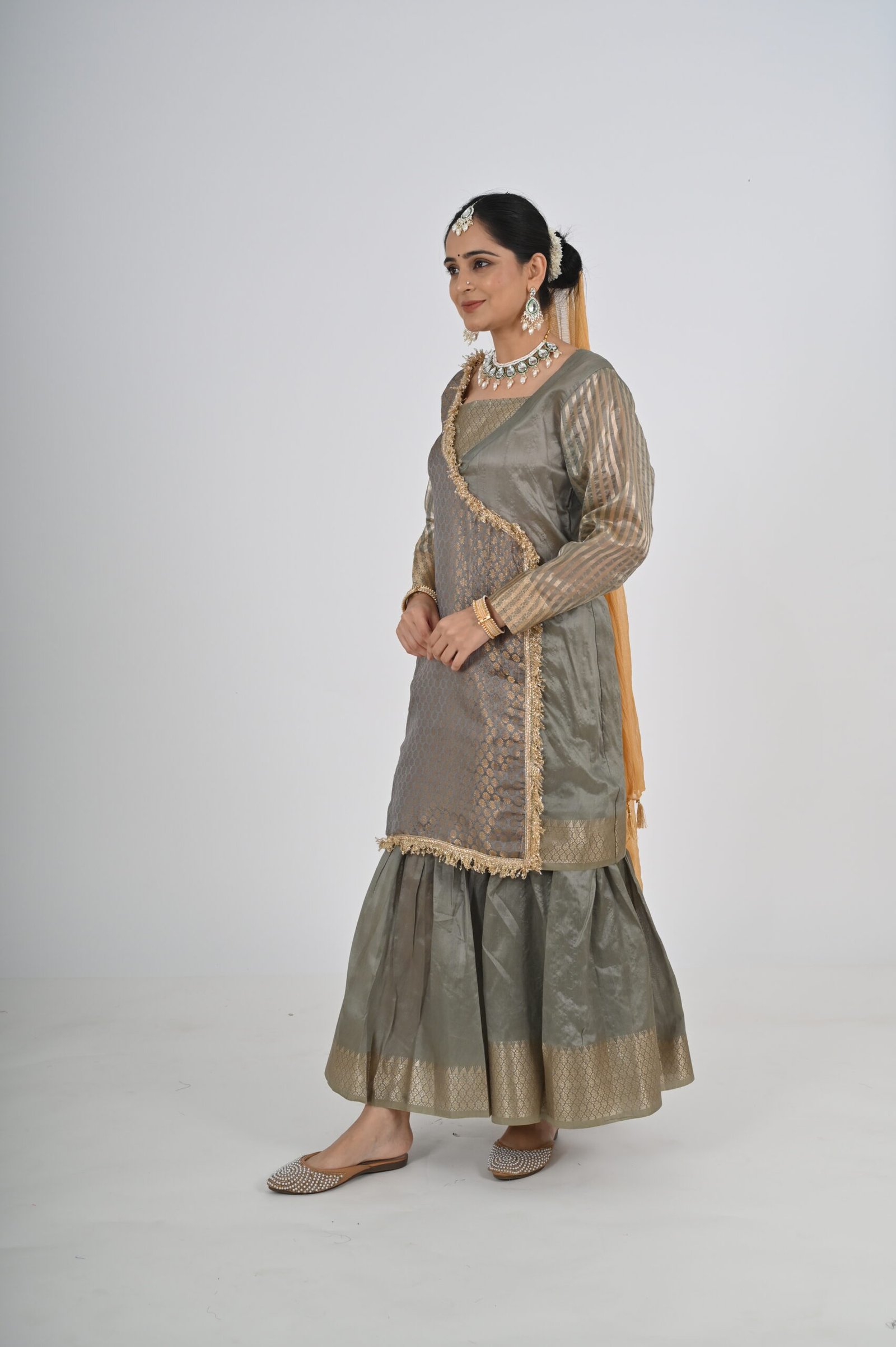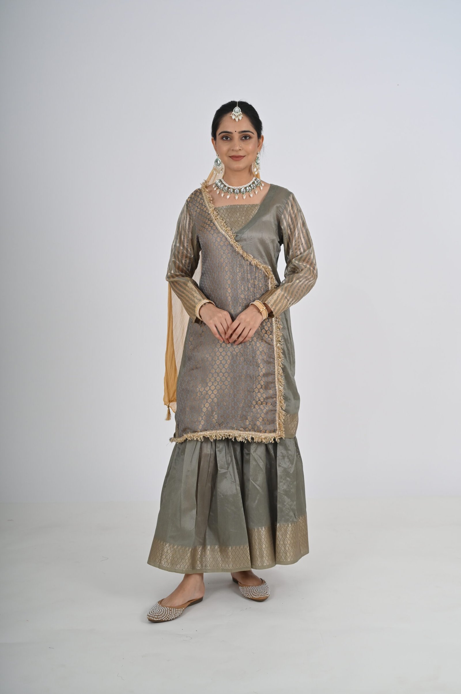 Make every occasion memorable and redefine elegance with this iconic Grey Kameez with Sharara, an outfit that is guaranteed to leave a lasting impression.