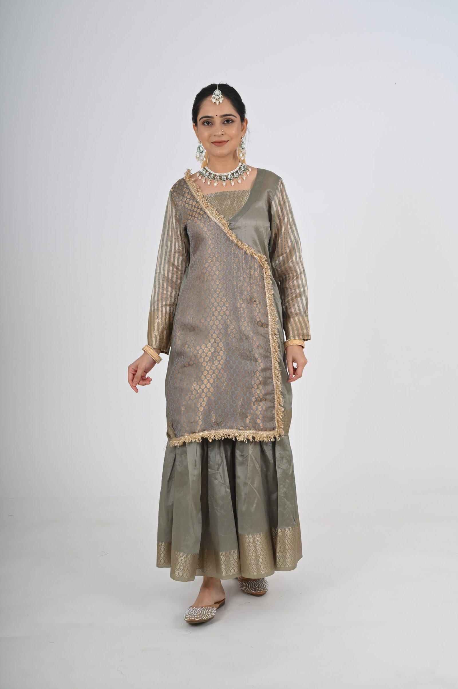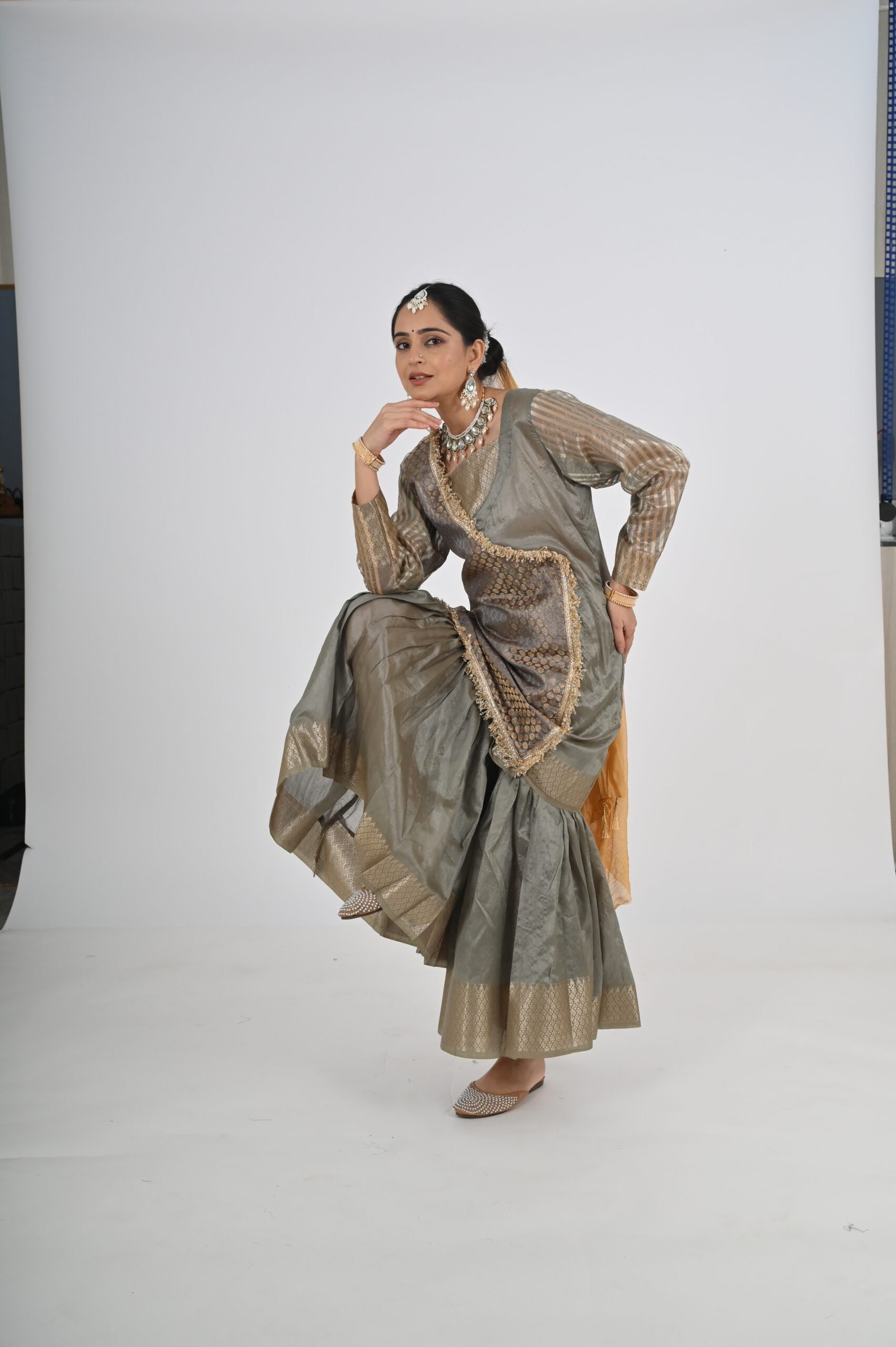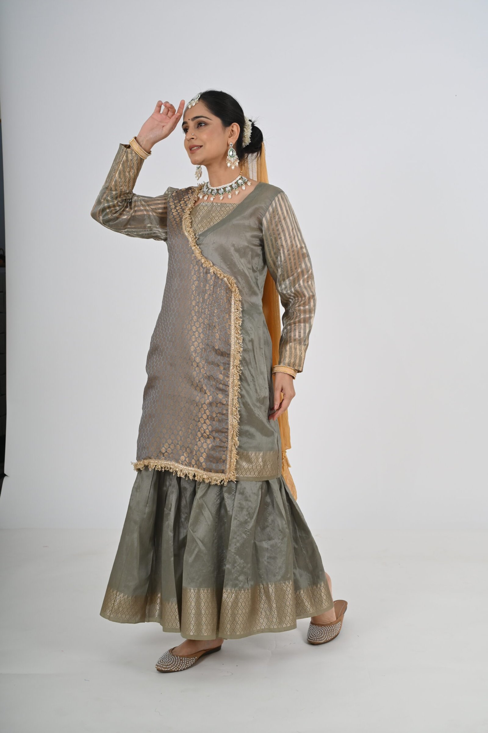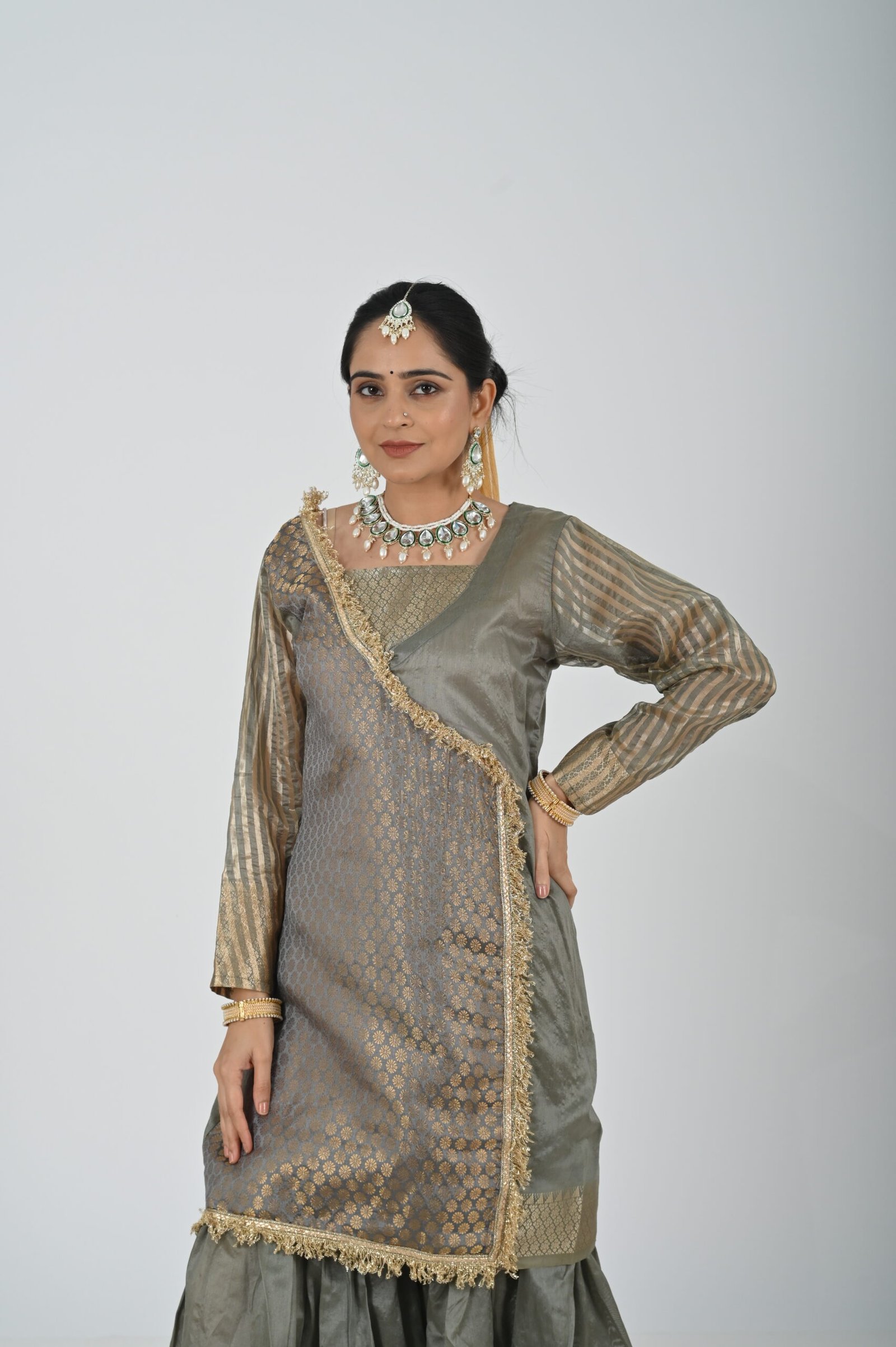 Make every occasion memorable and redefine elegance with this iconic Grey Kameez with Sharara, an outfit that is guaranteed to leave a lasting impression.