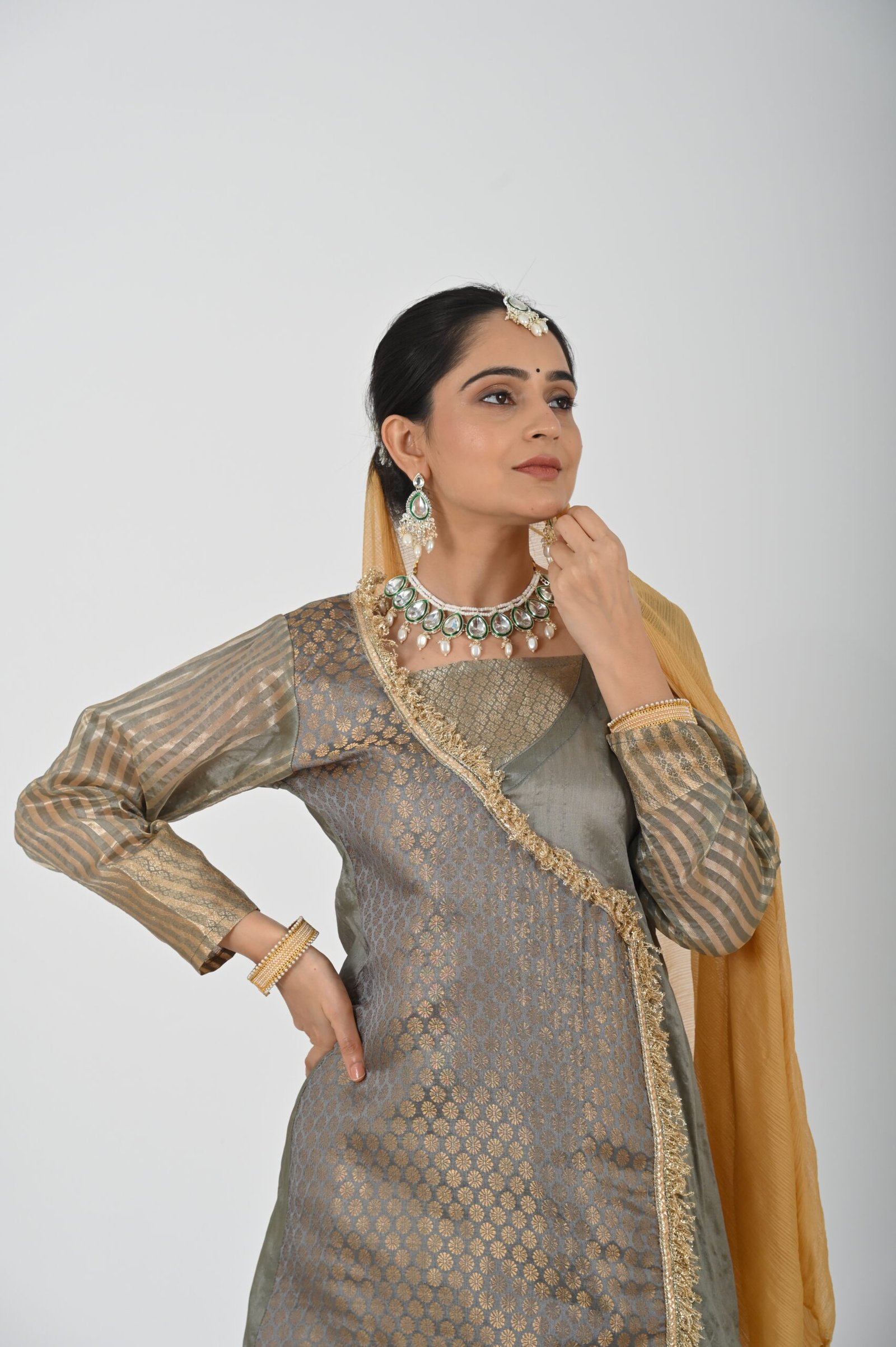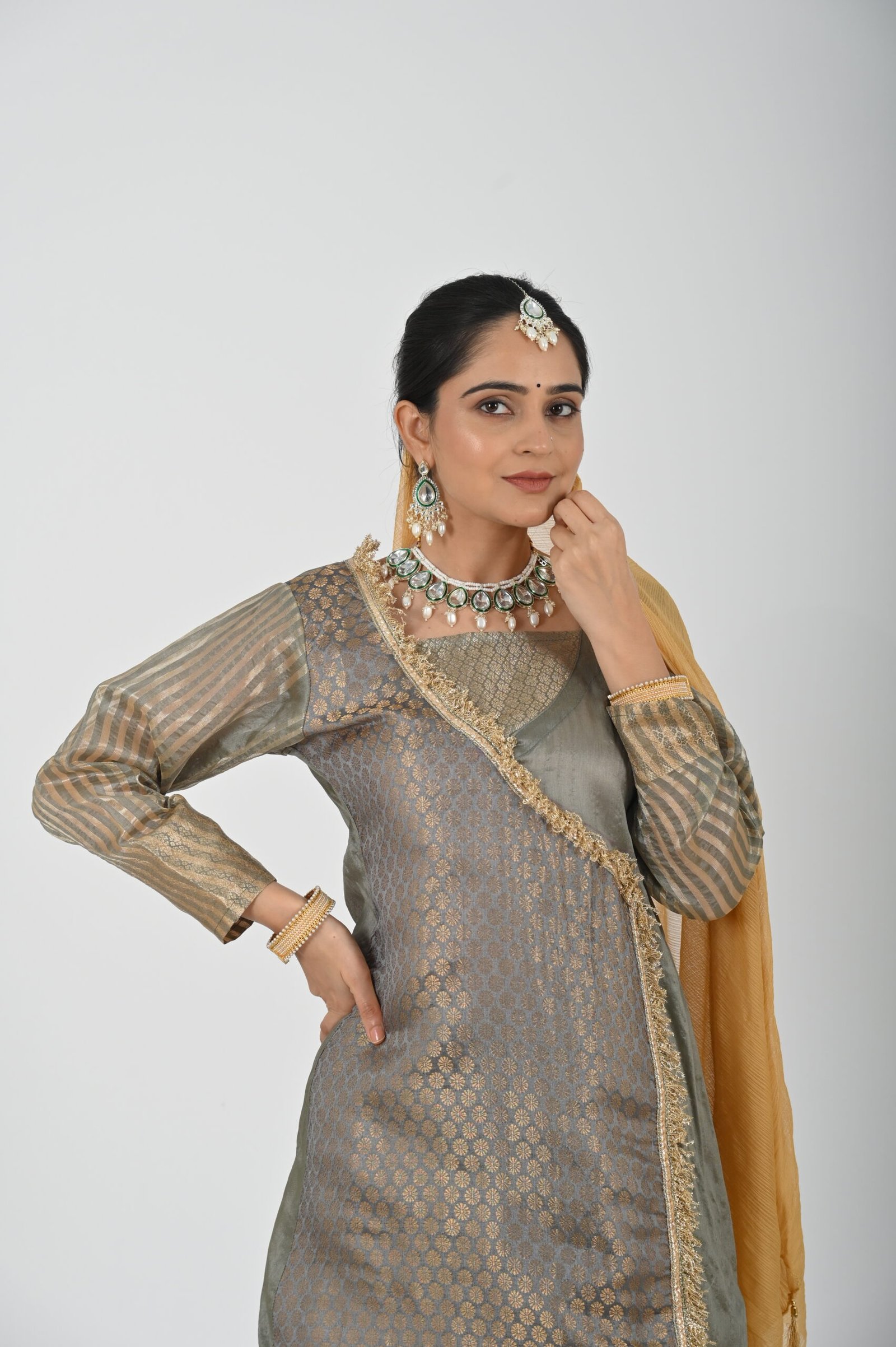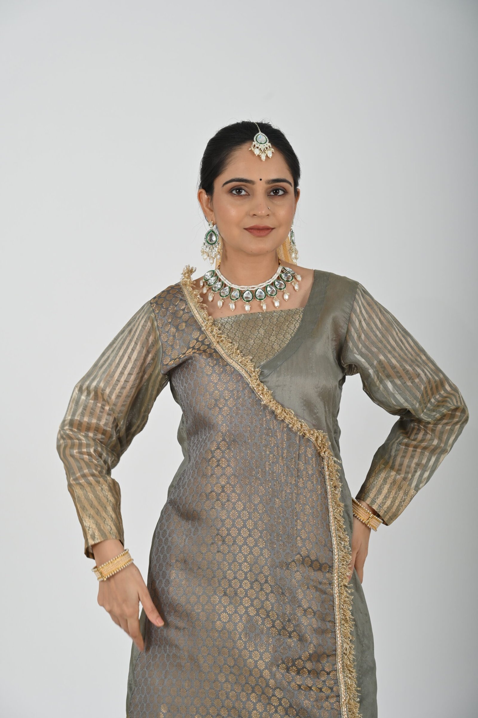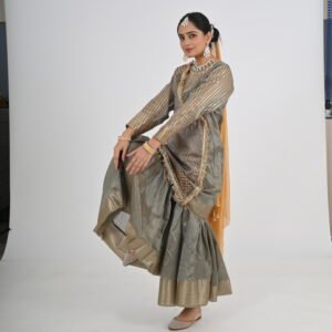 Step into sophistication with our stunning Grey Kameez with Sharara, a perfect blend of traditional charm and modern Bollywood-inspired aesthetics. Designed for women who love to make a statement, this exquisite ensemble is ideal for weddings, festive celebrations, or any special event where grace and style are paramount. The soft grey hue is elegant and versatile, complementing all skin tones while exuding class and poise.