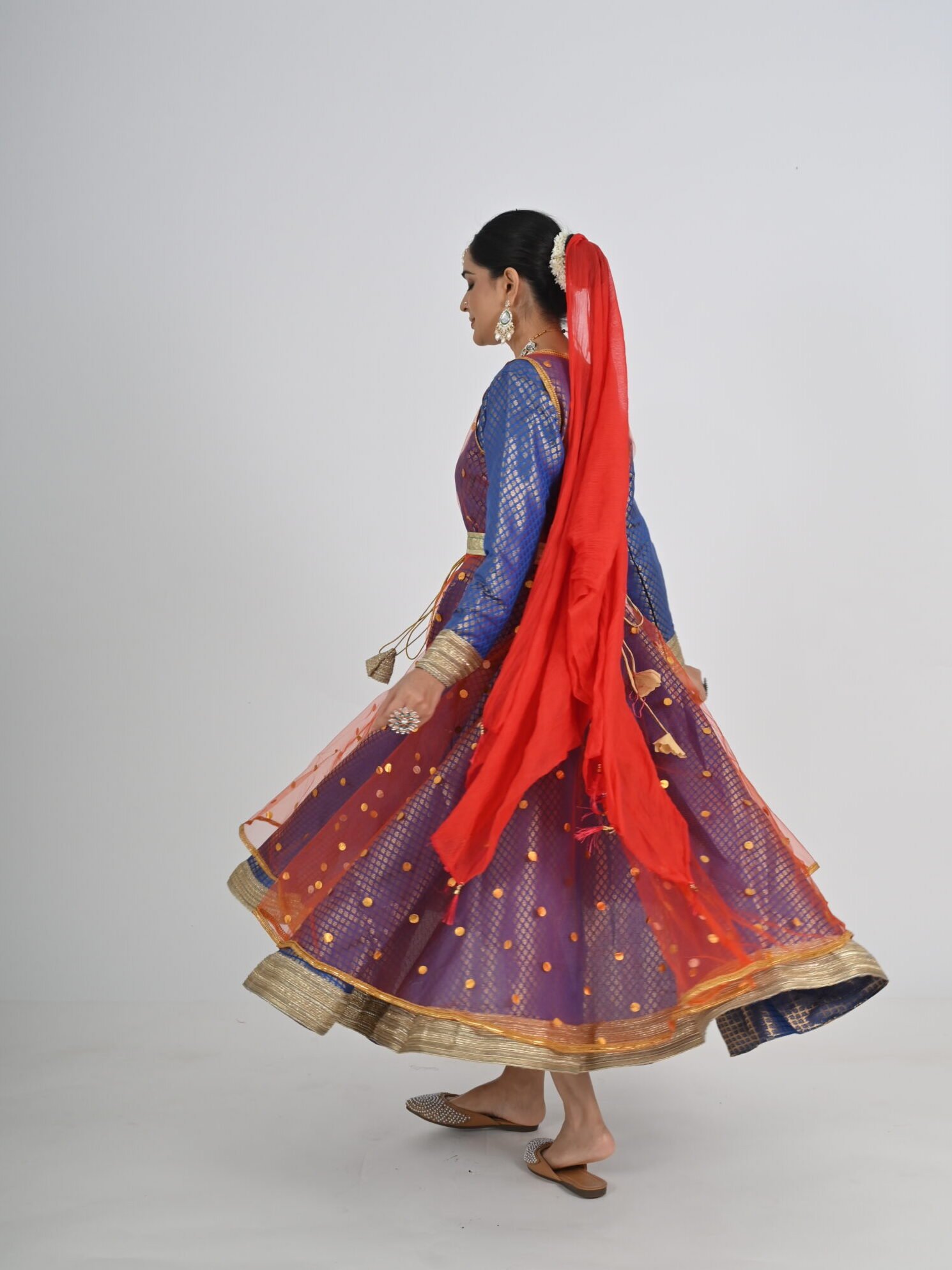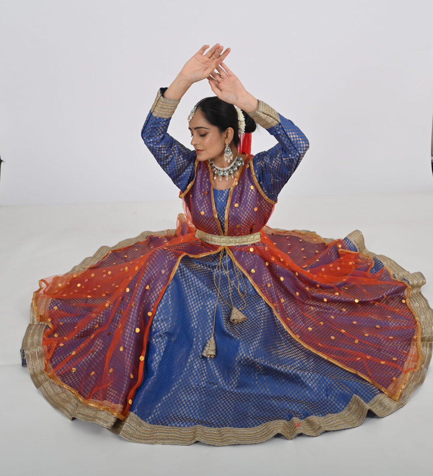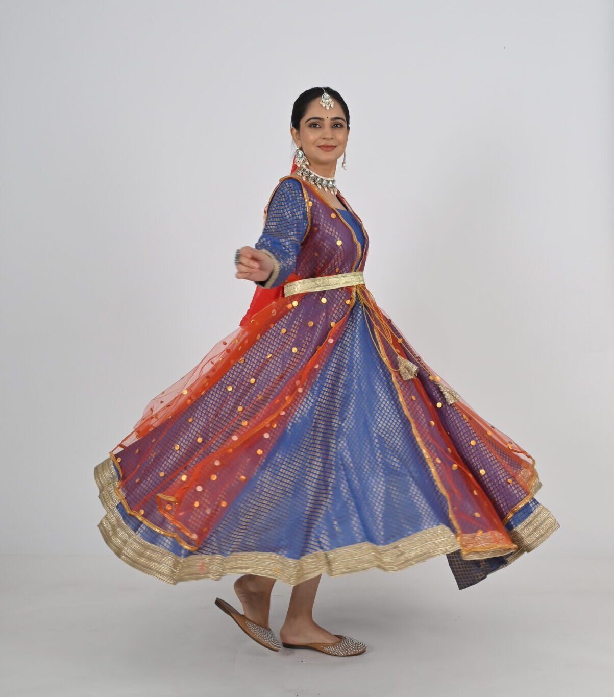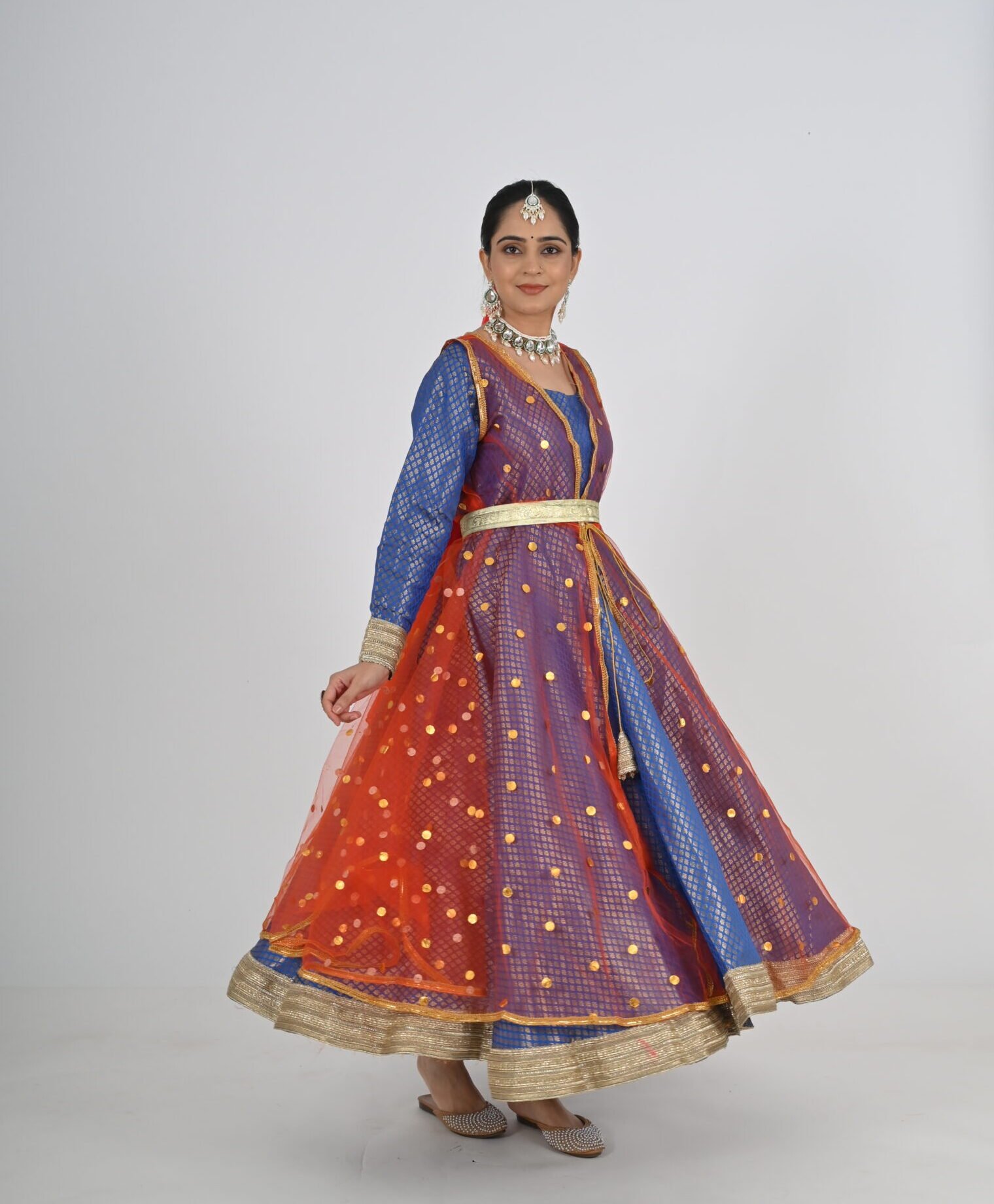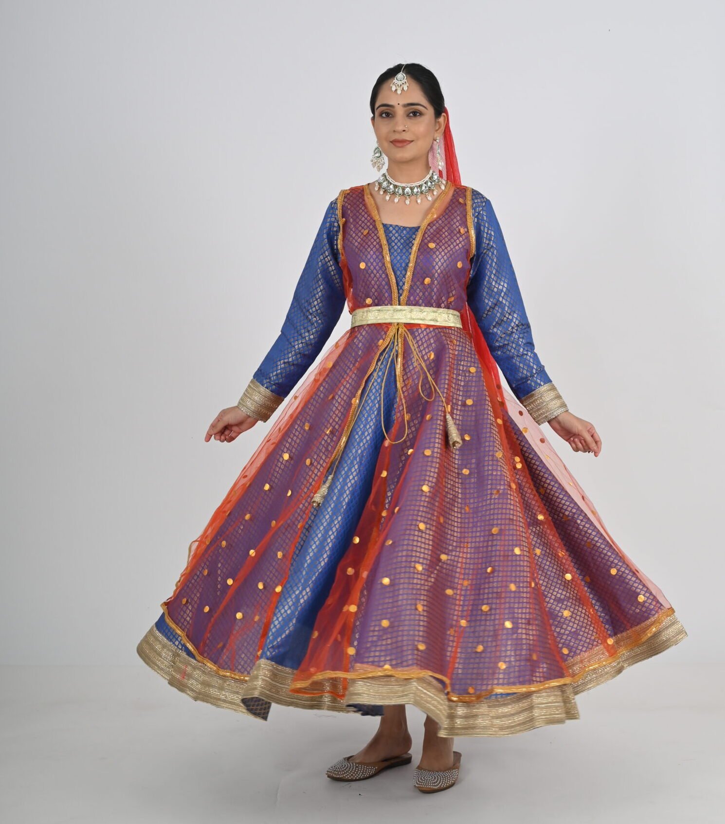 This Kathak Anarkali set is designed to highlight the dancer’s form and movements, ensuring you shine in every twirl and sway. The lightweight material, combined with its traditional yet contemporary design, makes it a standout choice for performances, rehearsals, or cultural events. Experience the perfect balance of beauty, comfort, and practicality with this exceptional dancewear creation.
