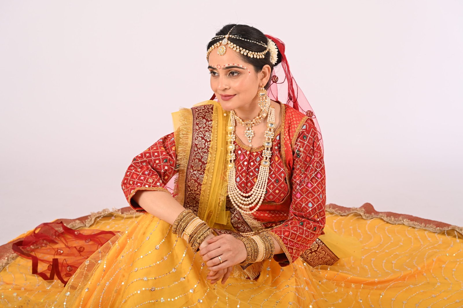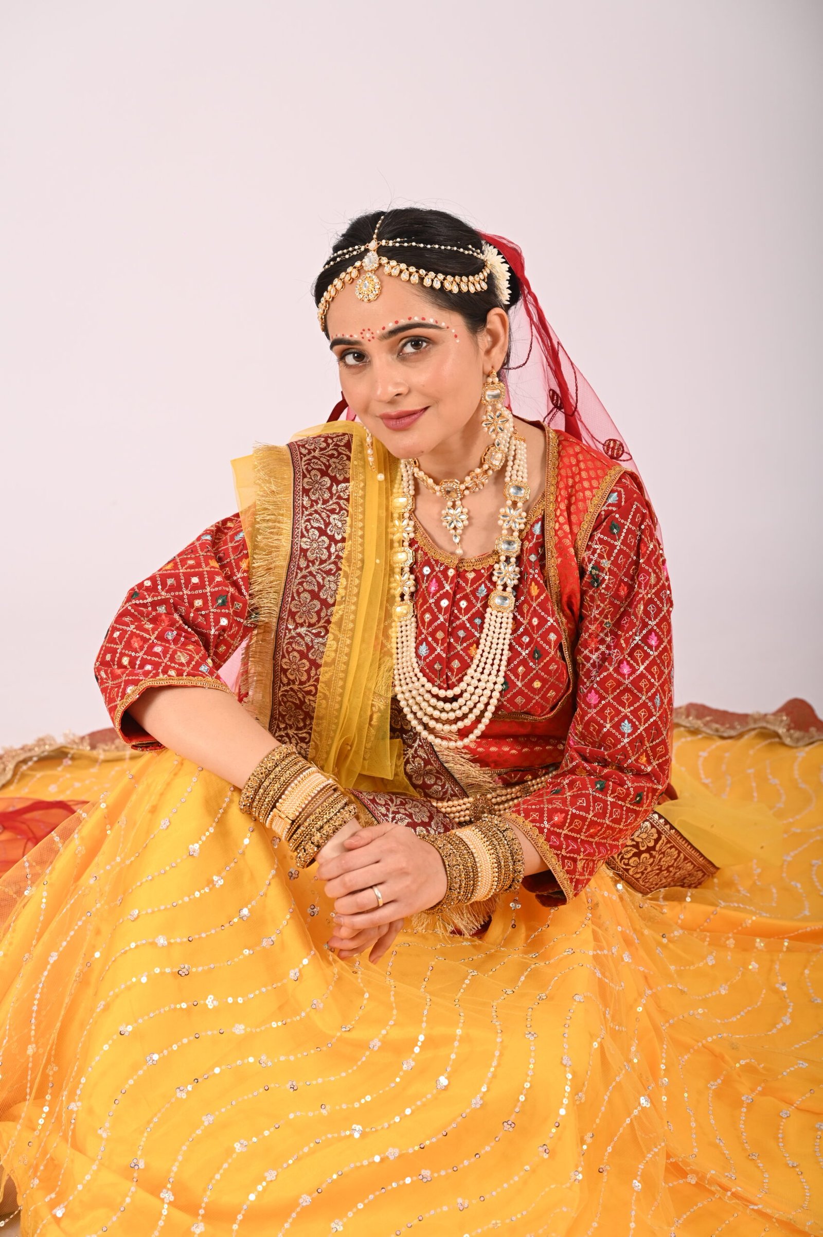 The Kathak Radha Yellow Net Lehenga with Brocade Blouse, Jacket, and Dupatta is a celebration of timeless beauty and cultural heritage. Designed to highlight your elegance, this ensemble is perfect for traditional events, festive occasions, or grand celebrations. Its vibrant yellow tone blends sophistication and vibrancy, ensuring you stand out without compromising on grace.