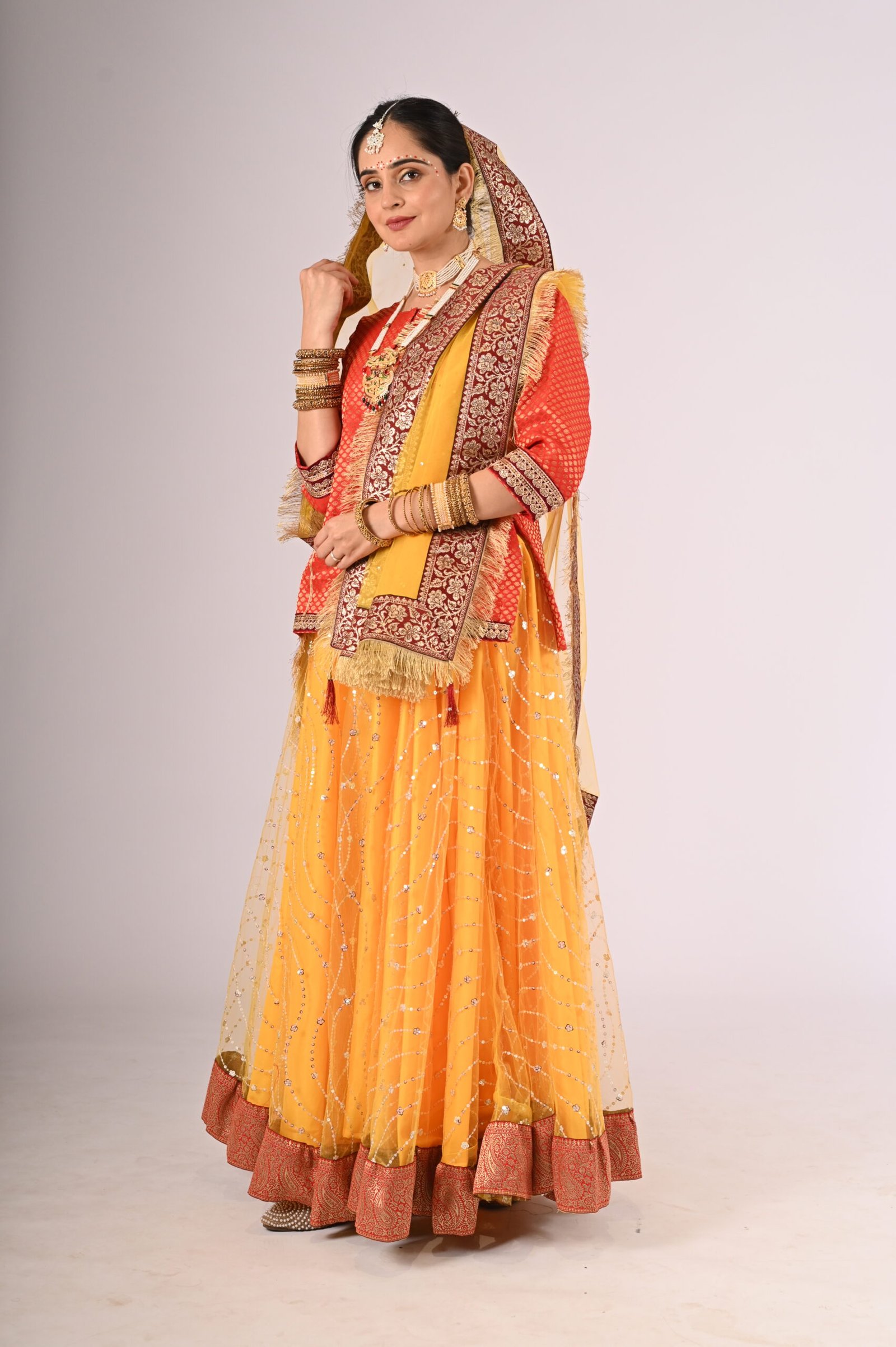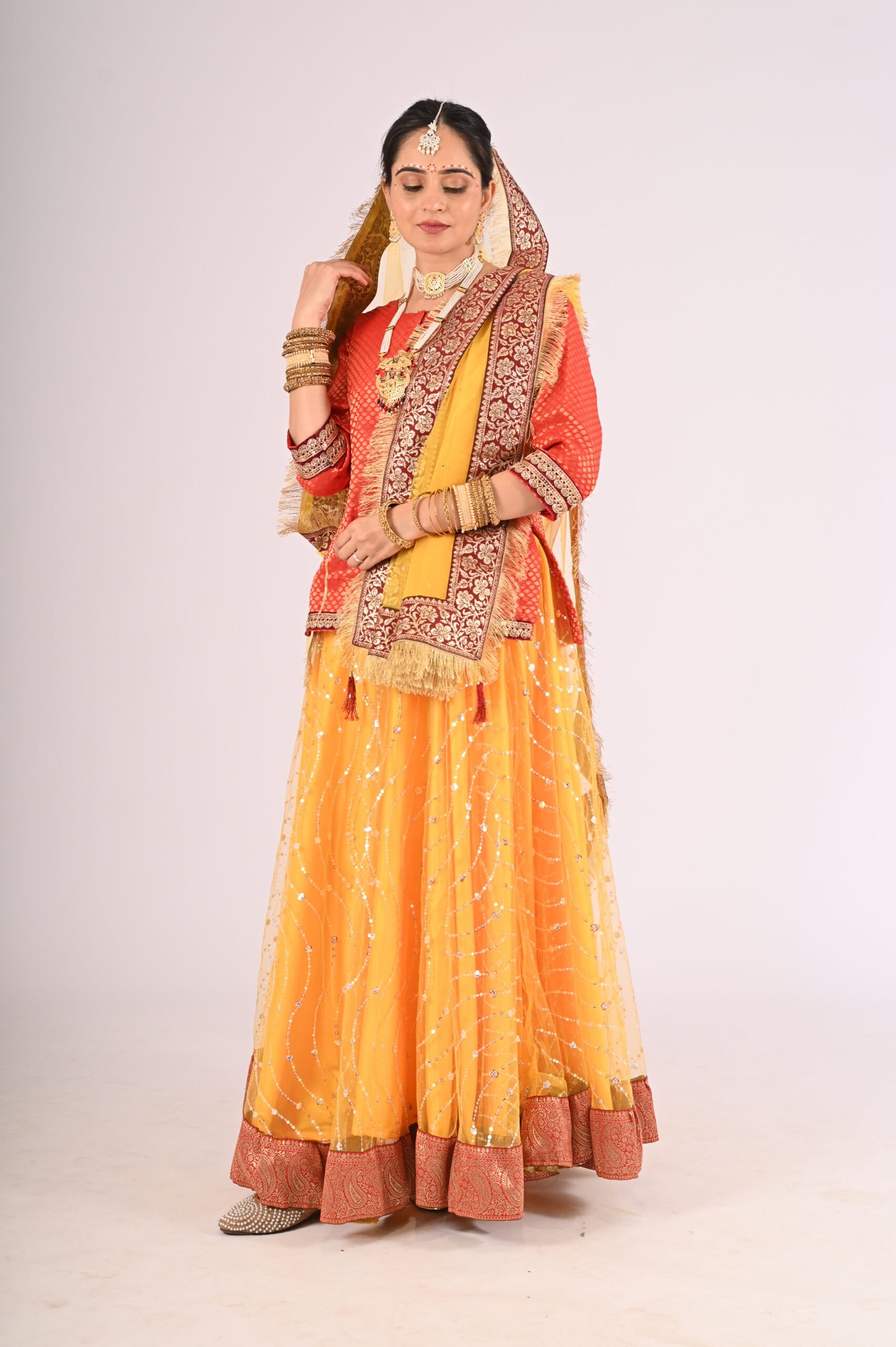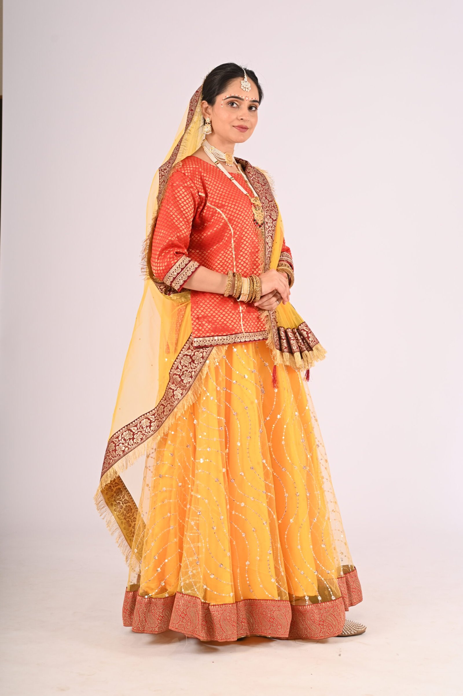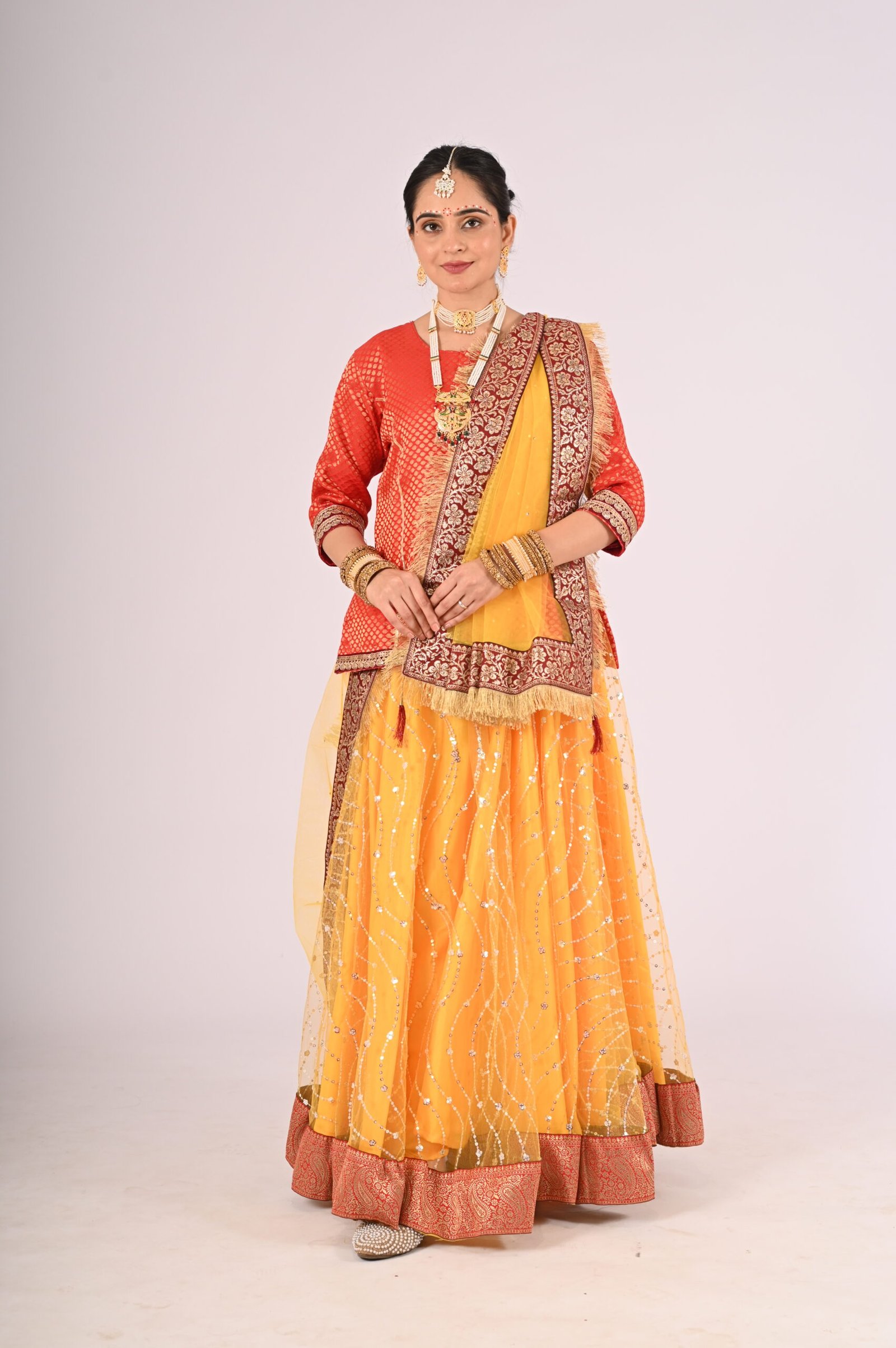 Step into the world of timeless tradition with the Kathak Yellow Net Lehenga, paired with a stunning Red Brocade Blouse and a graceful Net Dupatta. This outfit is an ode to elegance, crafted to exude a sophisticated charm while remaining rooted in cultural aesthetics. The vibrant yellow lehenga brings sunshine-like radiance, complemented by the intricacy of the brocade blouse, making it an unforgettable attire for festivities, weddings, or formal gatherings.