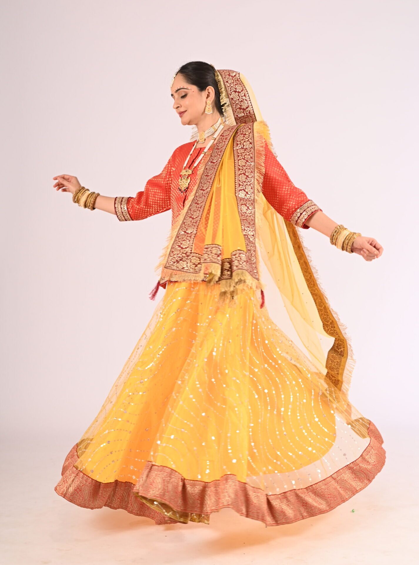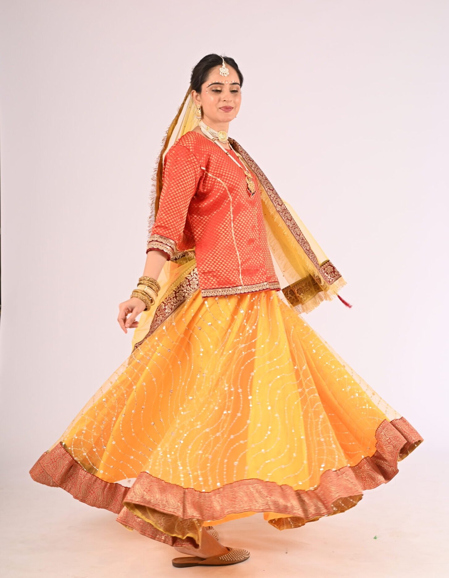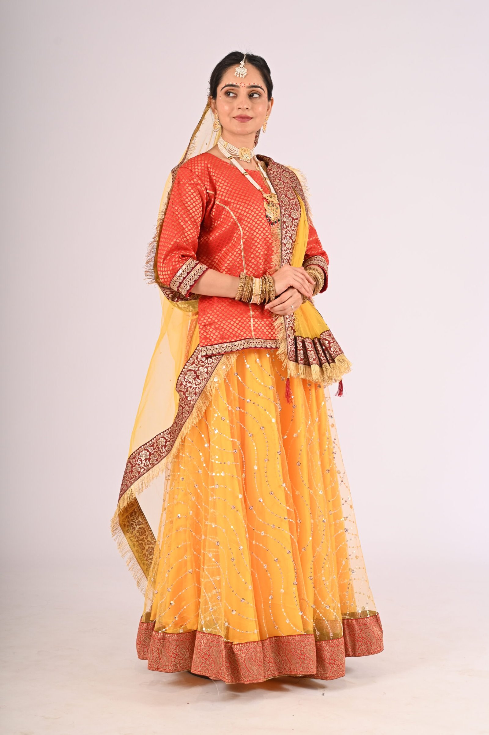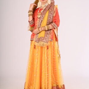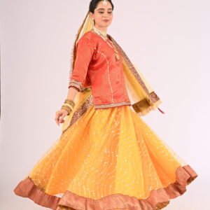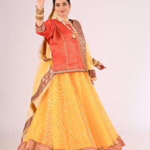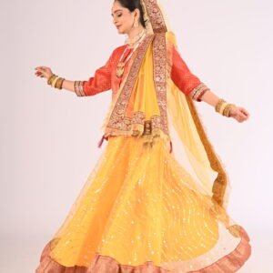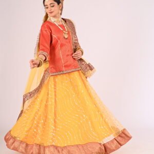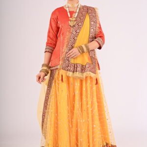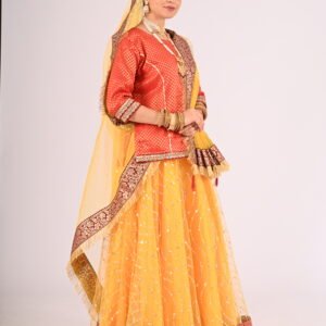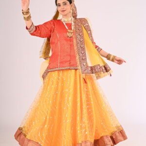 If you seek attire with a fusion of cultural essence and modern charm, the Kathak Yellow Net Lehenga with its striking Red Brocade Blouse and Net Dupatta is your ultimate choice. Elevate your wardrobe with this exquisite piece and embrace unforgettable moments with confidence and glamour.