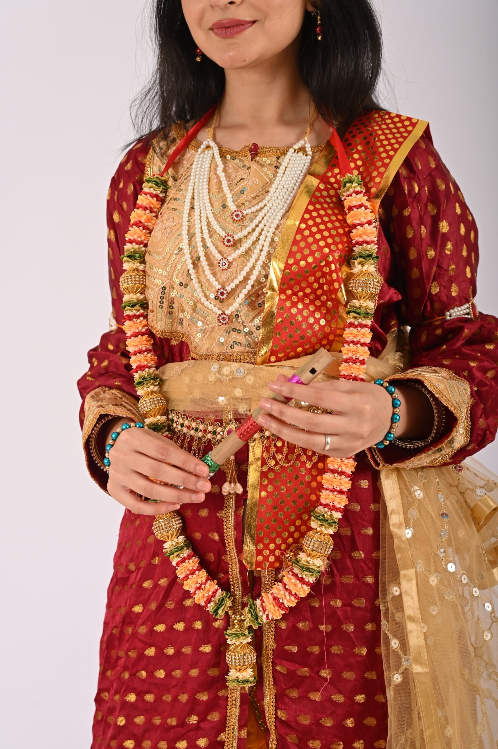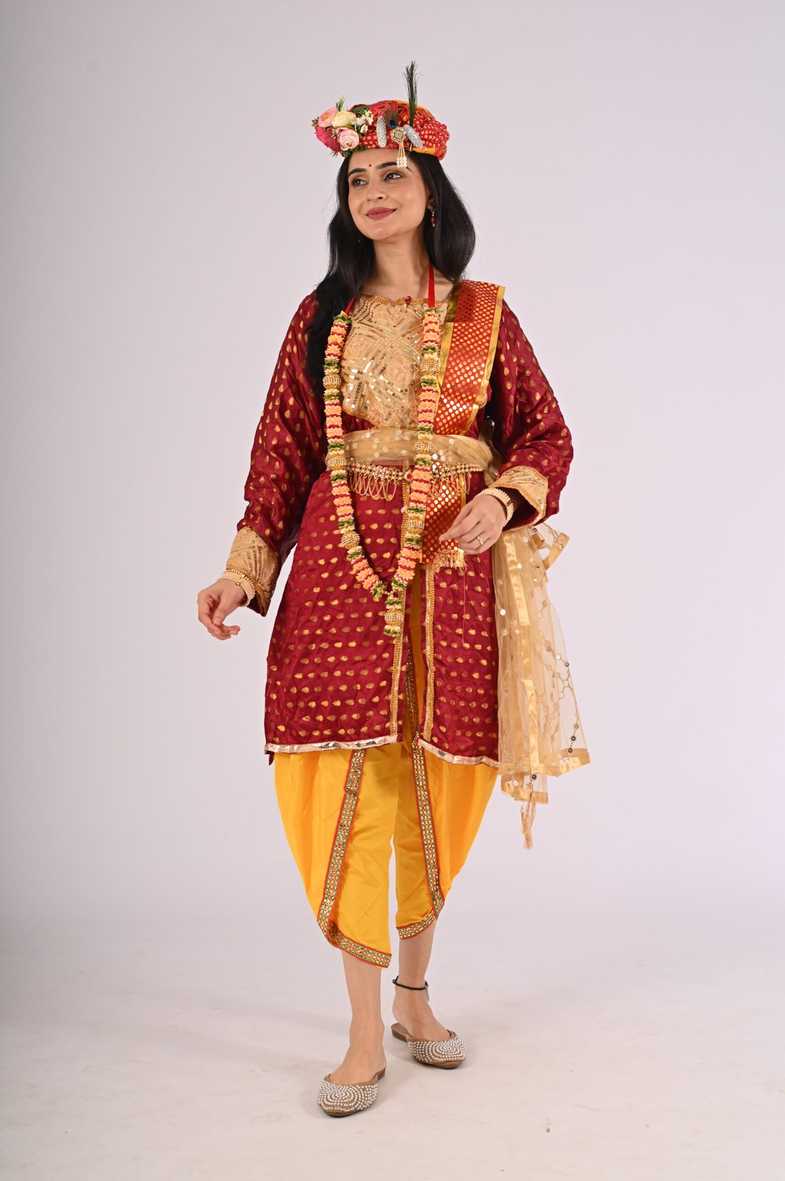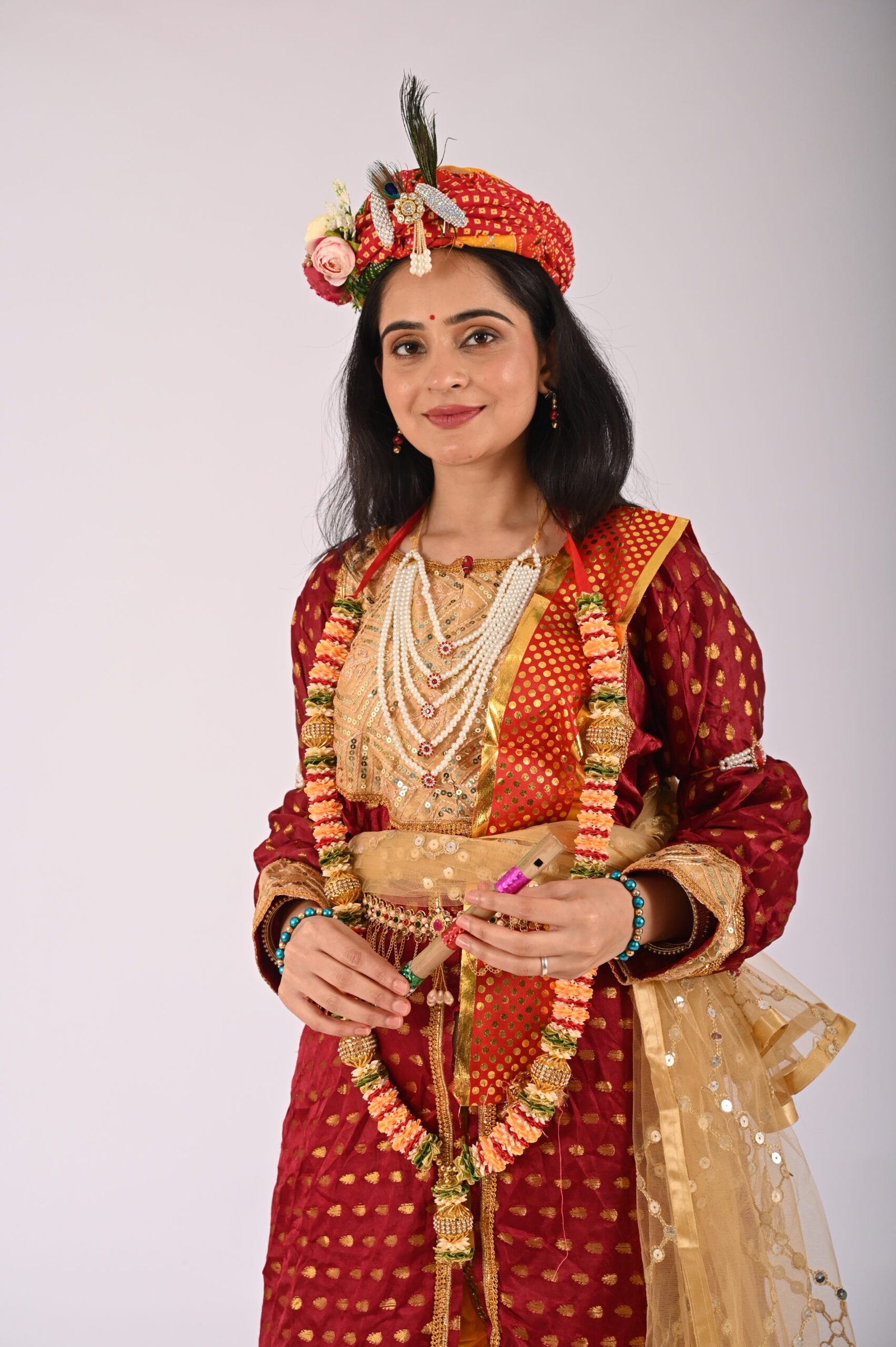 Transform any celebration into an enchanting experience with our Krishna Costume Set. Designed to emulate the divine attire of Lord Krishna, this meticulously crafted set embodies tradition, elegance, and charm. Whether it’s for Janmashtami celebrations, cultural performances, or festive occasions, this costume adds a touch of authenticity and grace to your look. Featuring Angrakha, Dhoti, Stole, Dupatta, Mala, Pagadi, Necklace, Earrings, Bajuband, Kamarband, and Bangles, every element is thoughtfully curated to recreate the timeless attire with exquisite detail.