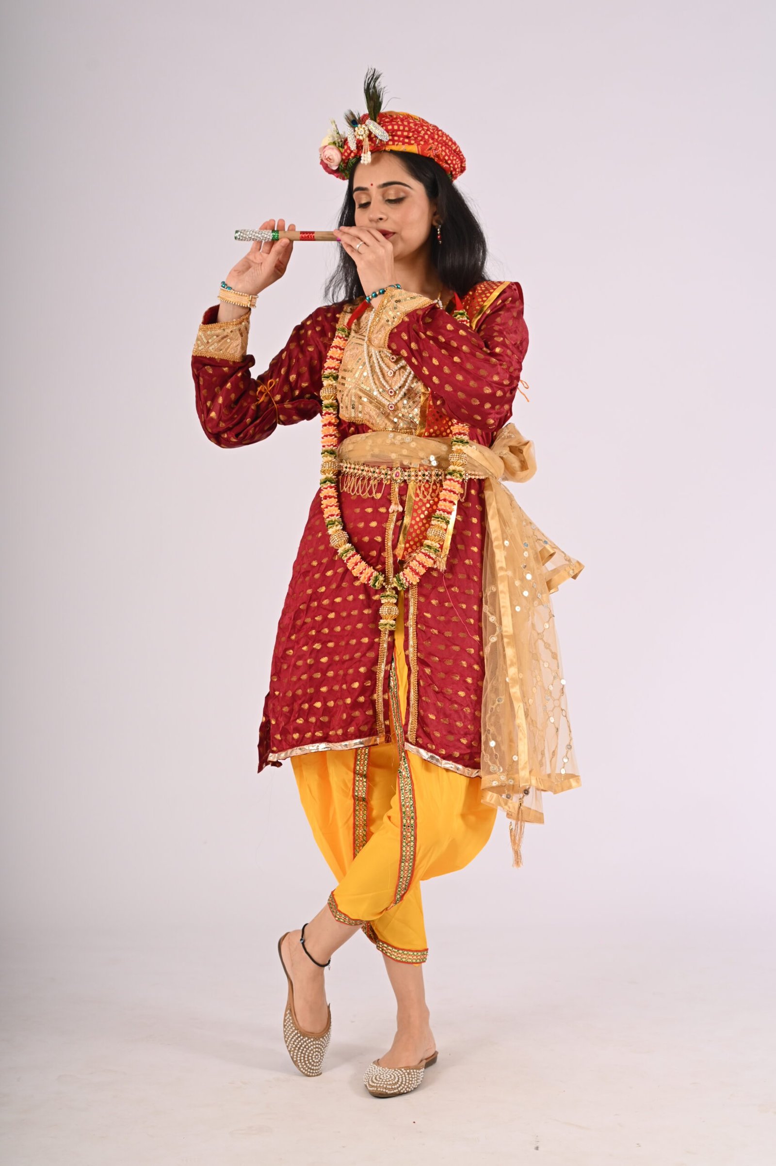 Elevate your festive wardrobe today with the Krishna Costume Set, a masterpiece that speaks volumes of heritage, devotion, and craftsmanship in every detail.