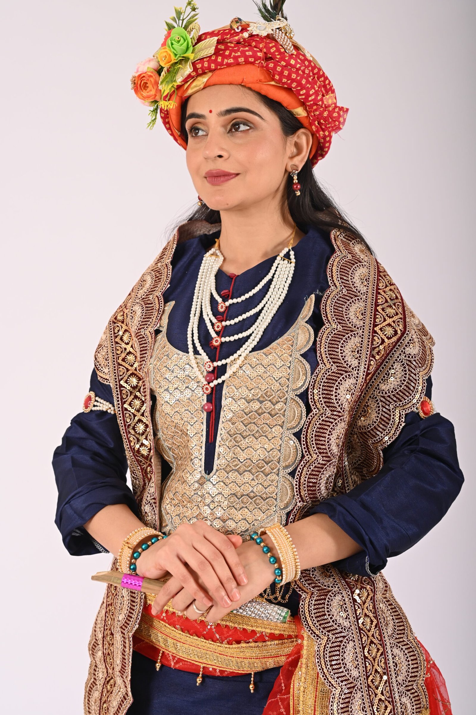This comprehensive Krishna Costume Set includes everything you need for a complete and authentic look. The set features an Angrakha for a soft yet traditional top matched perfectly with a comfortable Dhoti. Add a charismatic touch with the adorned Stole and vibrant Dupatta. Complete the divine look with intricately designed accessories such as the symbolic Mala, elegant Pagadi, stunning Choker, dazzling Necklace, and delicate Earrings. To enhance the regality, the set also includes a beautifully crafted Bajuband, an ornate Kamarband, and balanced Bangles. These elements together create a look that truly represents Lord Krishna’s unmatched aura and style.