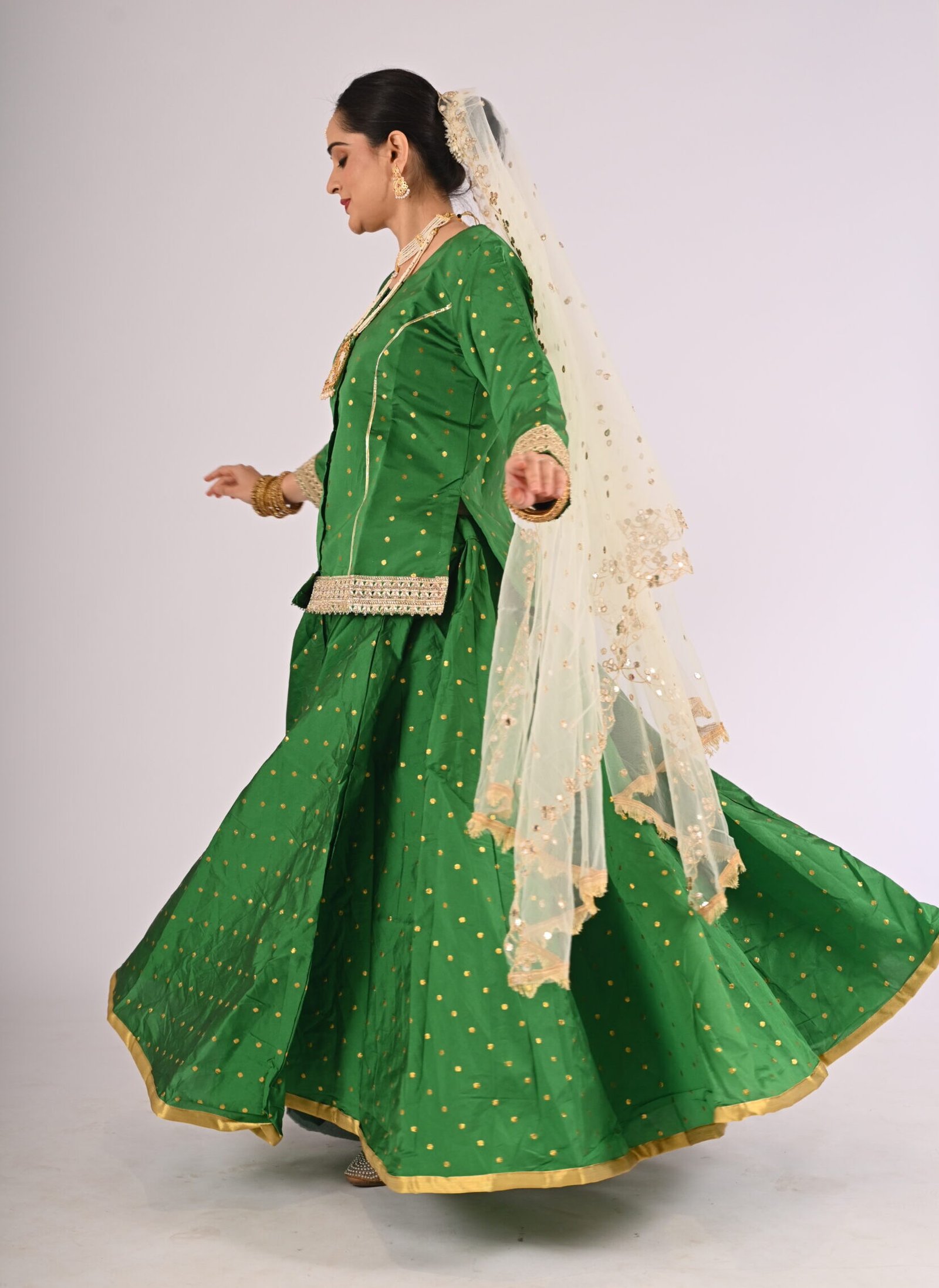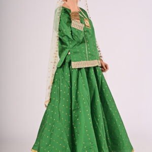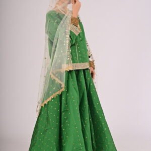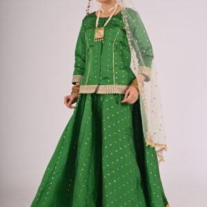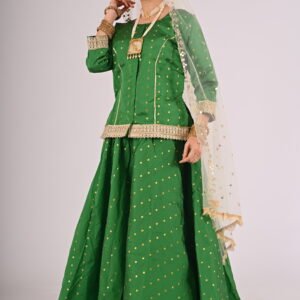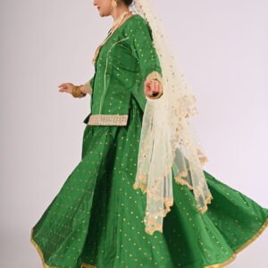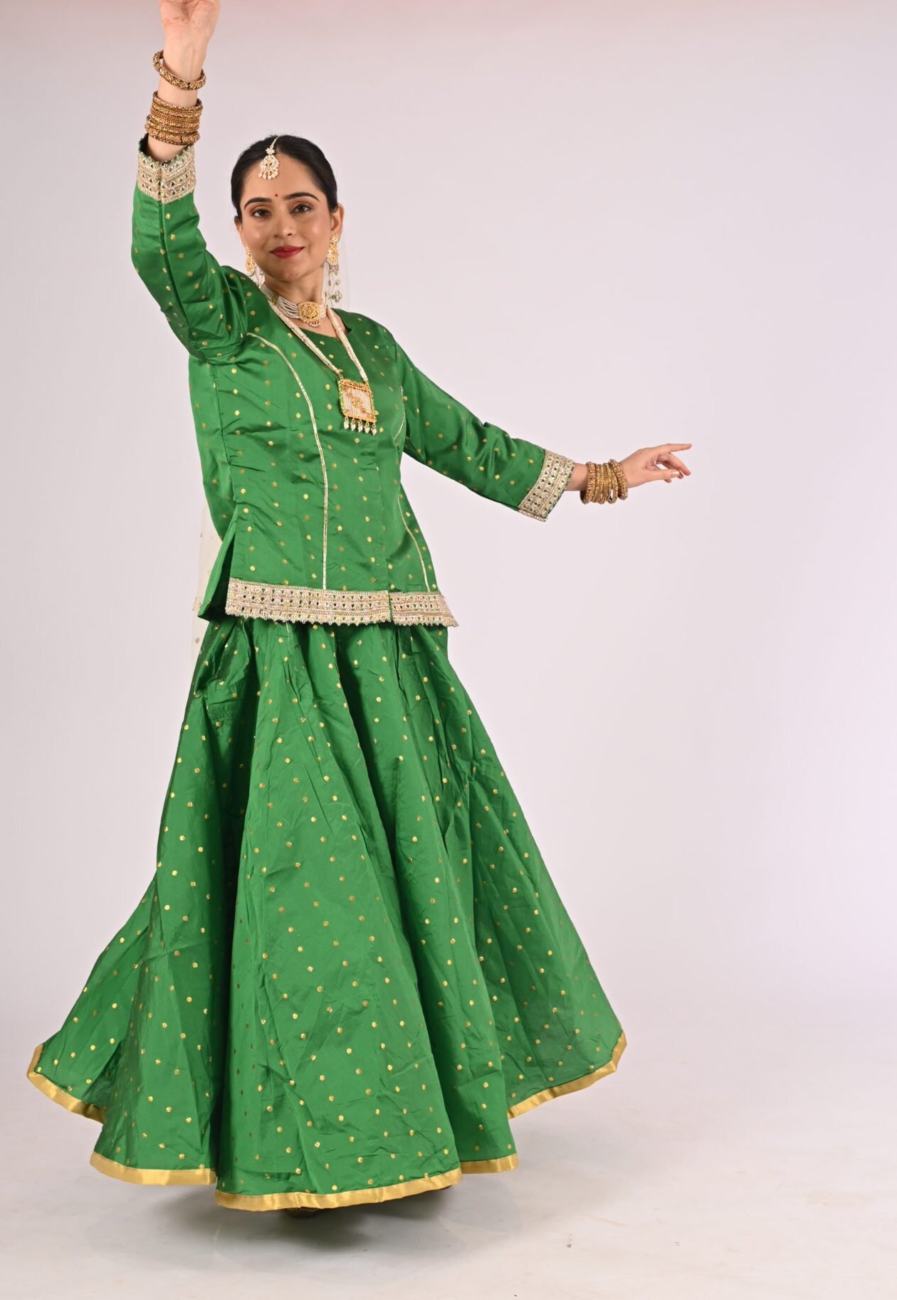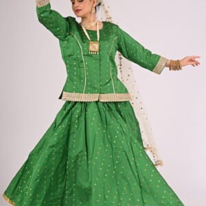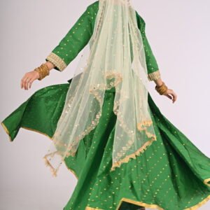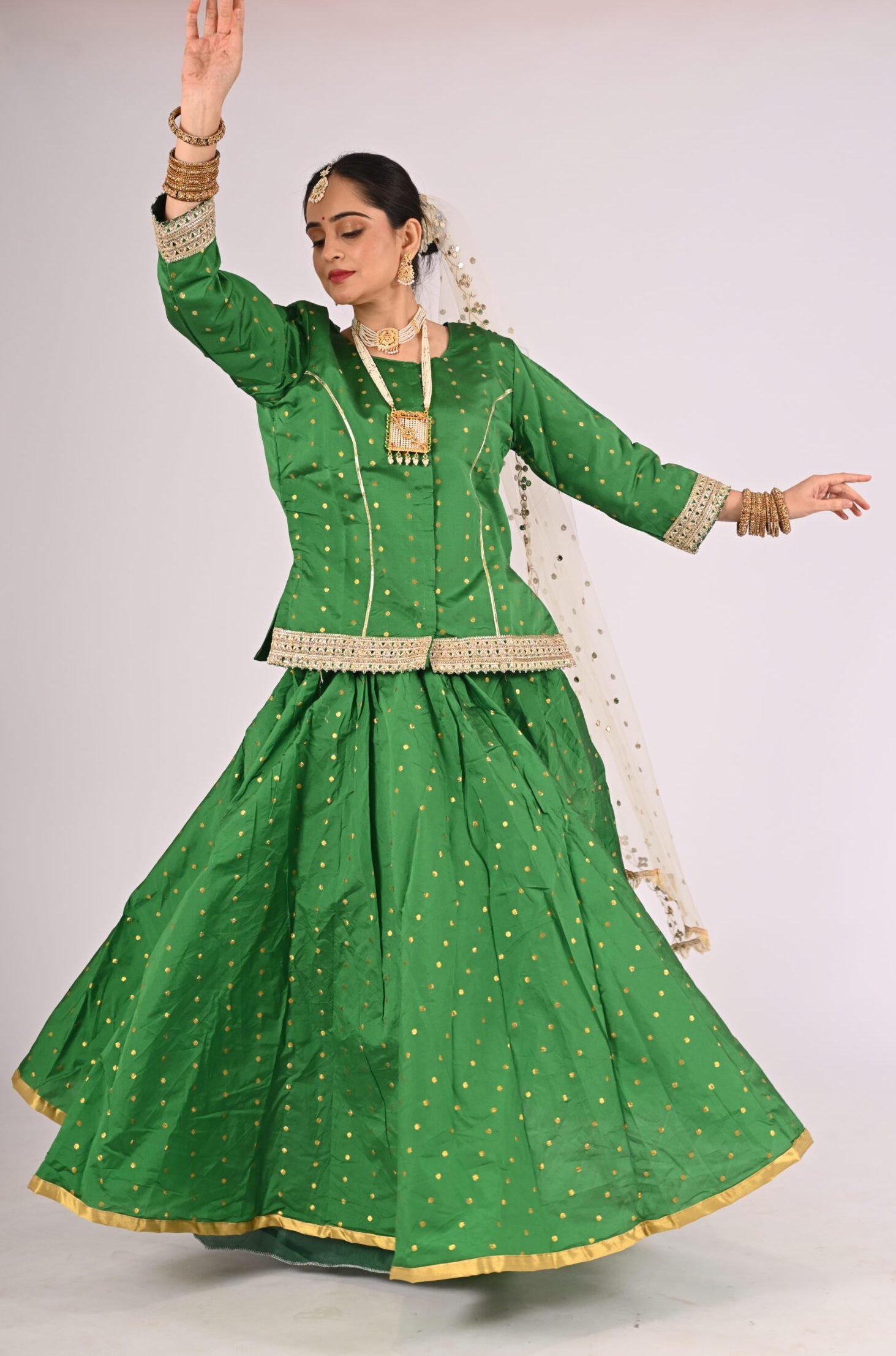 Our Light Green Chanderi Kathak Lehenga is crafted to help you embody grace and refinement. Designed for traditional performances and special occasions, this lehenga blends the sheer beauty of Chanderi fabric with comfortable wearability. The delicate light green color evokes serenity and elegance, making it the perfect choice to showcase your artistic movements and cultural expressions.