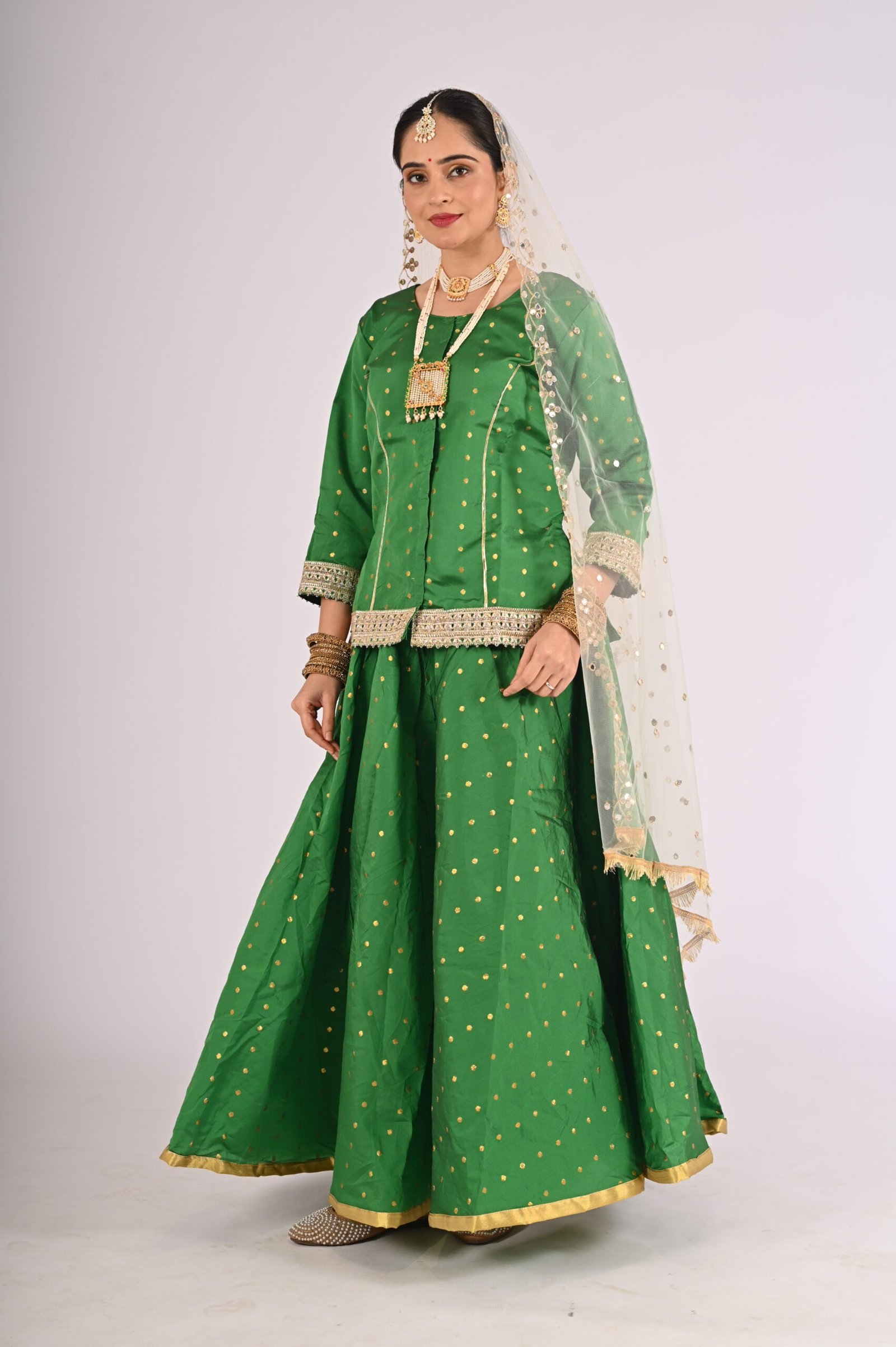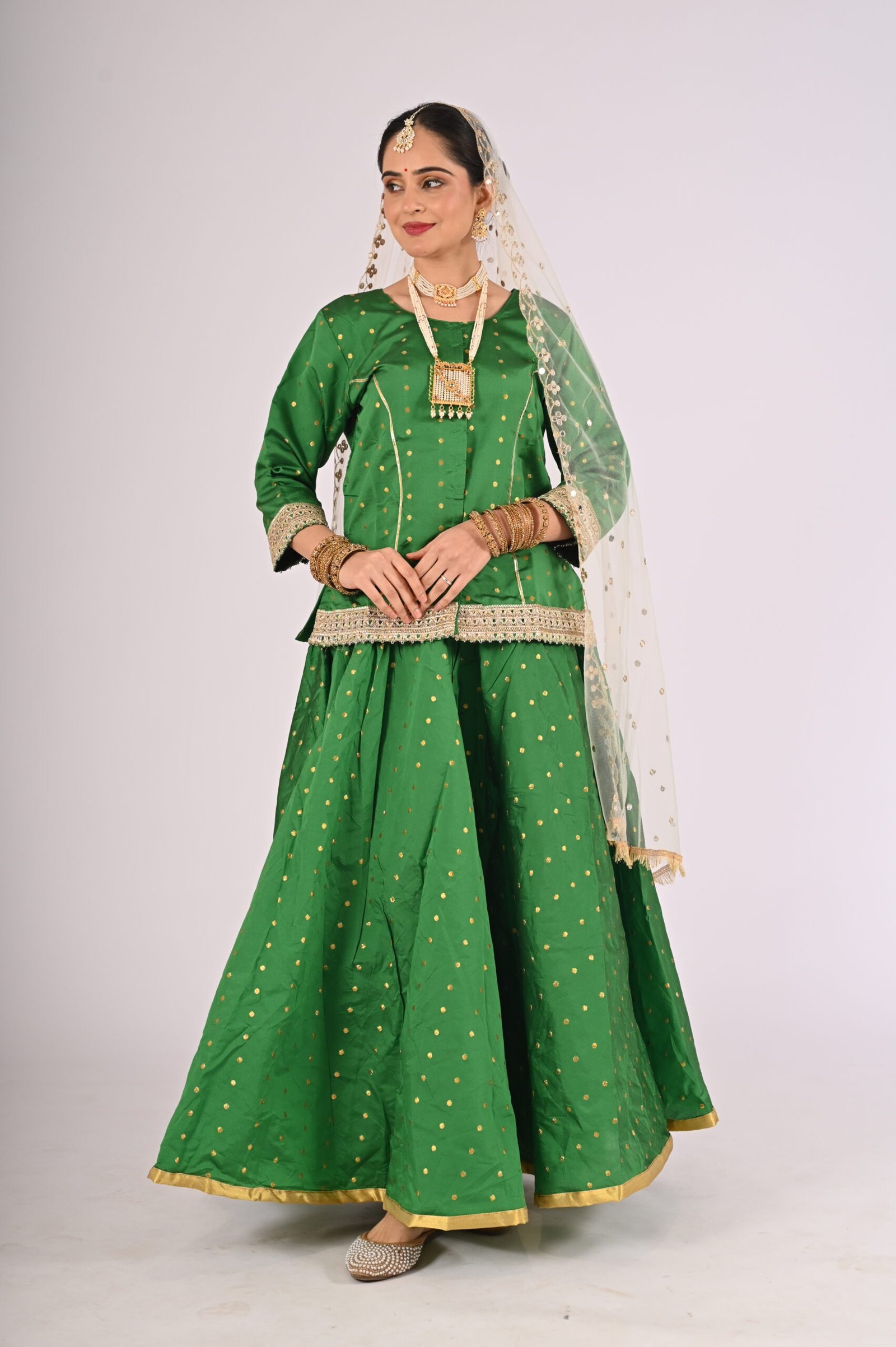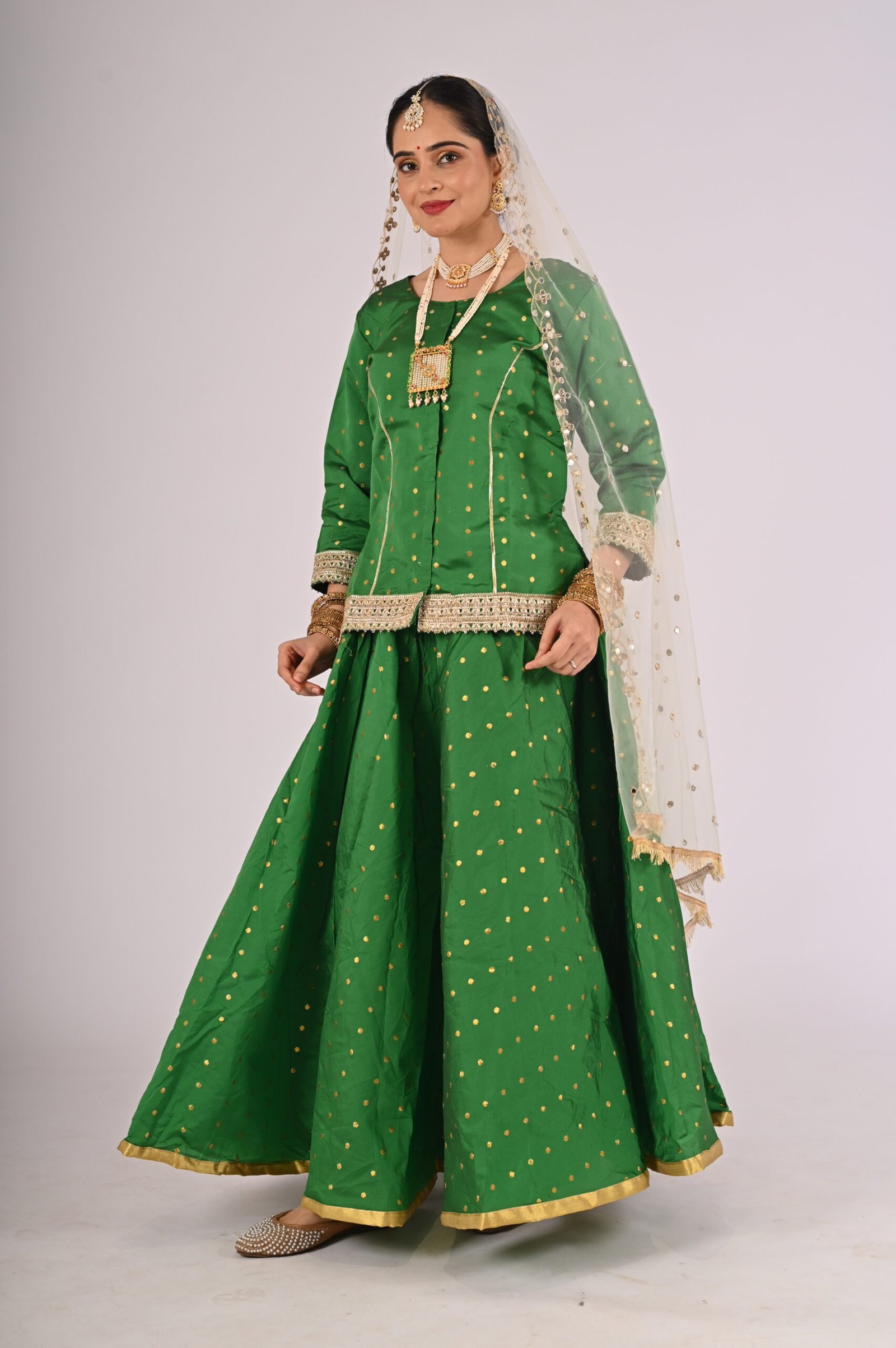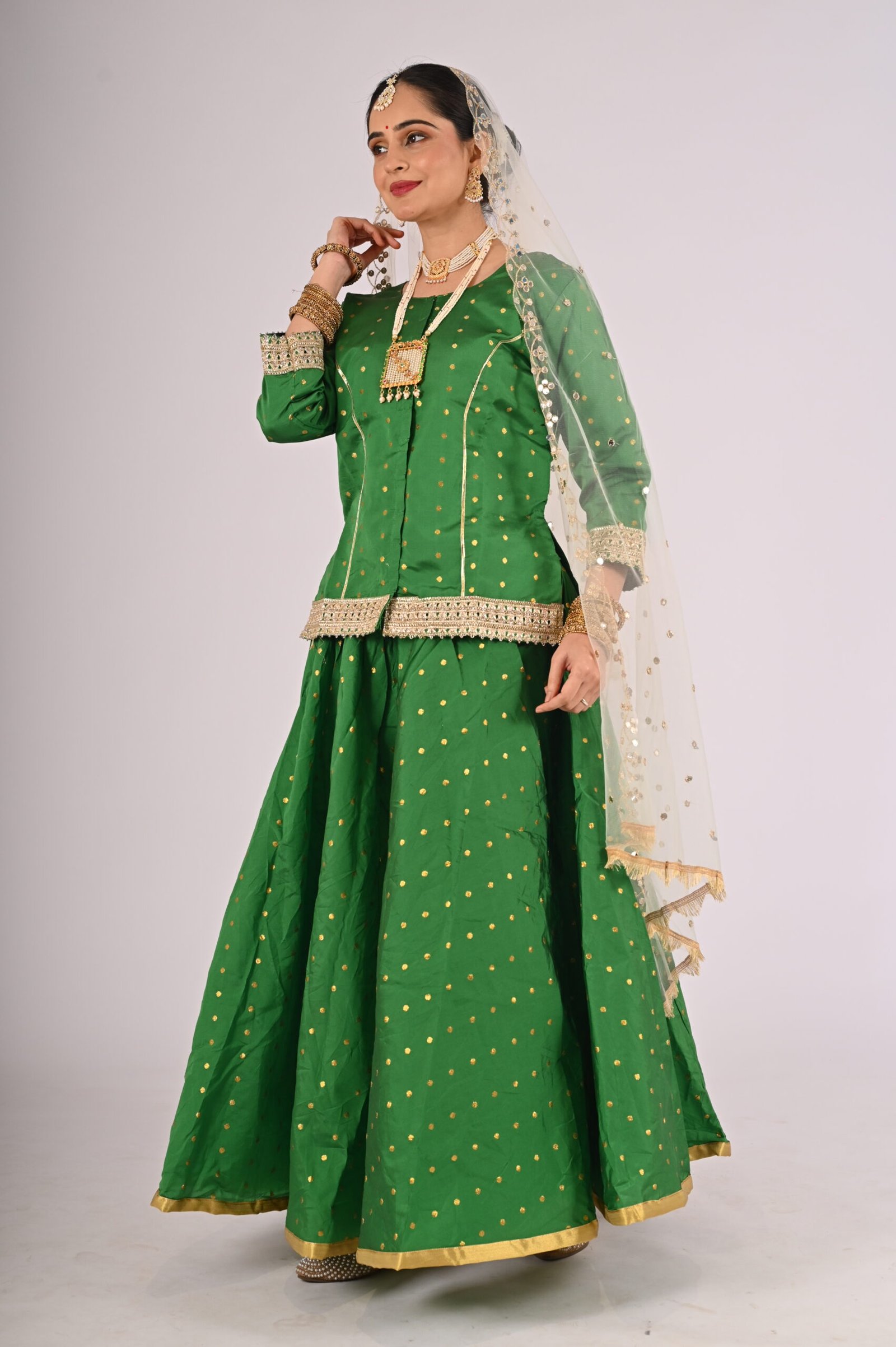 Our Light Green Chanderi Kathak Lehenga is crafted to help you embody grace and refinement. Designed for traditional performances and special occasions, this lehenga blends the sheer beauty of Chanderi fabric with comfortable wearability. The delicate light green color evokes serenity and elegance, making it the perfect choice to showcase your artistic movements and cultural expressions.