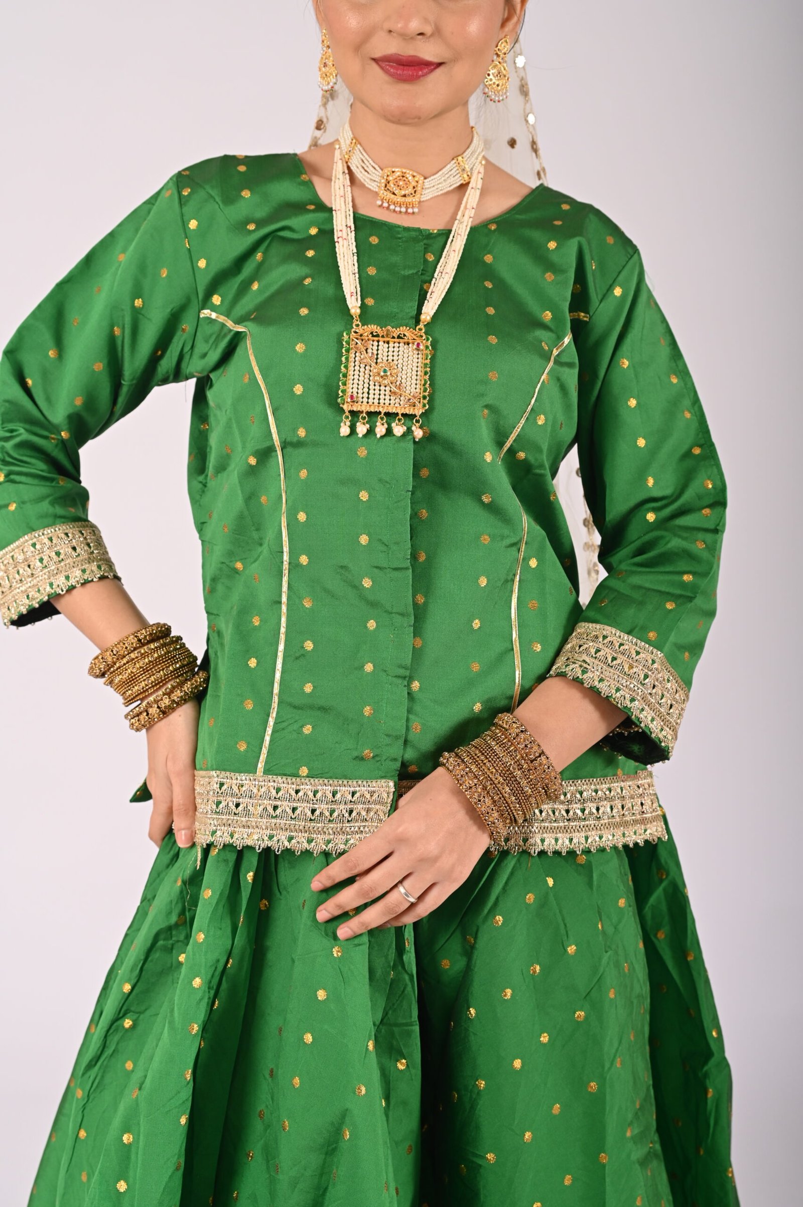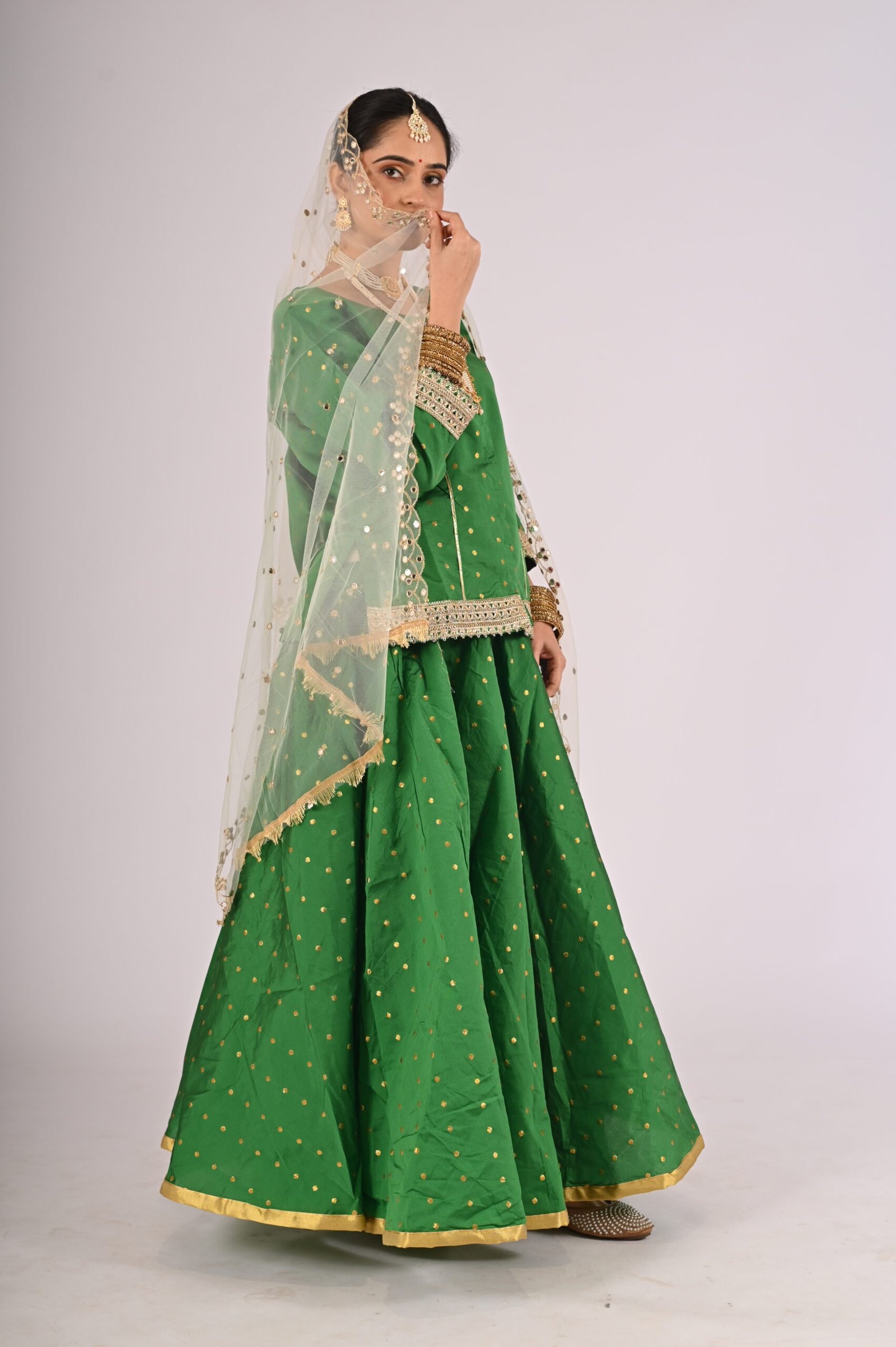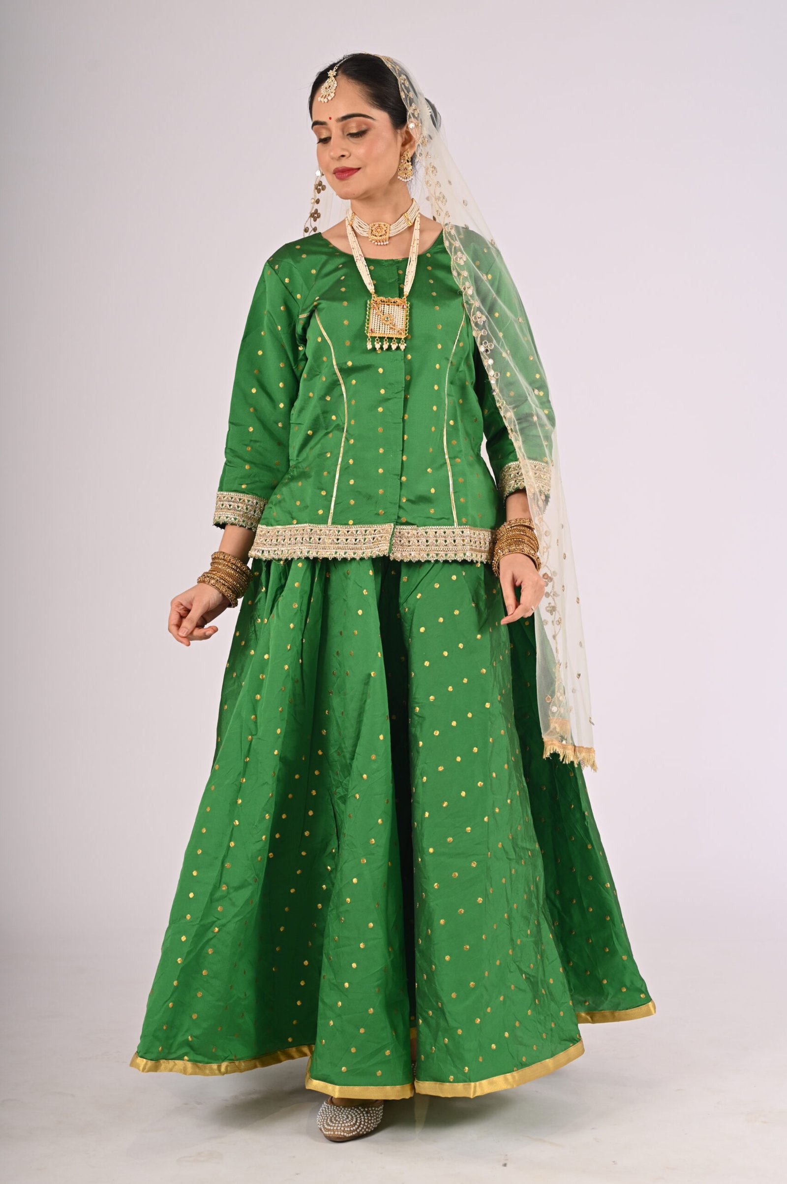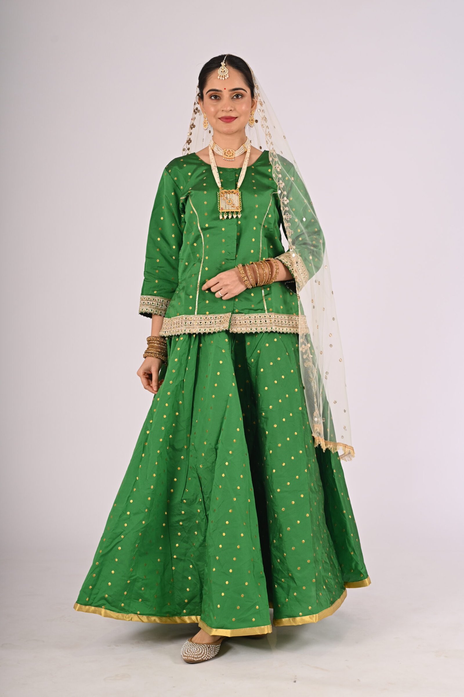Our Light Green Chanderi Kathak Lehenga is crafted to help you embody grace and refinement. Designed for traditional performances and special occasions, this lehenga blends the sheer beauty of Chanderi fabric with comfortable wearability. The delicate light green color evokes serenity and elegance, making it the perfect choice to showcase your artistic movements and cultural expressions.