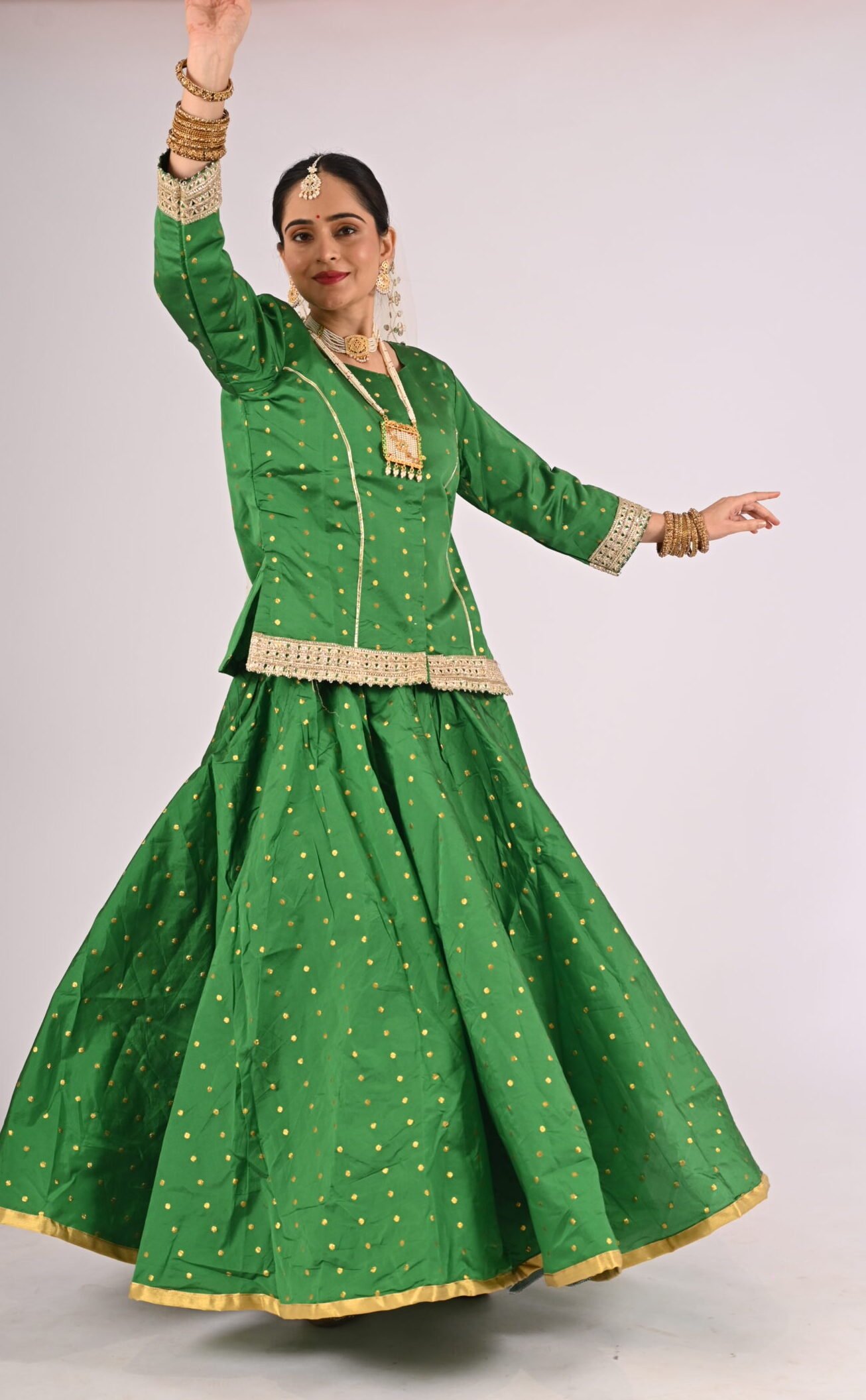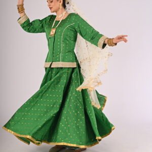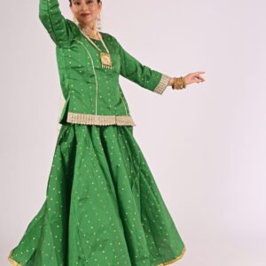 This stunning lehenga boasts intricate design elements that highlight the craftsmanship behind the attire. The light green blouse complements the lehenga seamlessly, enhancing the overall aesthetic appeal. Paired with an elegantly embroidered dupatta, this ensemble is a complete package, reflecting timeless tradition with modern sophistication. Whether you’re performing a Kathak recital or attending a festival, the luxurious detail and ethereal texture will have you feeling confident and radiant.