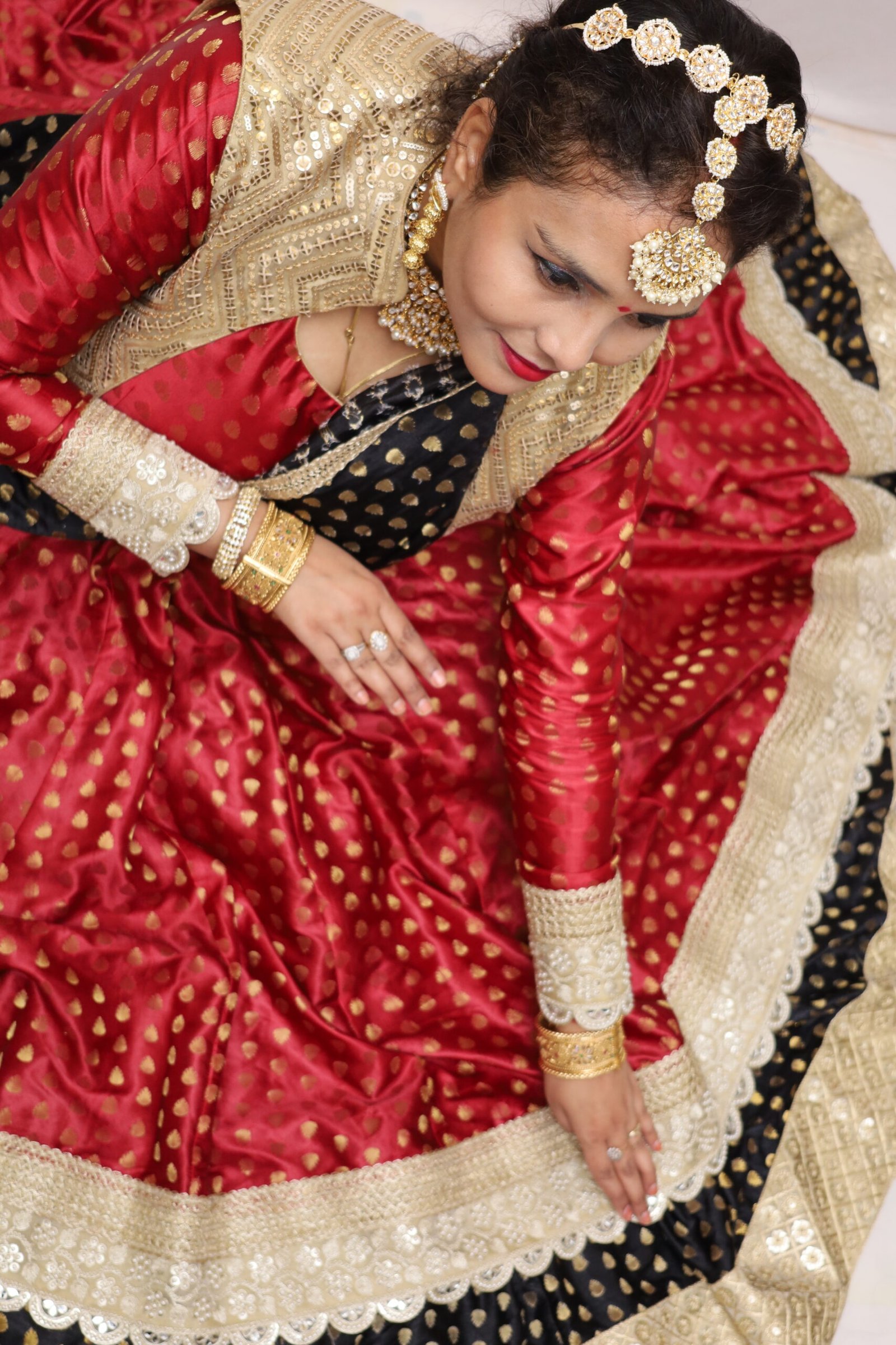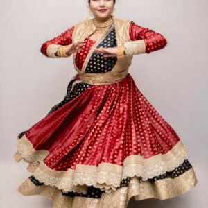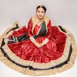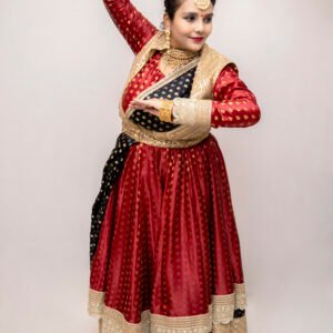 Unveiling a breathtakingly regal ensemble inspired by the classic Madhuri Bhool Bhulaiya aesthetic. This maroon Anarkali with black lehenga, jacket, and dupatta seamlessly brings vintage charm to contemporary fashion, making it a perfect fit for weddings, festive occasions, or cultural celebrations. With its fine craftsmanship and intricate detailing, this outfit gives you an effortlessly graceful and sophisticated look.