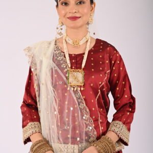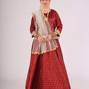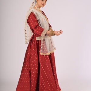 The Maroon Chanderi Kathak Lehenga boasts meticulous craftsmanship, ensuring every detail adds to its aesthetic charm. The lehenga’s smooth texture and lightweight construction allow for effortless movement, making it a dream attire for dancers and wearers. The blouse features a well-fitted design with elegant patterns, while the matching maroon dupatta adds a finishing touch to the regal look.