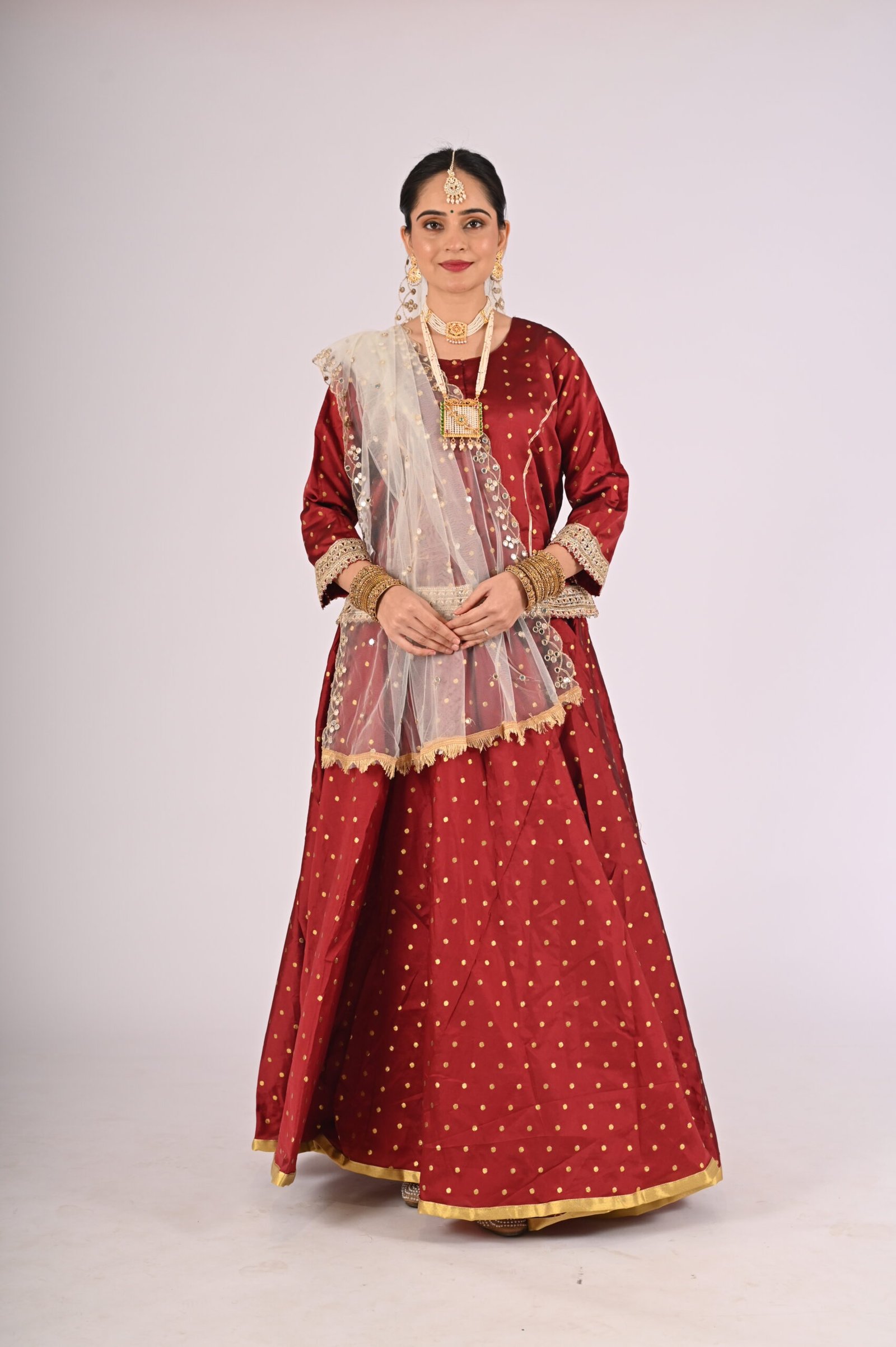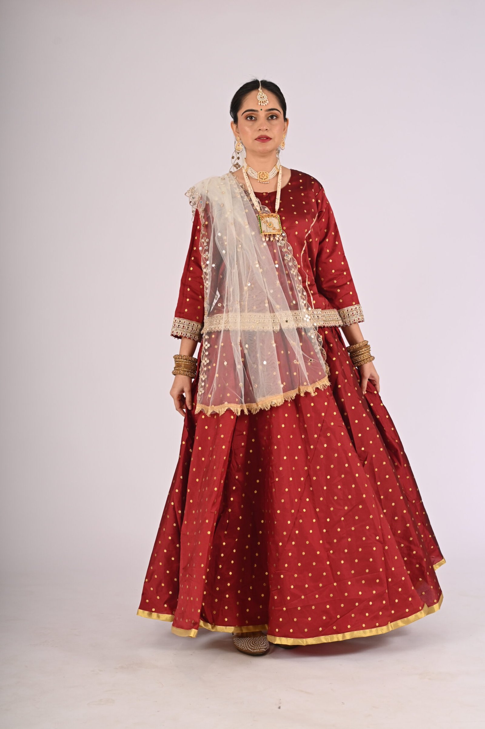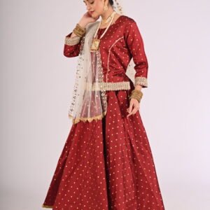 Explore unmatched elegance and comfort with the Maroon Chanderi Kathak Lehenga that blends functionality and beauty seamlessly. Choose this set to embrace a classic yet captivating appearance for your special moments.