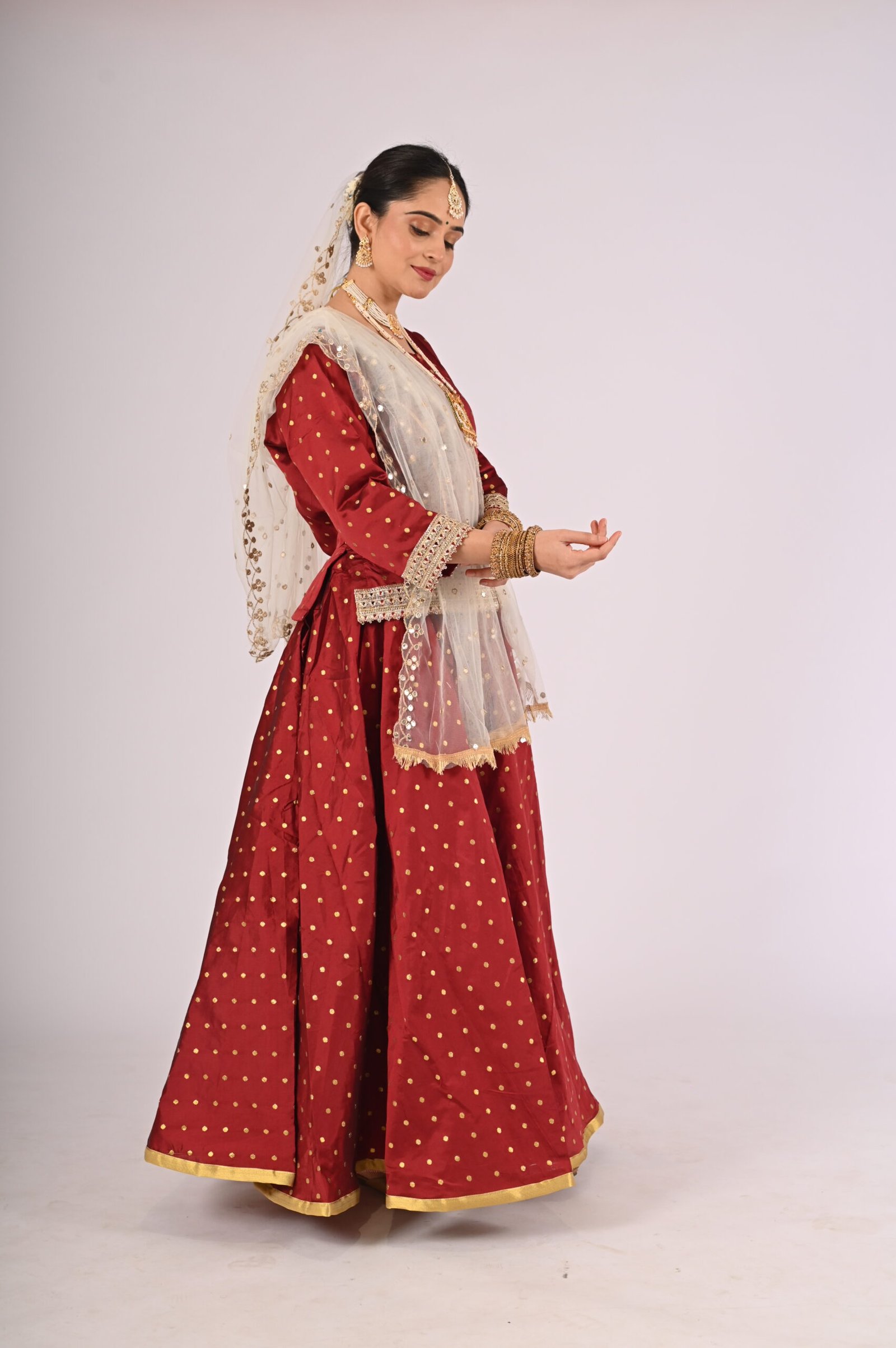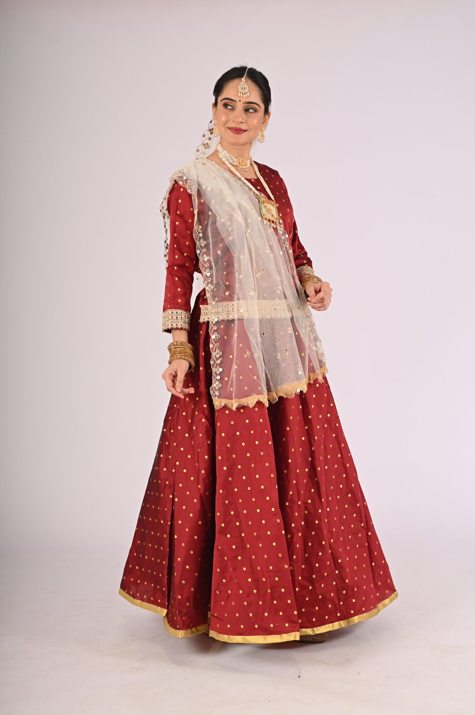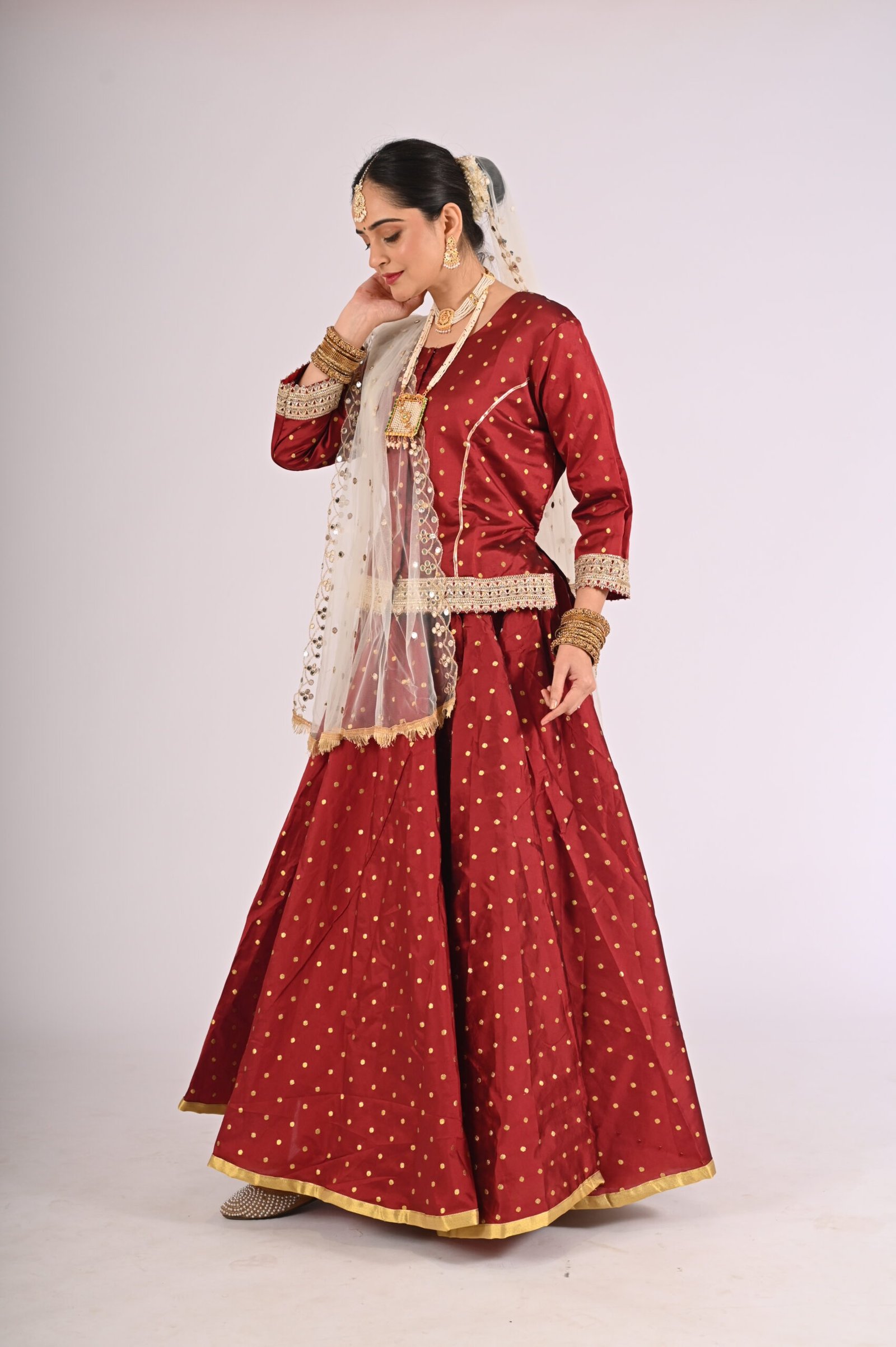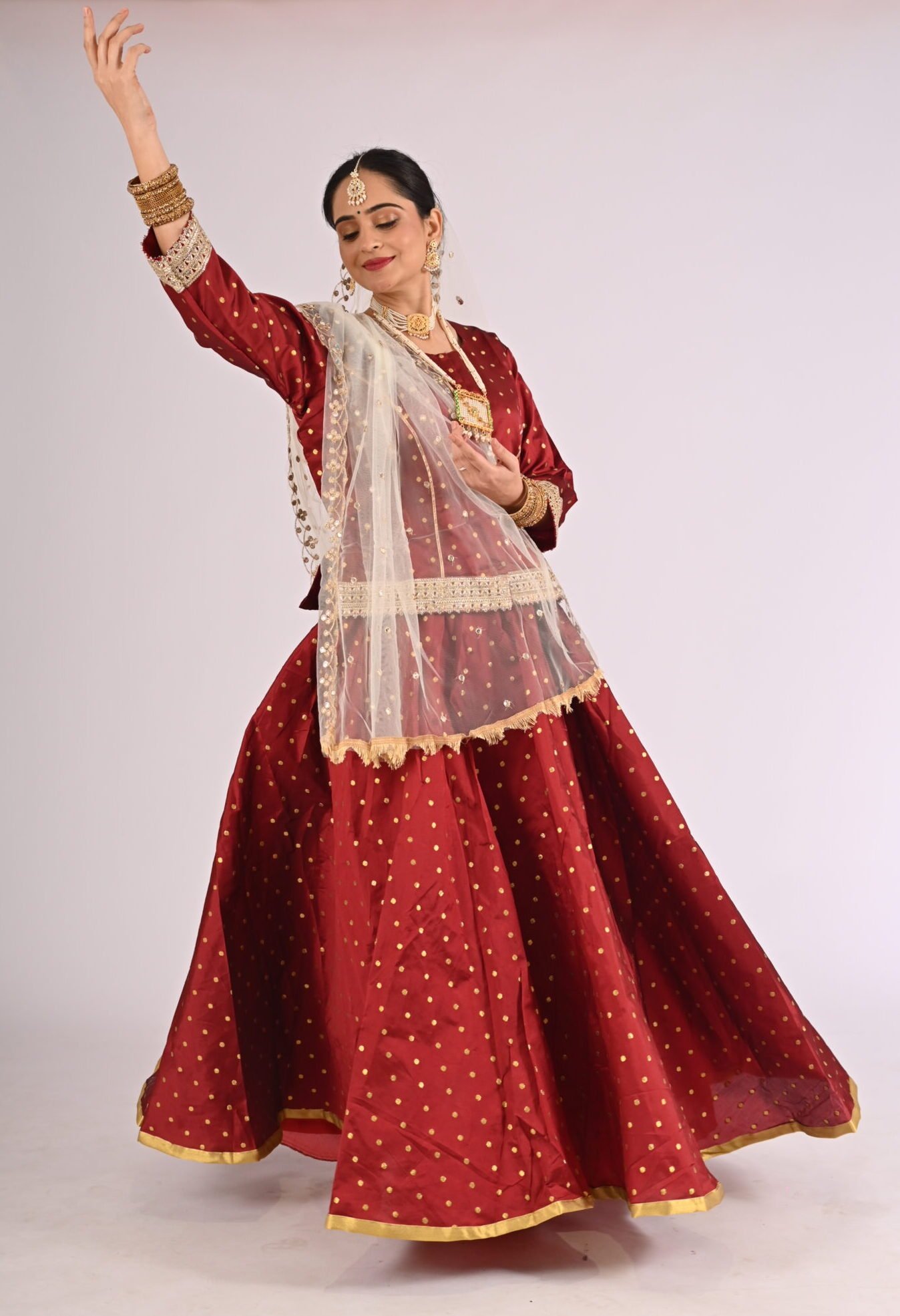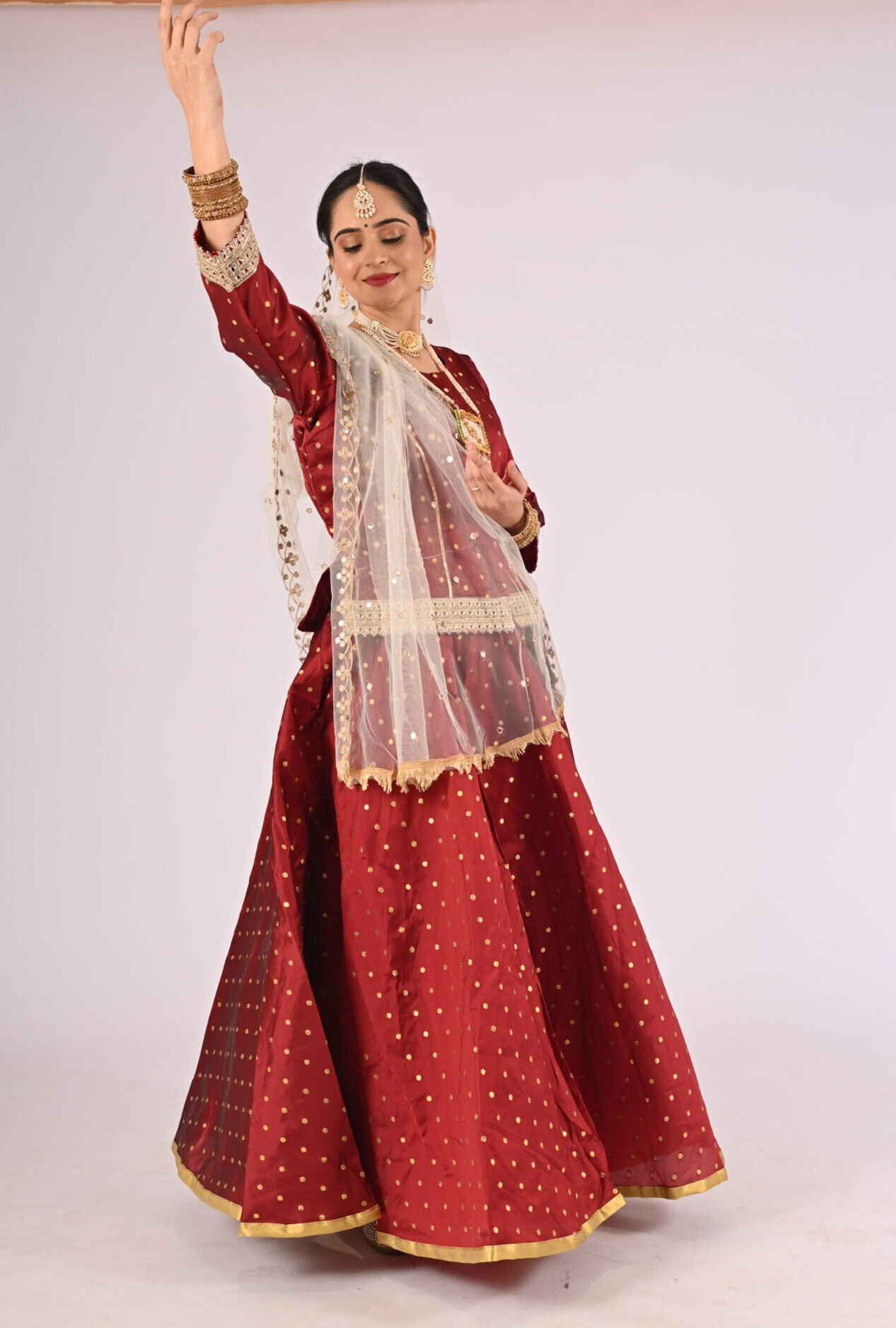 Whether you’re performing traditional Kathak routines, attending wedding ceremonies, or celebrating festivals, this maroon lehenga set is a versatile choice that caters to diverse occasions. Its bold maroon shade elegantly complements different accessories and makeup styles, letting you personalize your look with ease.