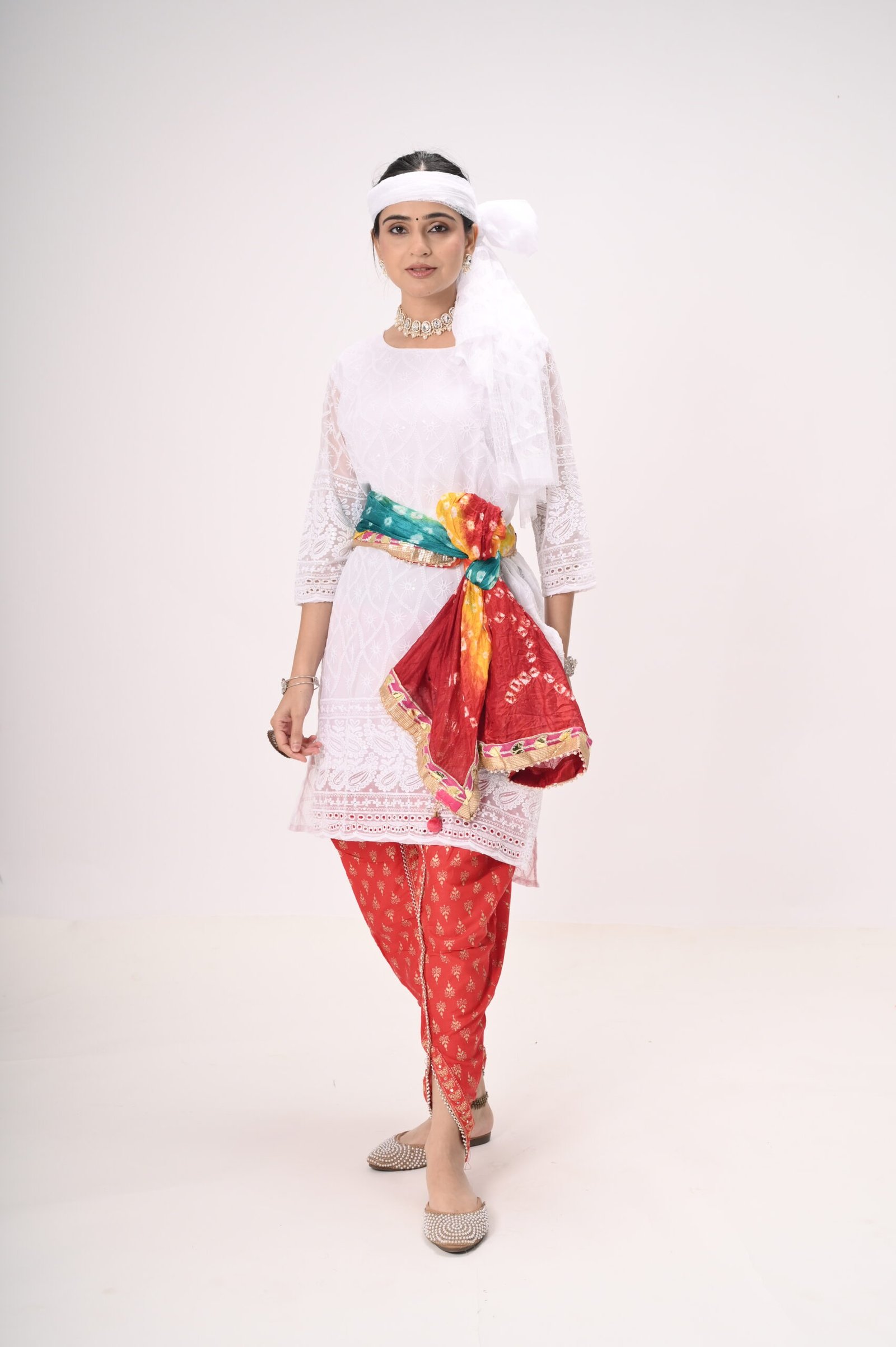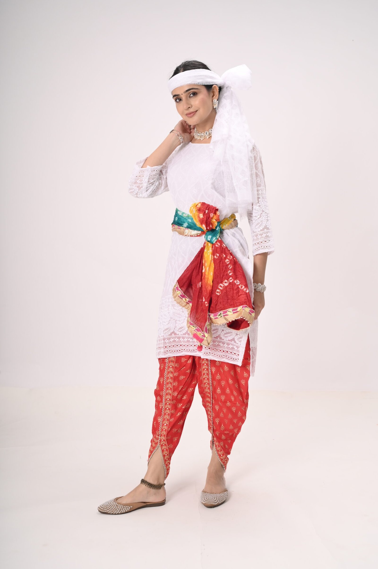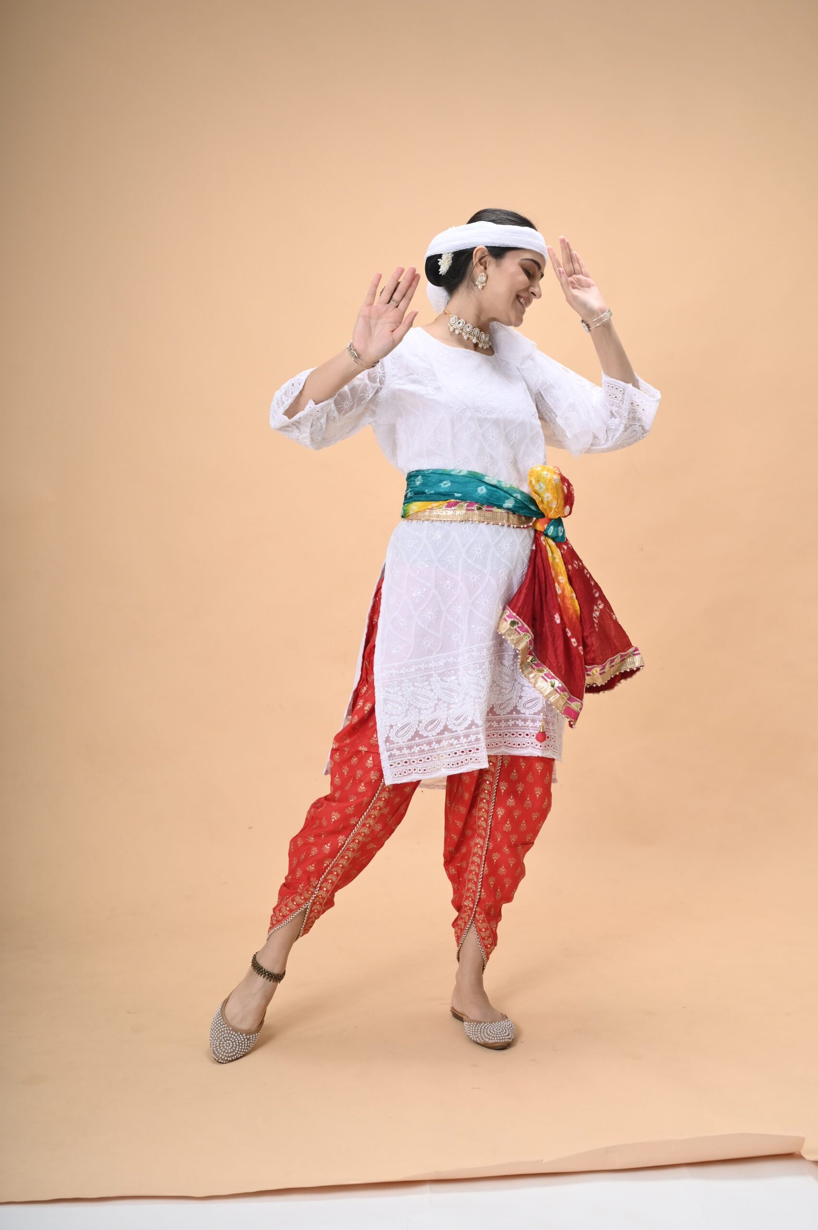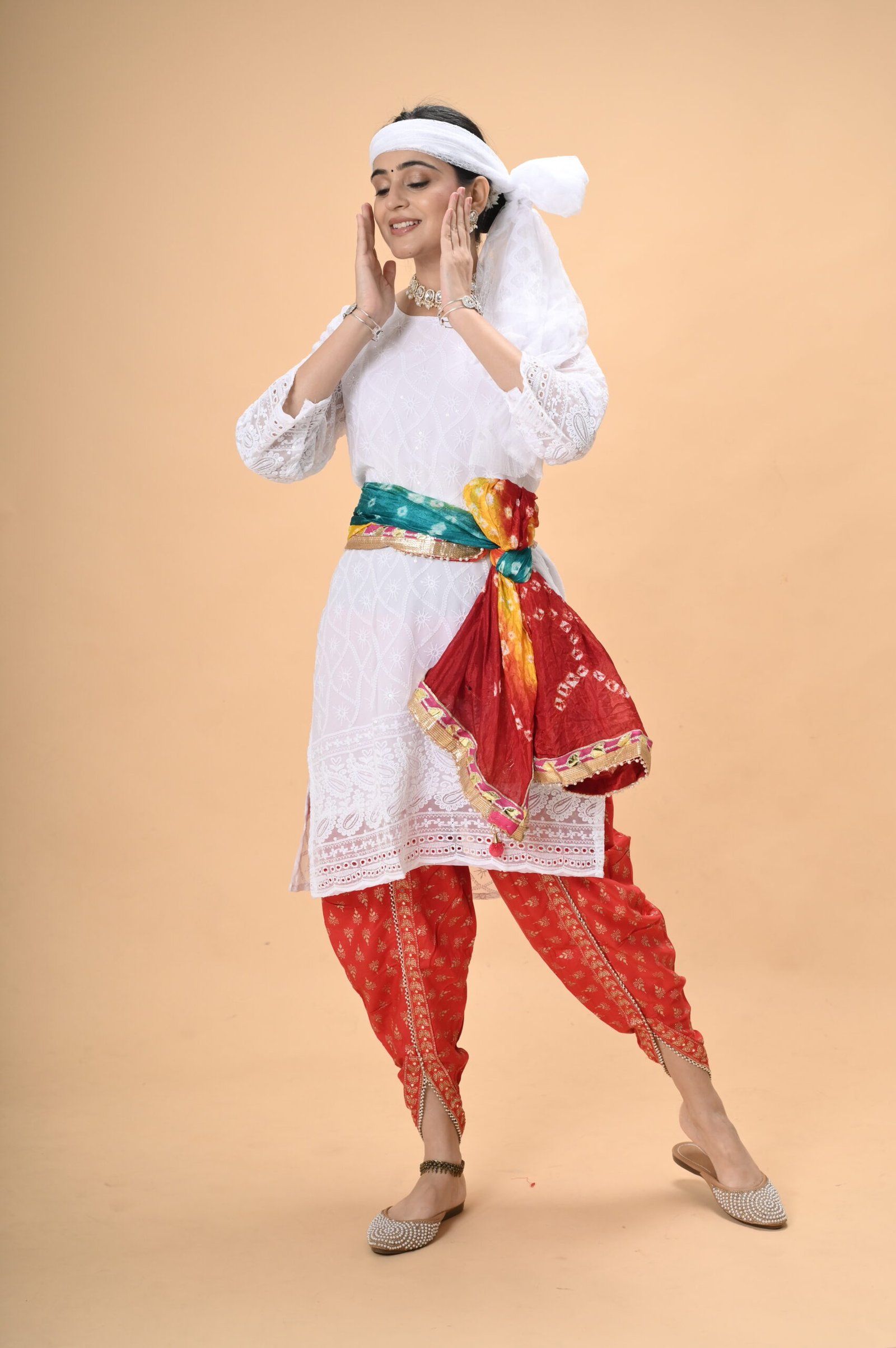 Traditional White Kurta with Red Banarasi Salwar & Bandhani Waistbelt – Folk Dance Costume