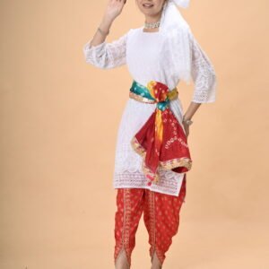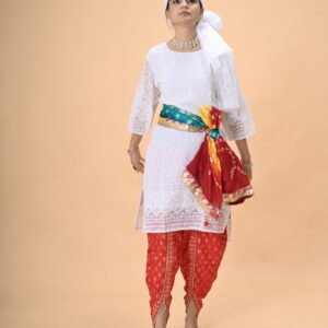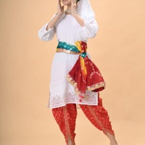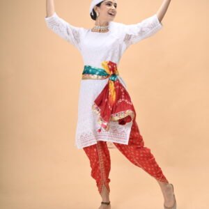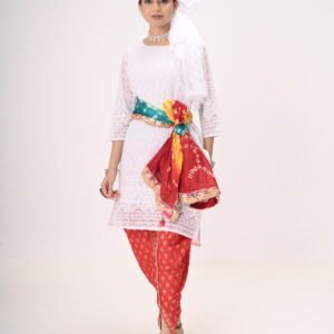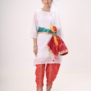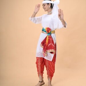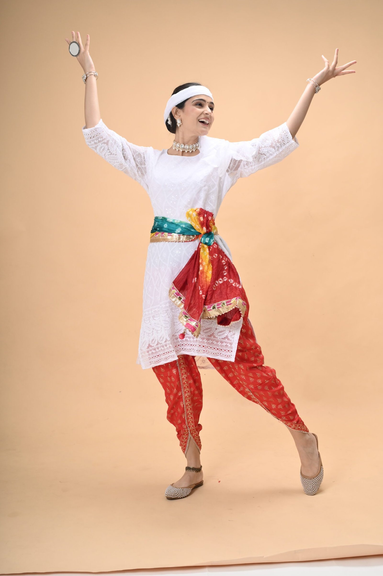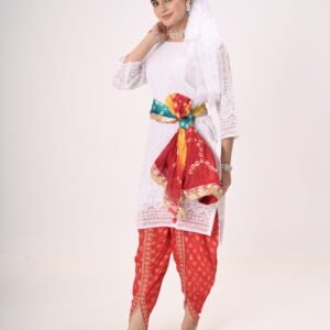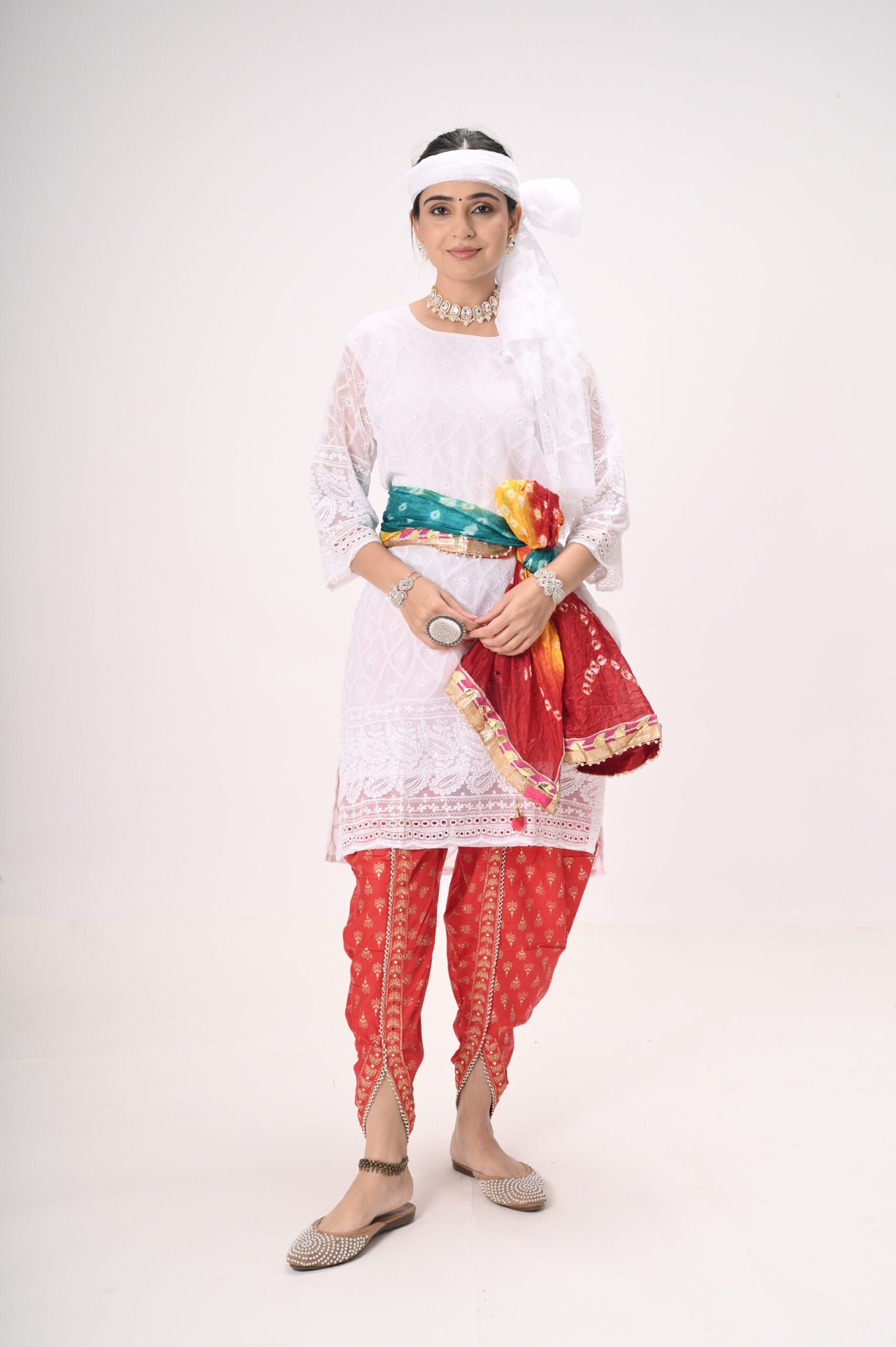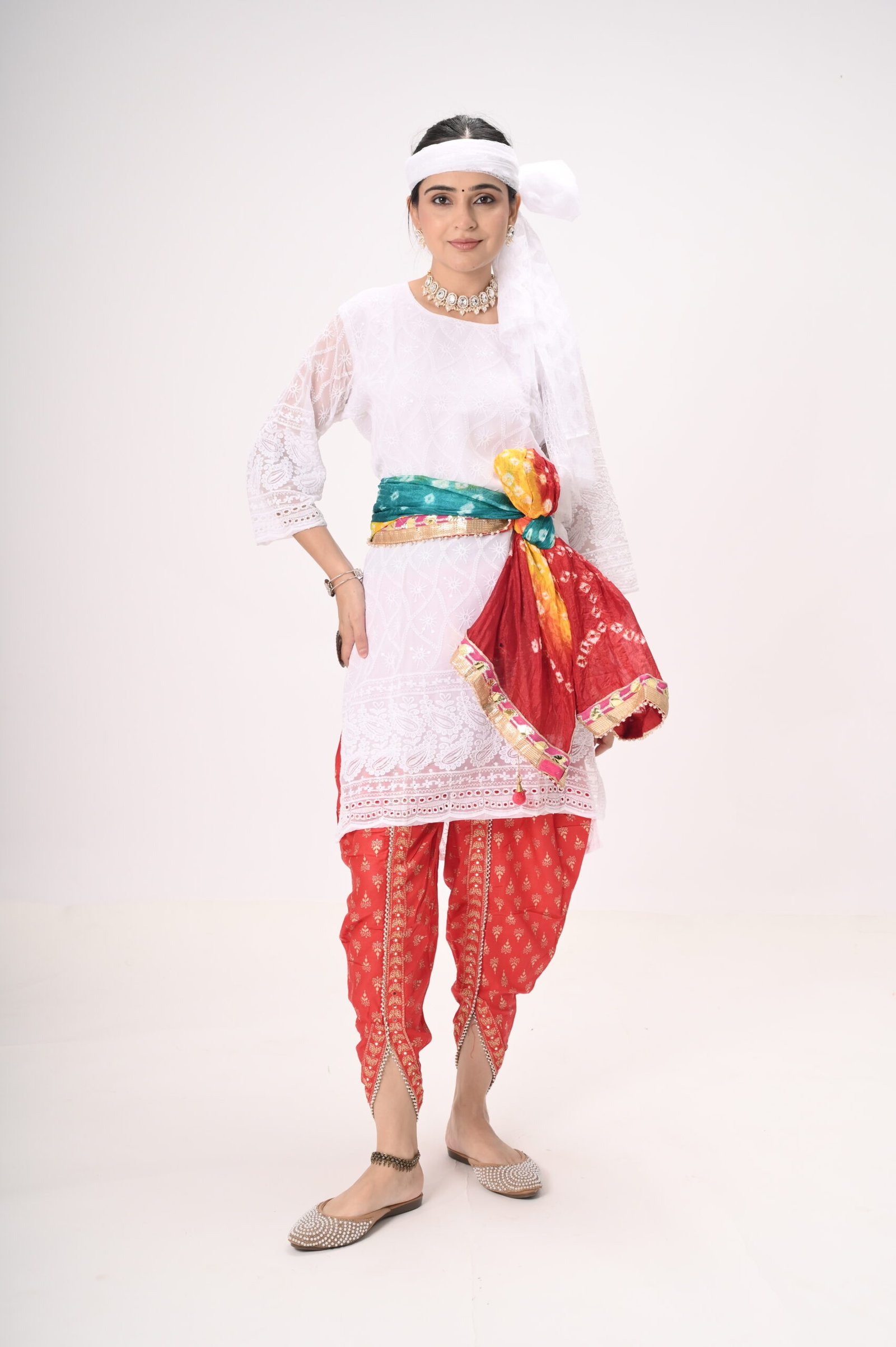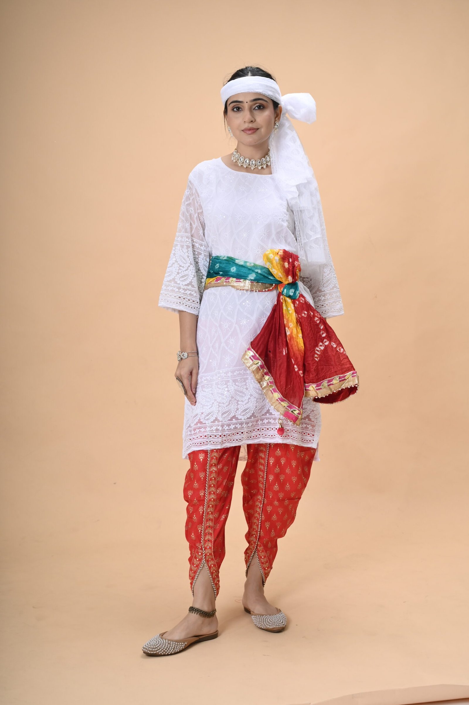Traditional White Kurta with Red Banarasi Salwar & Bandhani Waistbelt – Folk Dance Costume