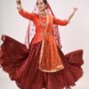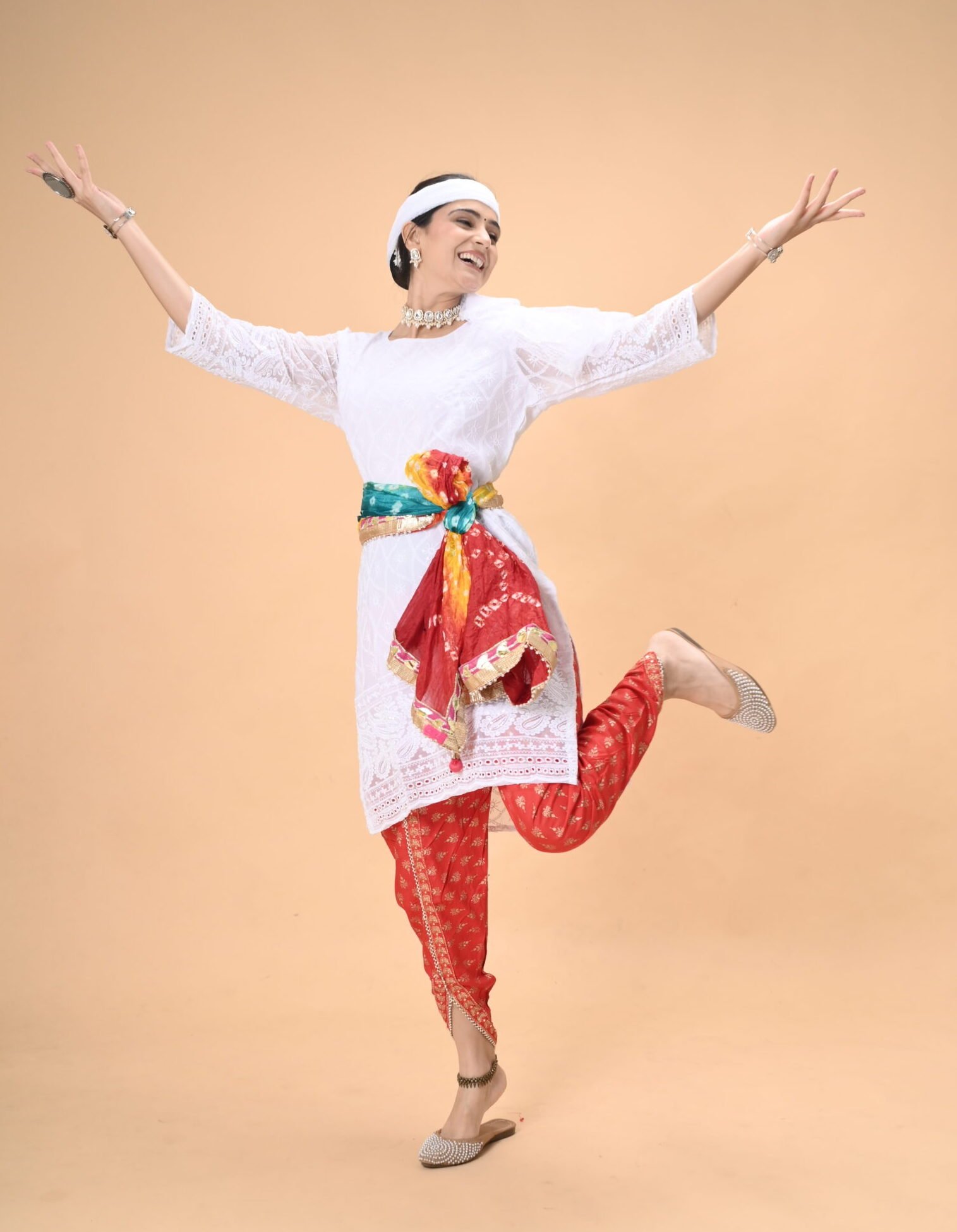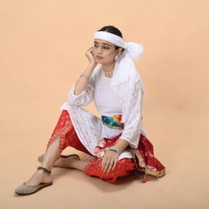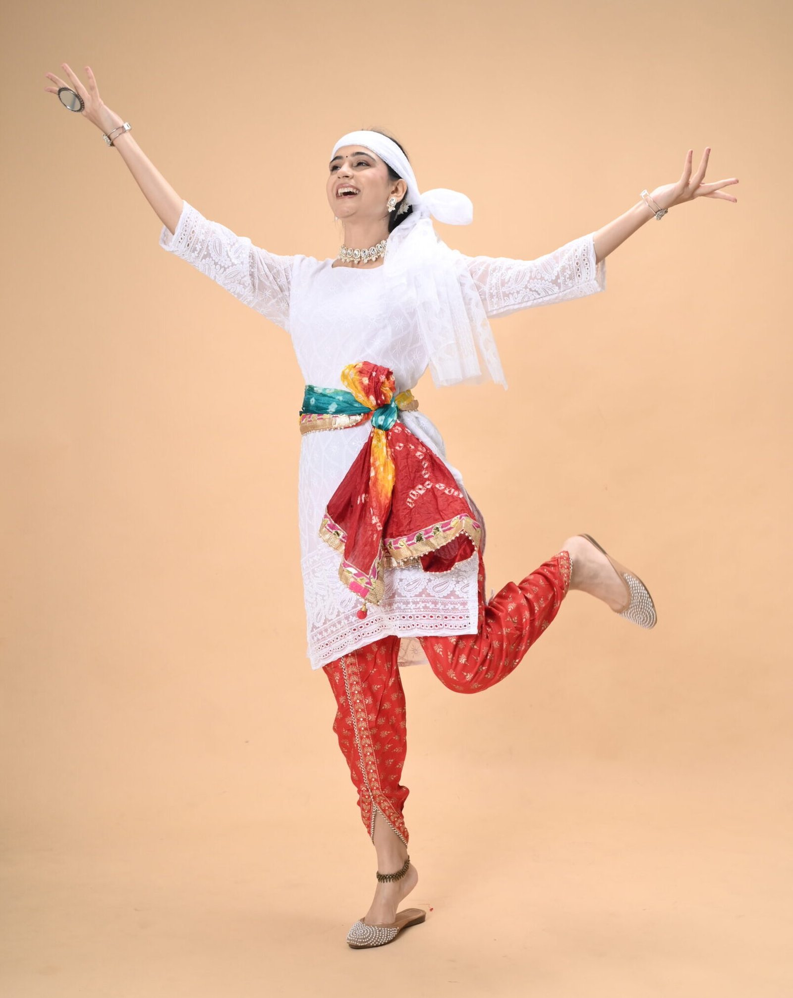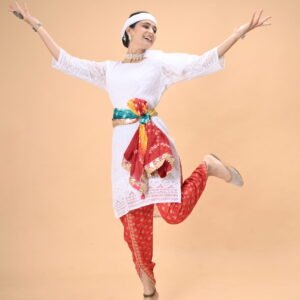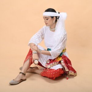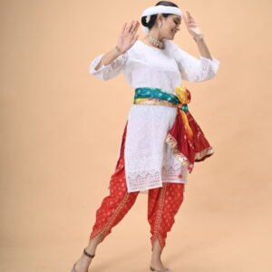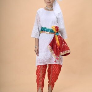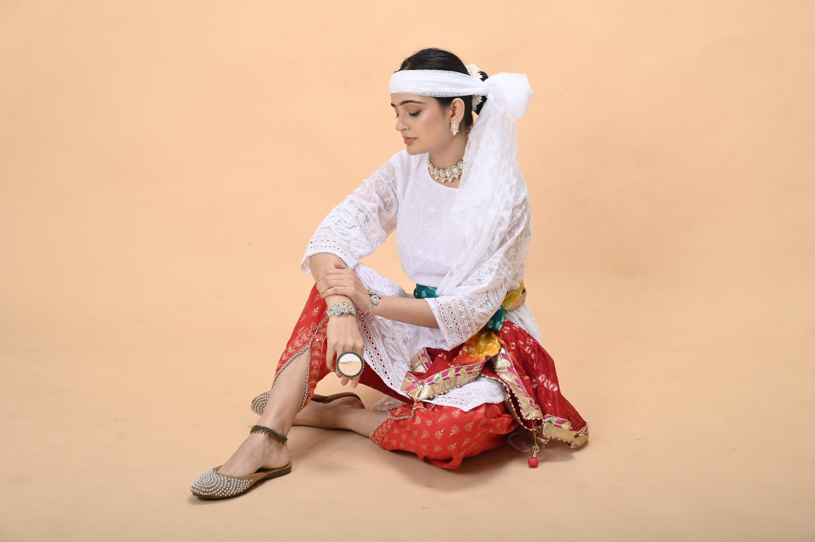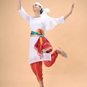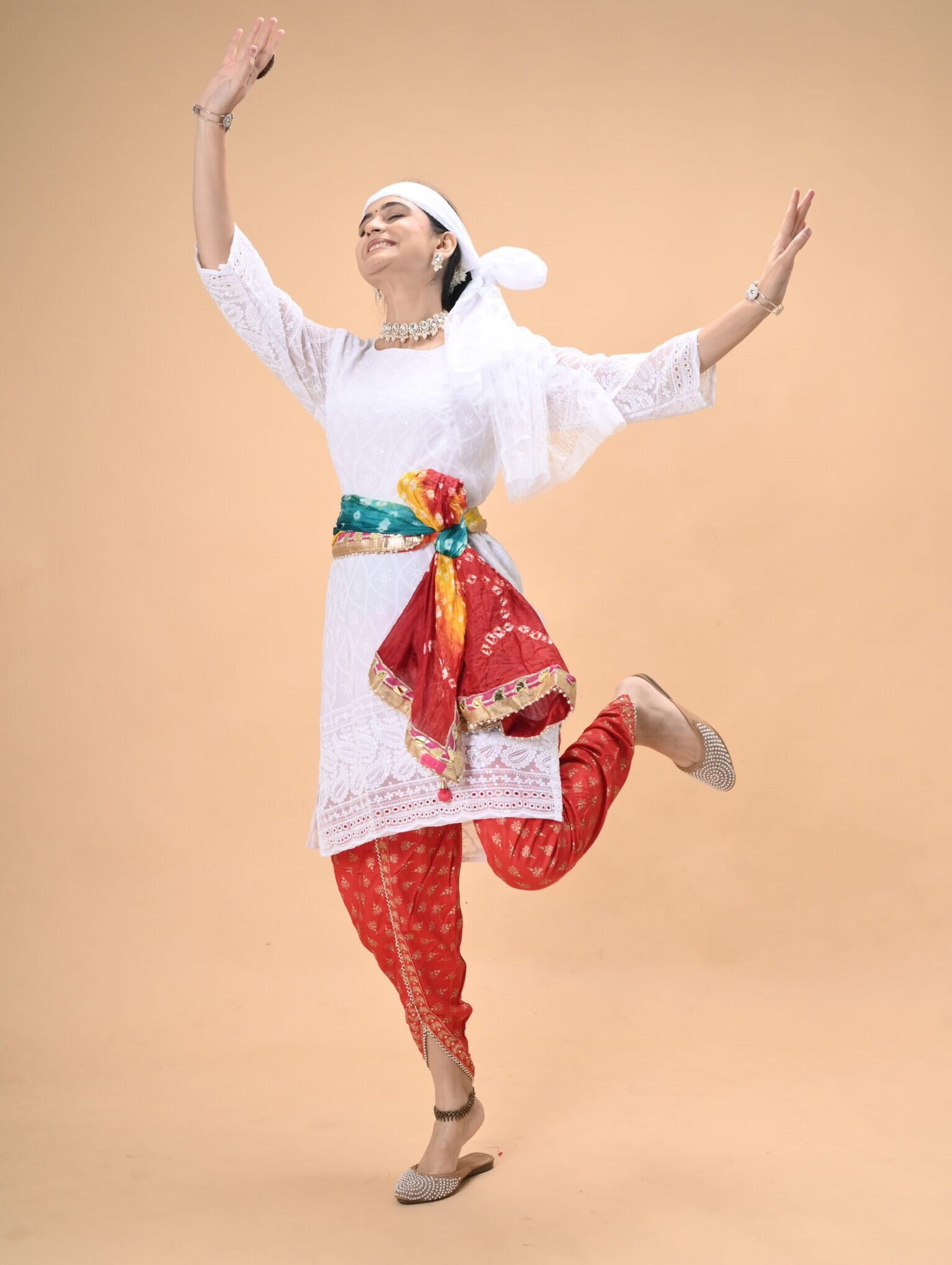 Traditional White Kurta with Red Banarasi Salwar & Bandhani Waistbelt – Folk Dance Costume
