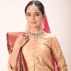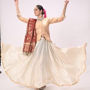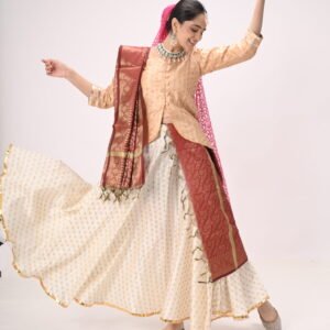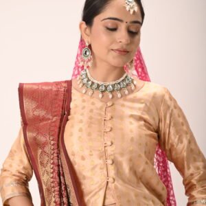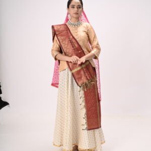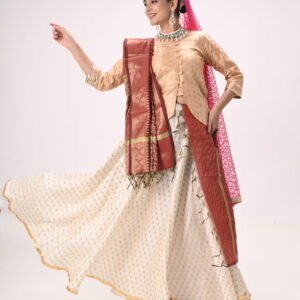 Step into a world of regal charm and timeless beauty with the Royal Beige-Gold Banarasi Anarkali Lehenga. This meticulously designed piece is a testament to India’s rich tradition of textile artistry, seamlessly blending classic craftsmanship with modern elegance. Whether you’re attending weddings, festive occasions, or grand celebrations, this Anarkali Lehenga promises to make you stand out with its captivating design and exquisite allure.