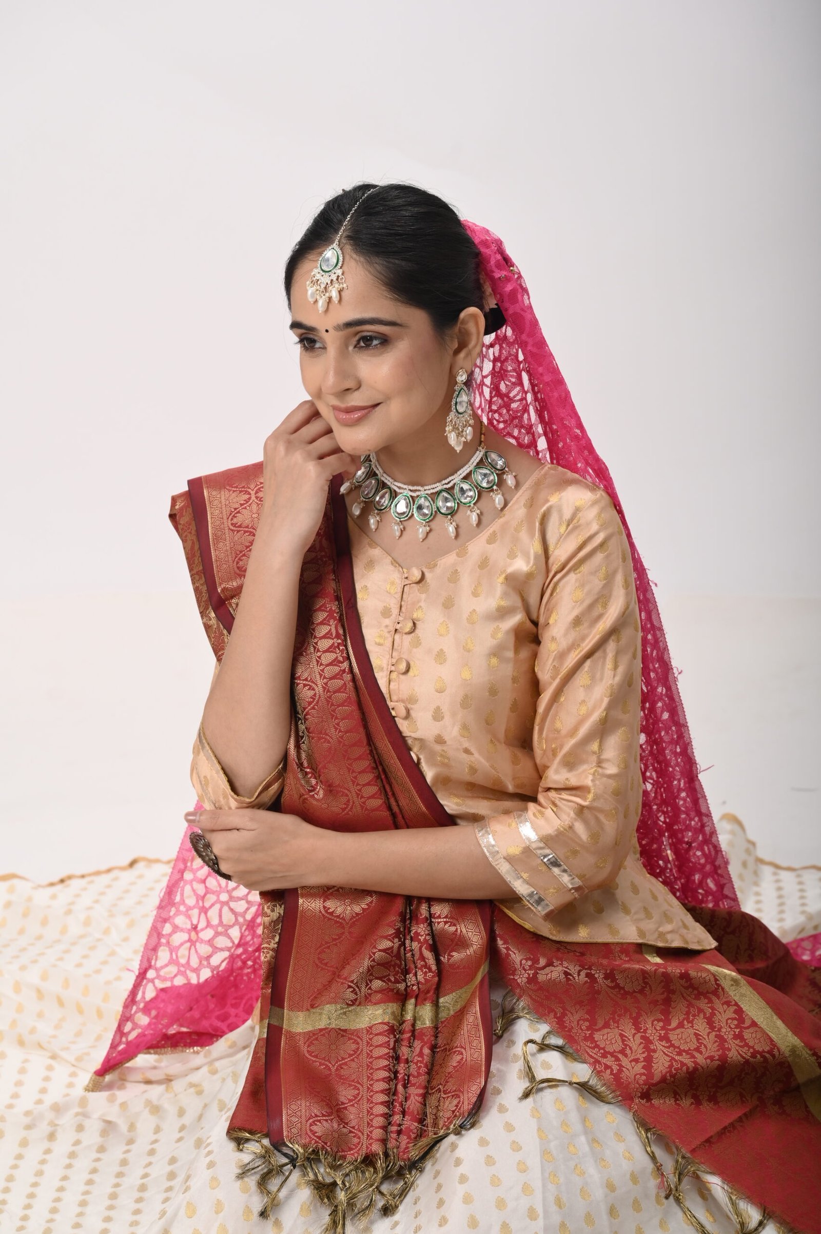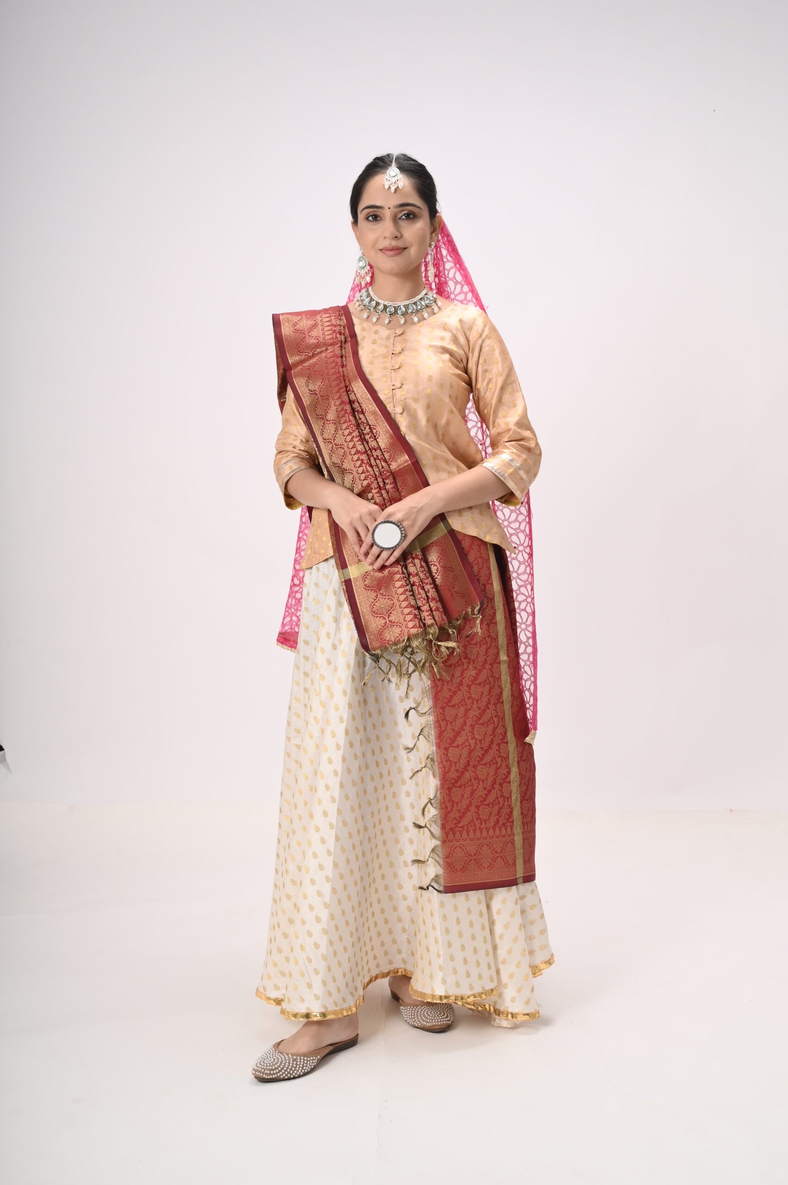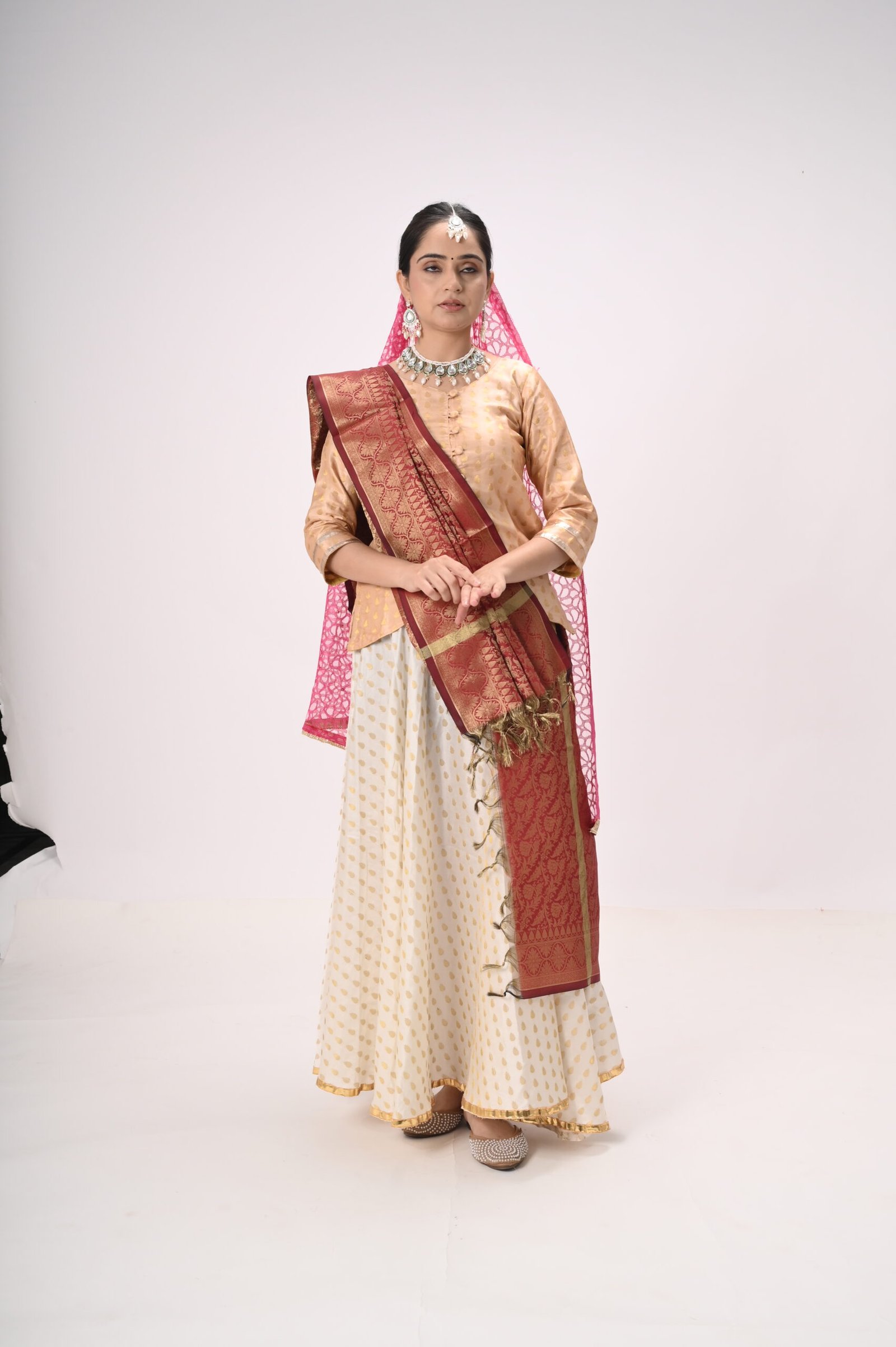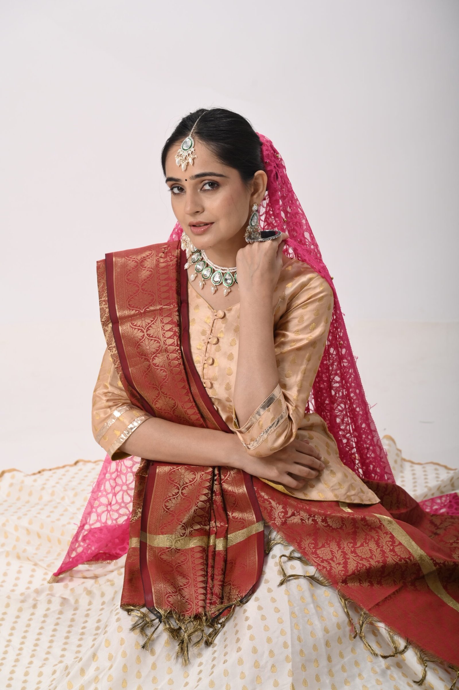 Beige-Gold Banarasi Lehenga Set with Maroon Dupatta & Pink Net Veil