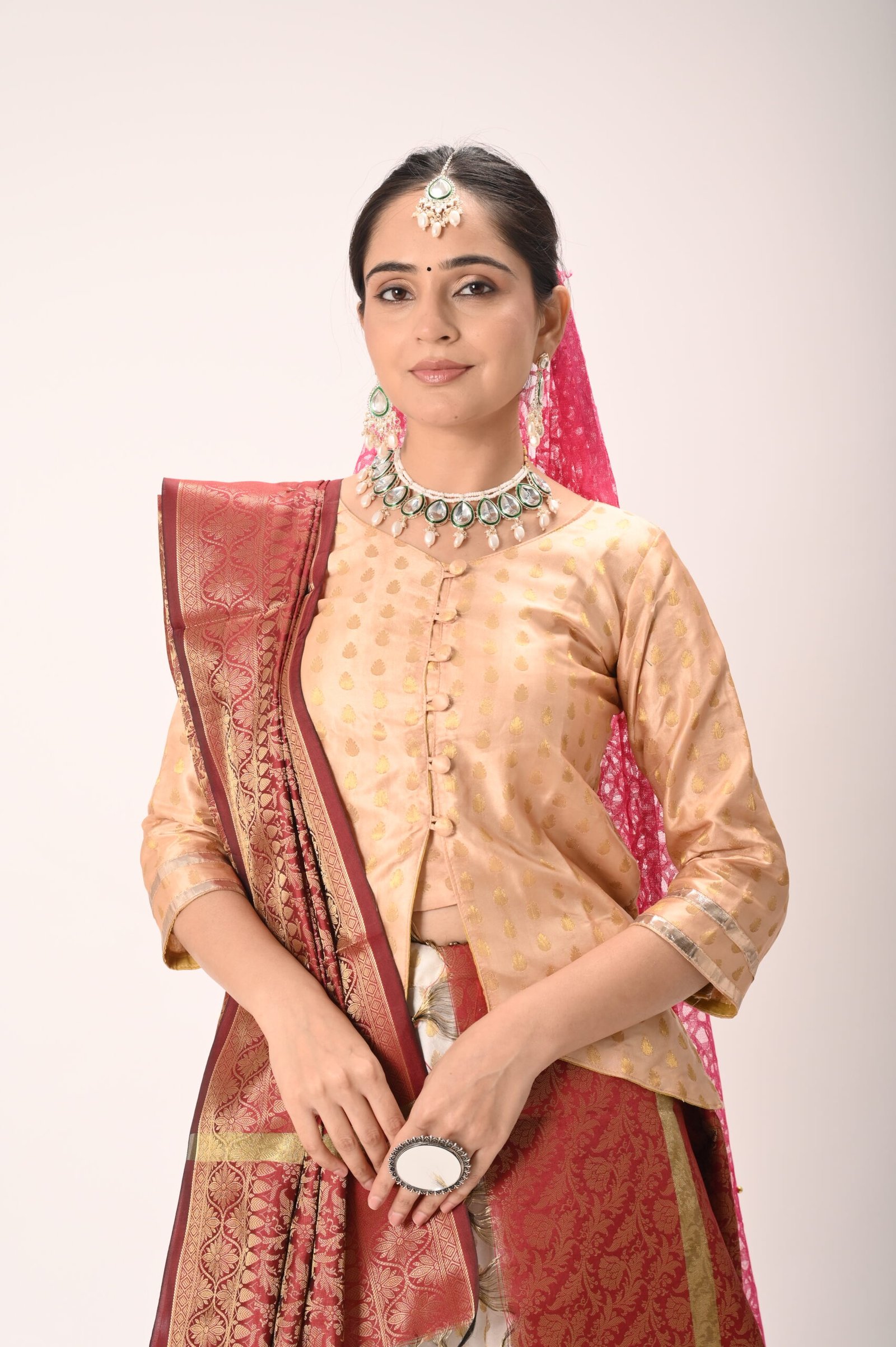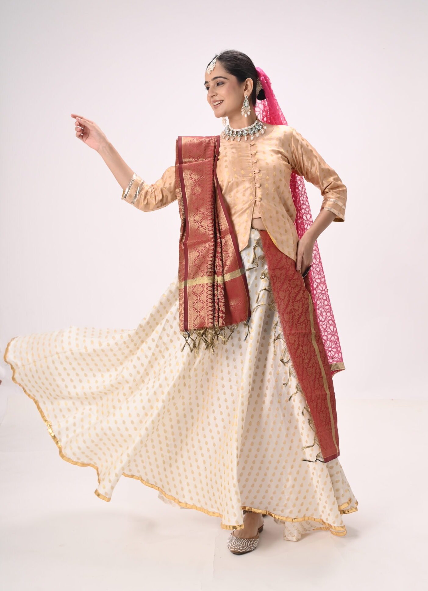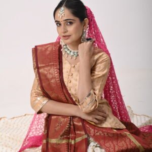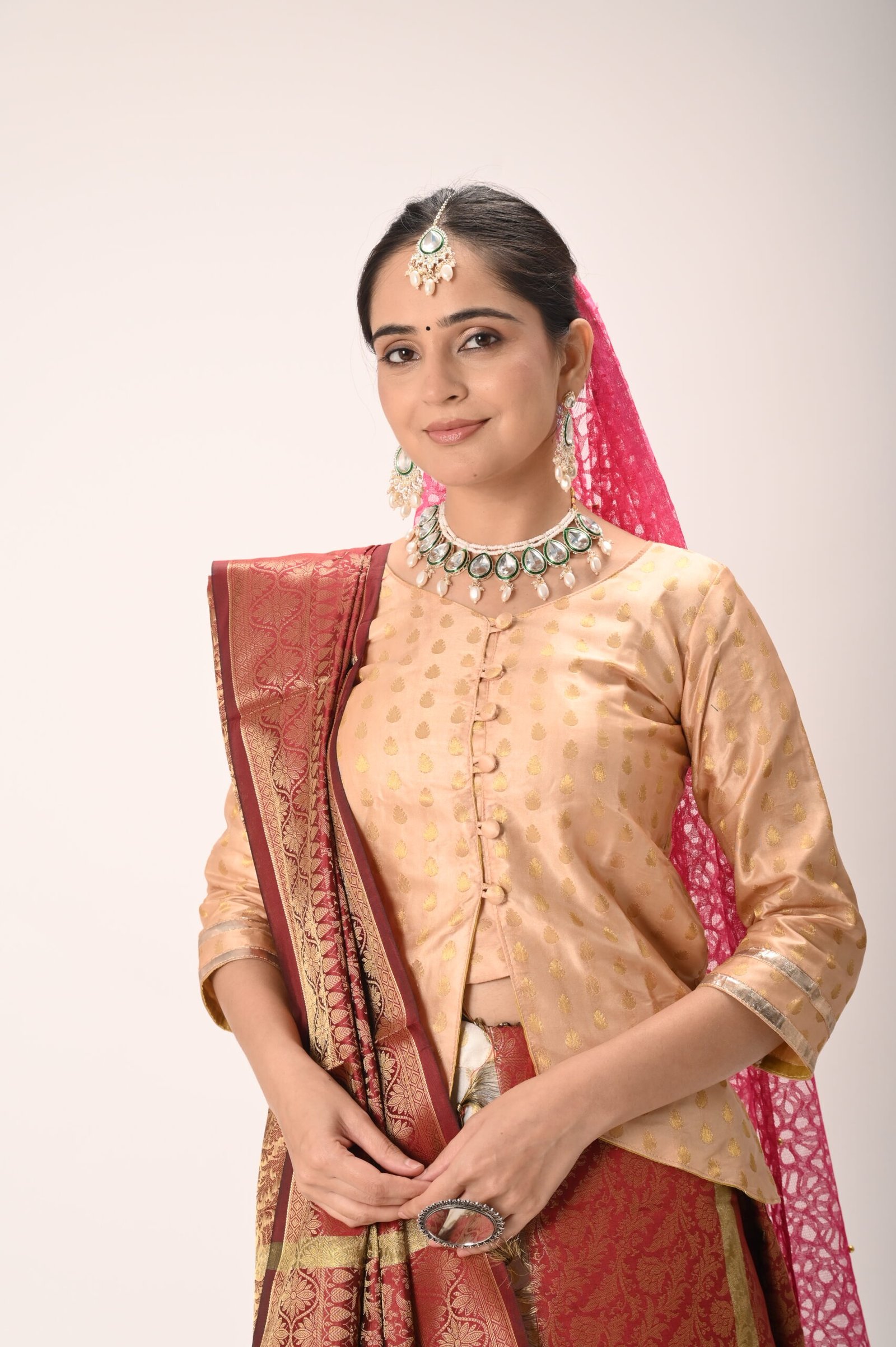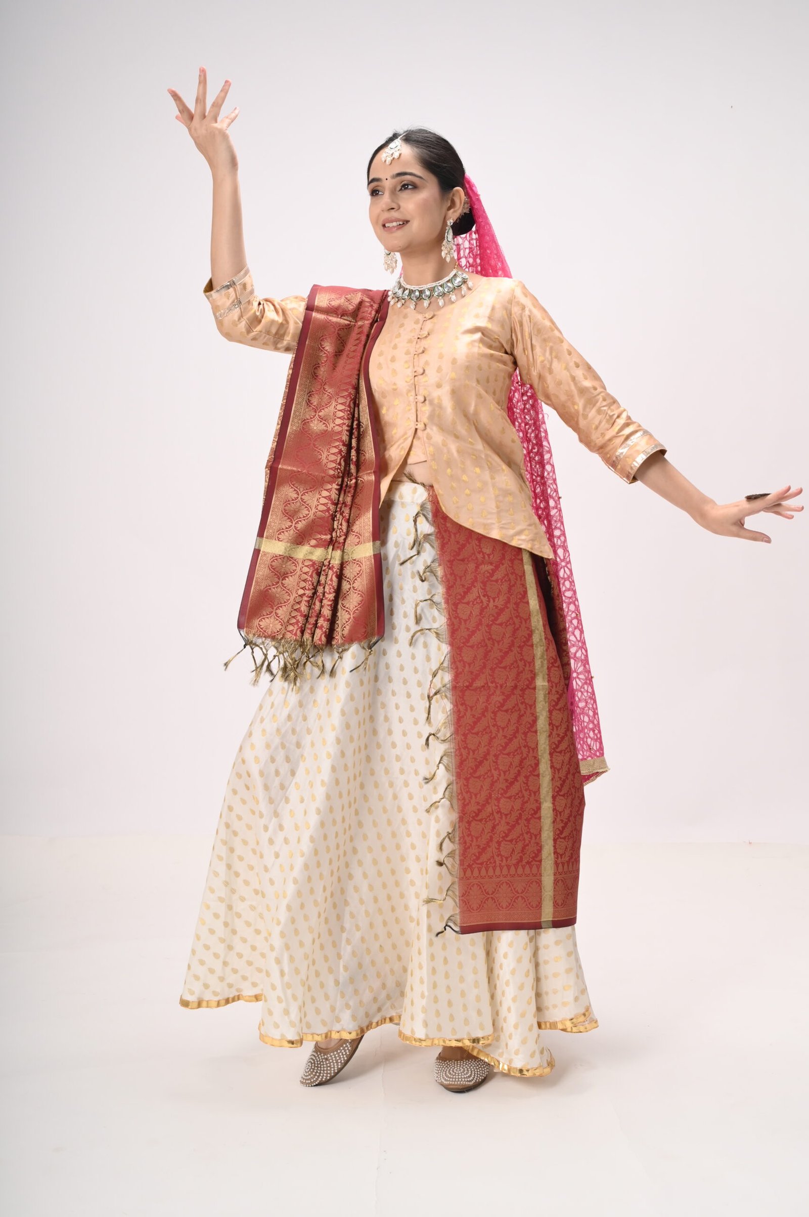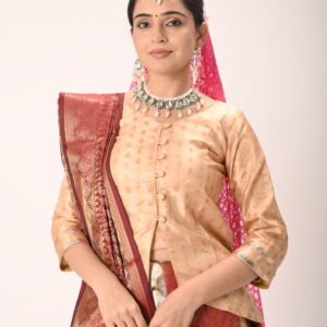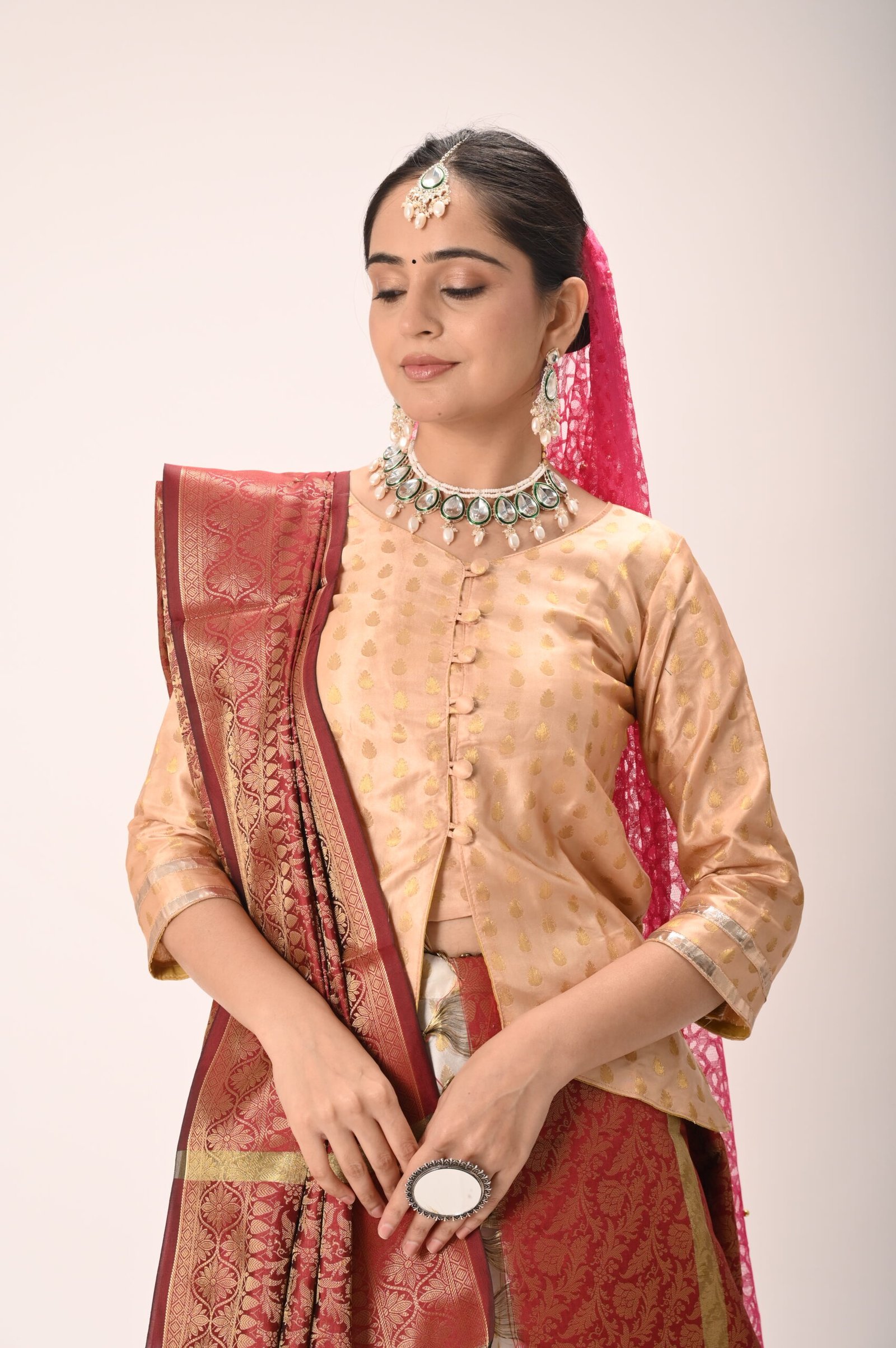 Beige-Gold Banarasi Lehenga Set with Maroon Dupatta & Pink Net Veil