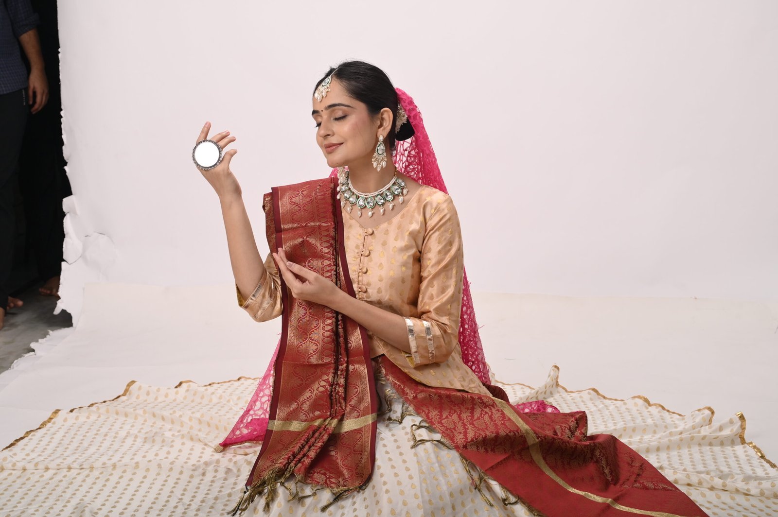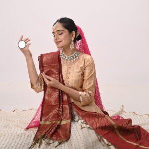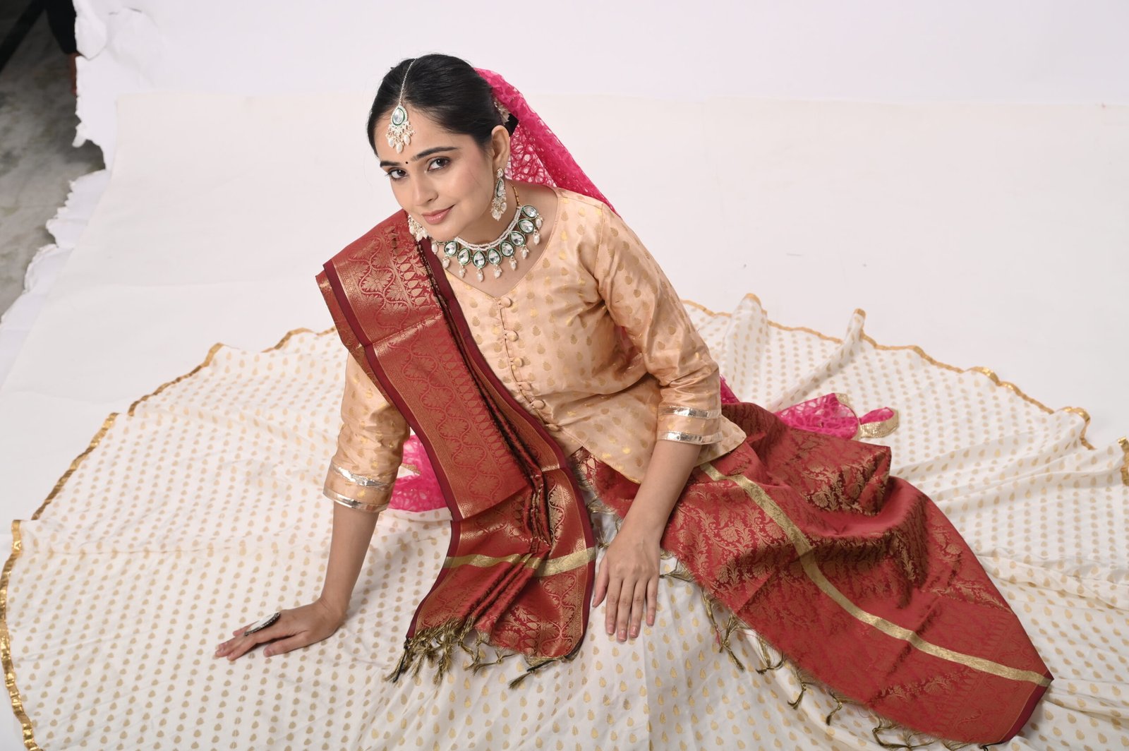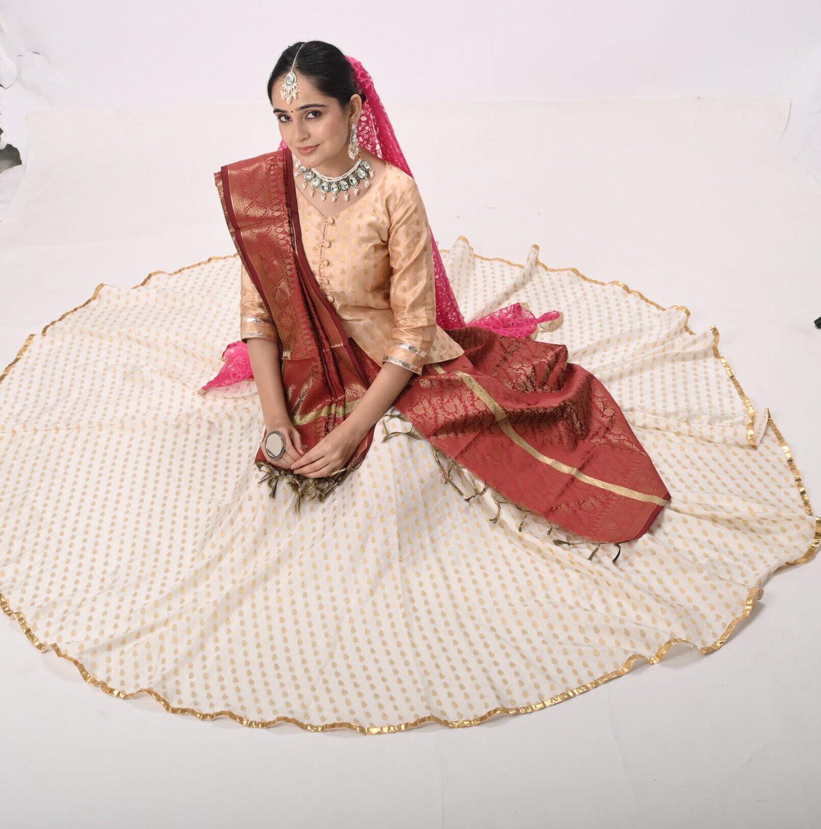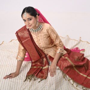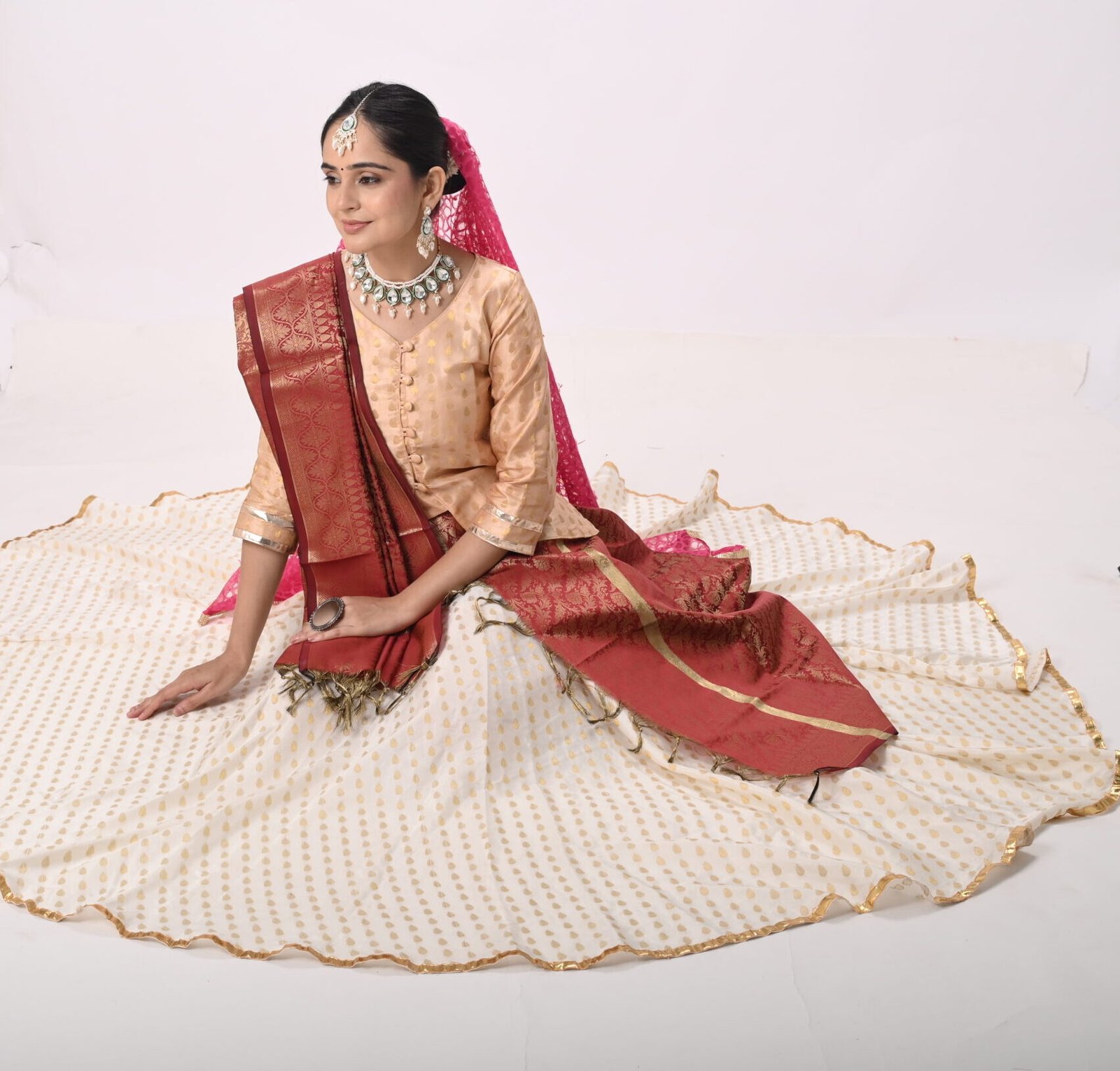 Beige-Gold Banarasi Lehenga Set with Maroon Dupatta & Pink Net Veil