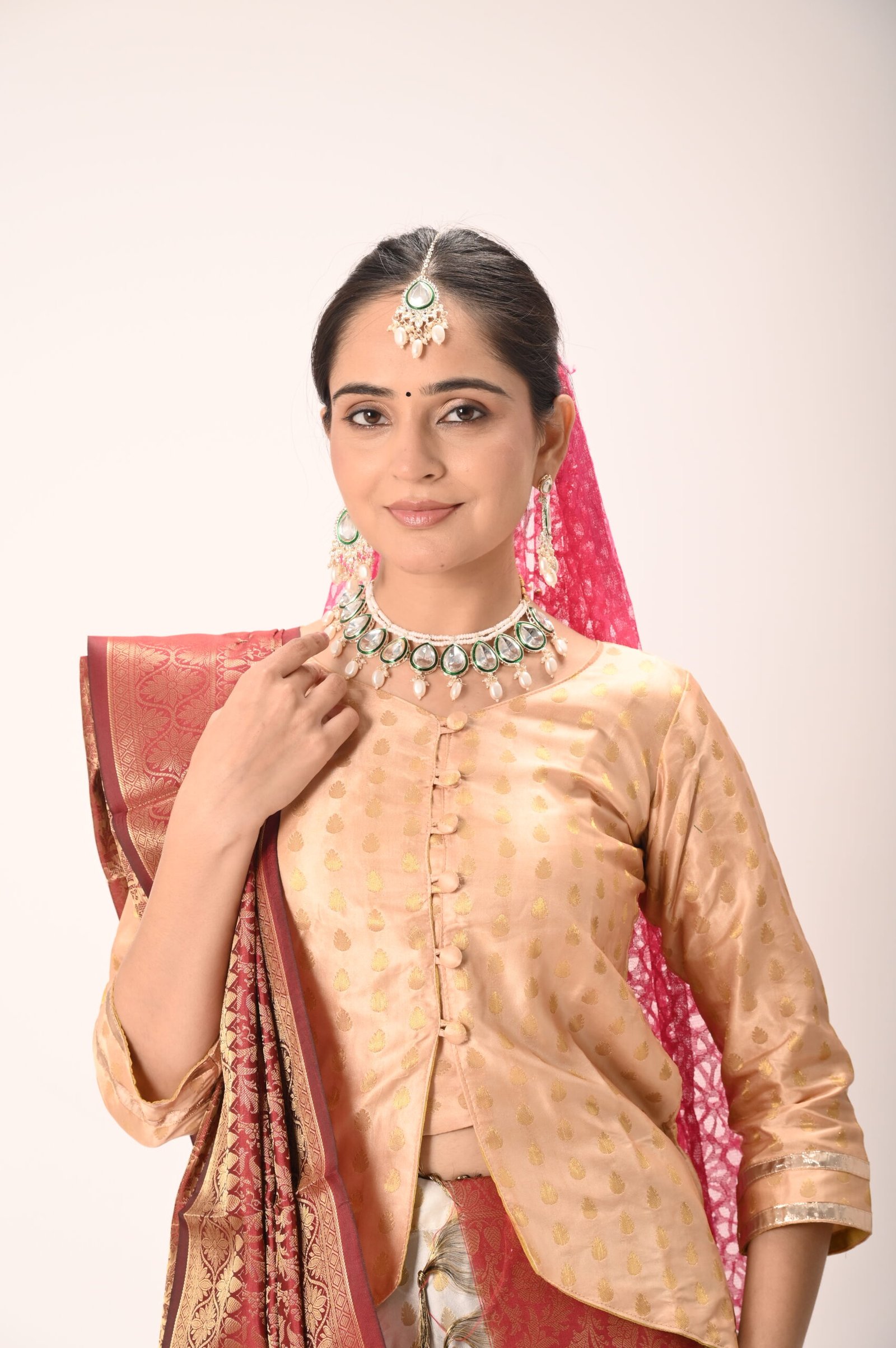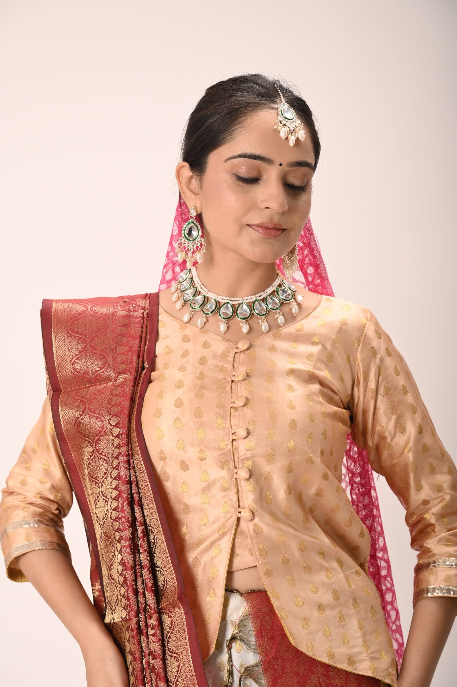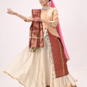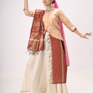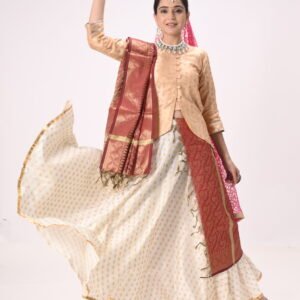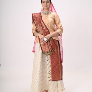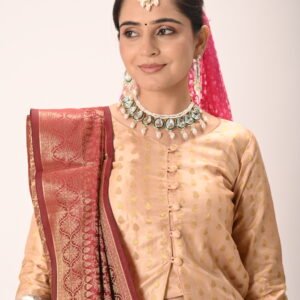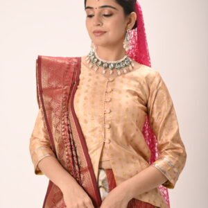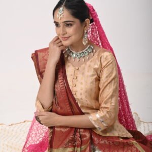 At the heart of this masterpiece lies the opulent Banarasi fabric, cherished for its luxurious texture and intricate motifs. The delicate beige-gold color palette exudes sophistication, making it suitable for both daytime events and evening soirees. Traditional zari weaves are artfully paired with floral patterns, showcasing impeccable artistry and elevating your look with a majestic touch. Crafted for women who appreciate a blend of heritage and fashion-forward design, this lehenga brings a balance of tradition and modernity.