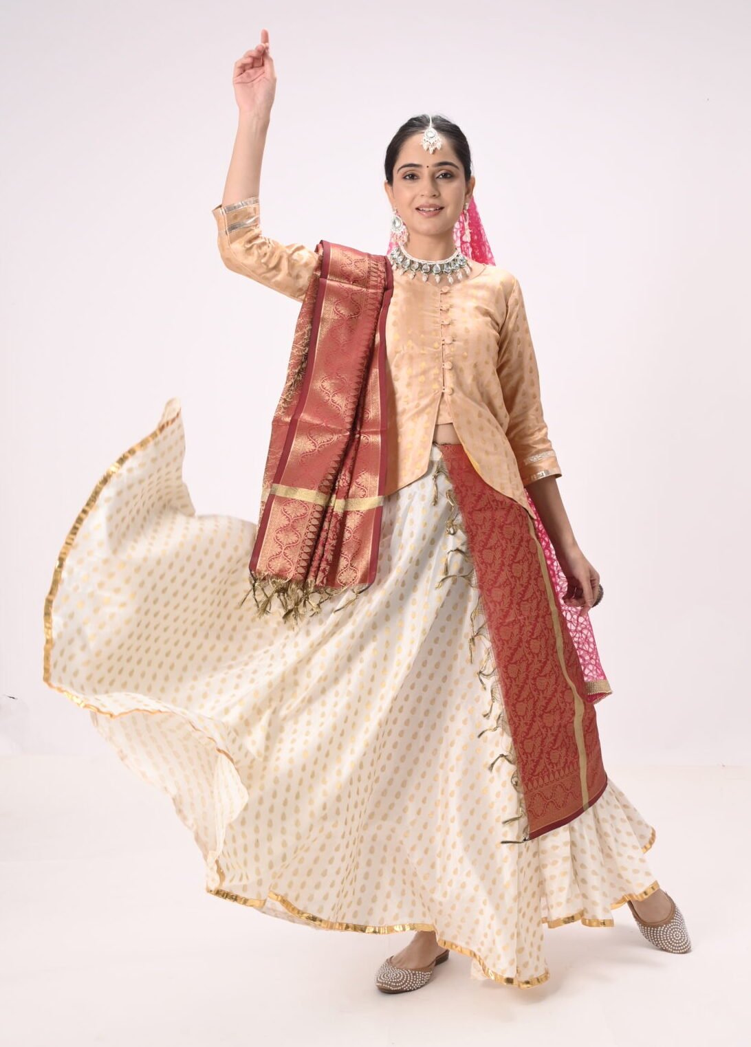 Designed for both style and comfort, the Royal Beige-Gold Banarasi Anarkali Lehenga features a figure-flattering silhouette that complements all body types. The lightweight yet durable fabric ensures all-day ease, while the flowy Anarkali cut offers unmatched grace and movement. Pair this ensemble with statement jewelry and matching accessories to complete your royal look without overcomplicating your wardrobe choices.